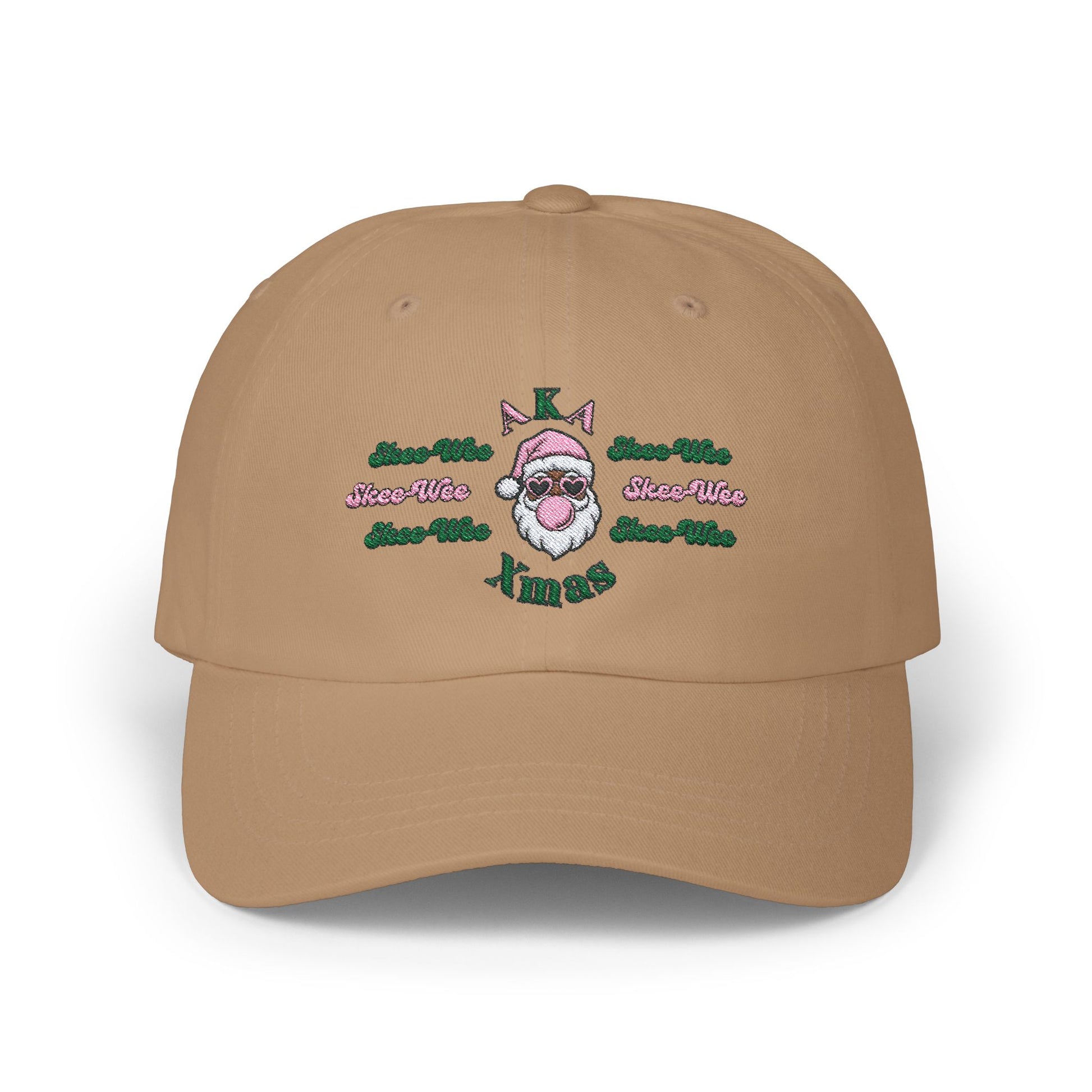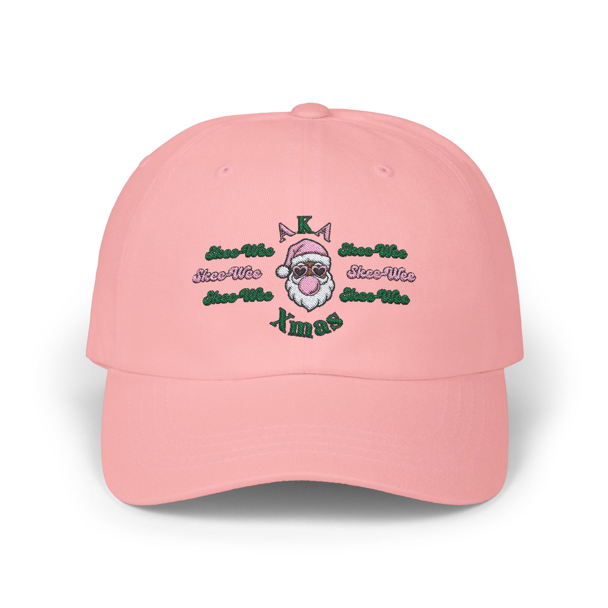 Represent your AKA Sorority pride this Xmas with this cute yet stylish custom design Dad Cap! Our design features the iconic Pink&Green color as well as the signature "Skee-Wee" phrase. The classic dad cap is a timeless accessory crafted for both style and comfort. Made from 100% cotton (Green Camo variant: 65% polyester / 35% cotton), this cap offers a soft and breathable feel that's perfect for all-day wear. Its unstructured design and low-profile fit give it a laid-back vibe, while the antique brass buckle closure adds a touch of vintage charm. The matching undervisor and four-row stitching on the visor provide subtle yet stylish details. With six panels and a Permacurv® visor, this cap offers a perfect blend of durability and classic aesthetics. This cap comes in 7 color choices. Happy Holidays!