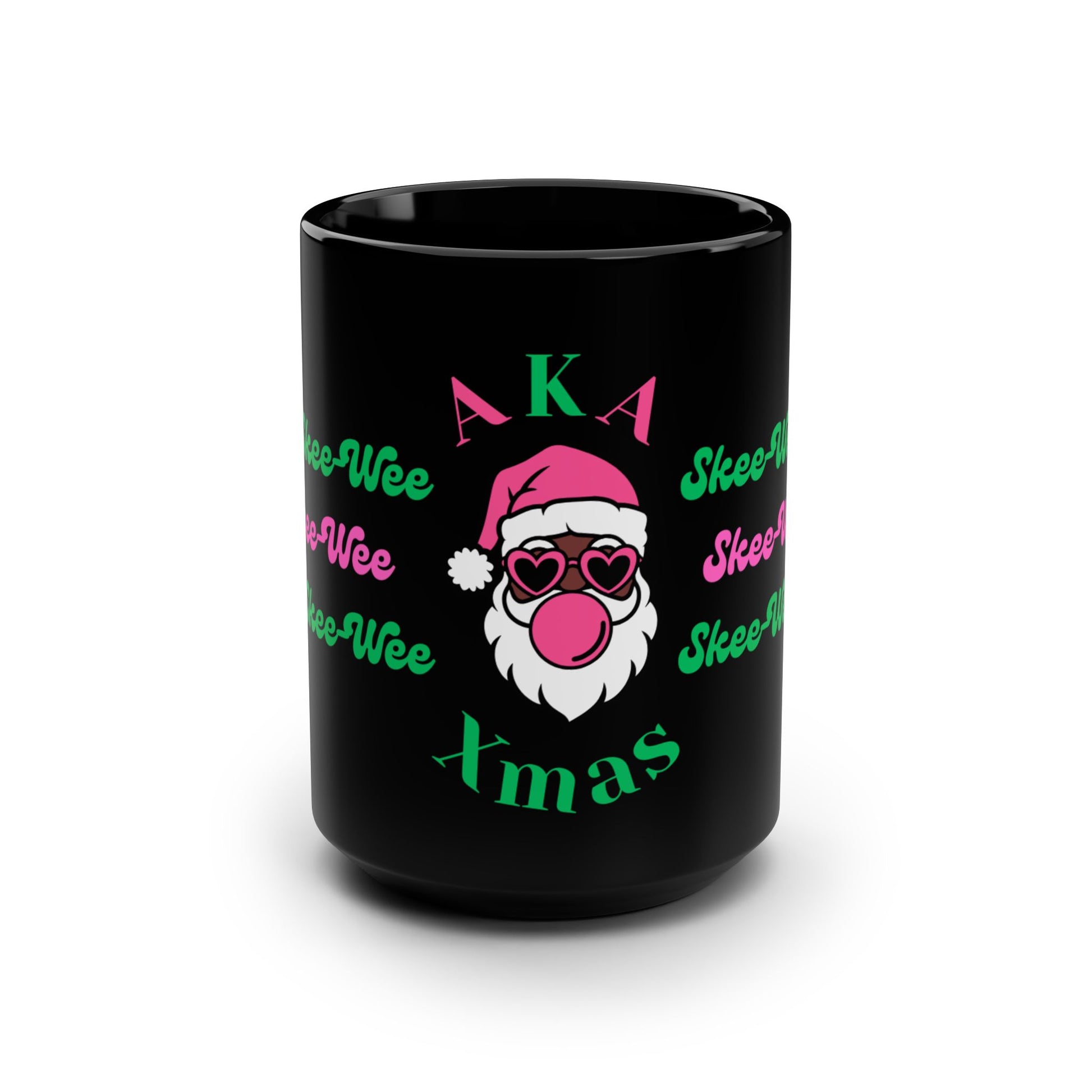 Represent your AKA Sorority pride this Xmas with this cute yet classy, bubble gum popping Santa! Our custom designed, 15 oz black ceramic mug features the iconic Pink & Green colors, Greek Alpha-Kappa-Alpha letters AND the signature "Skee-Wee" phrase. This particular mug comes in one size yet has plenty of room for morning caffeine boosts and hot cups of tea on a rainy day. They're easy to grip and feel sturdy thanks to the C-shaped handle. Happy Holidays!