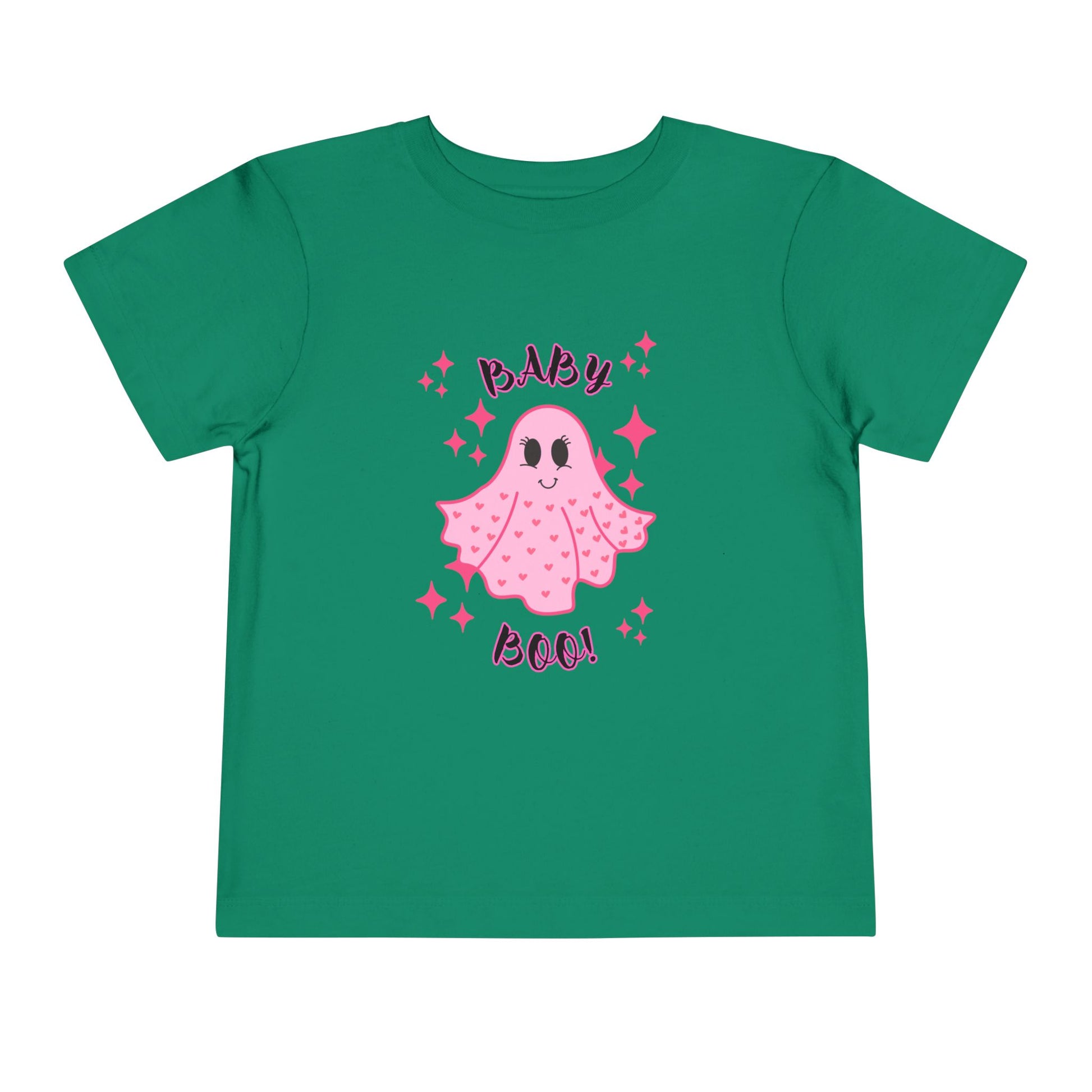 Get our adorable custom designed "Baby Boo- Starry" toddler T-shirt in a Pink design for your little one and get them into the Halloween spirit! This particular design features an adorable baby ghost wearing a pink sheet sprinkled with stars. This cotton T-shirt is custom designed and comes in 8 different color choices. Happy Halloween!