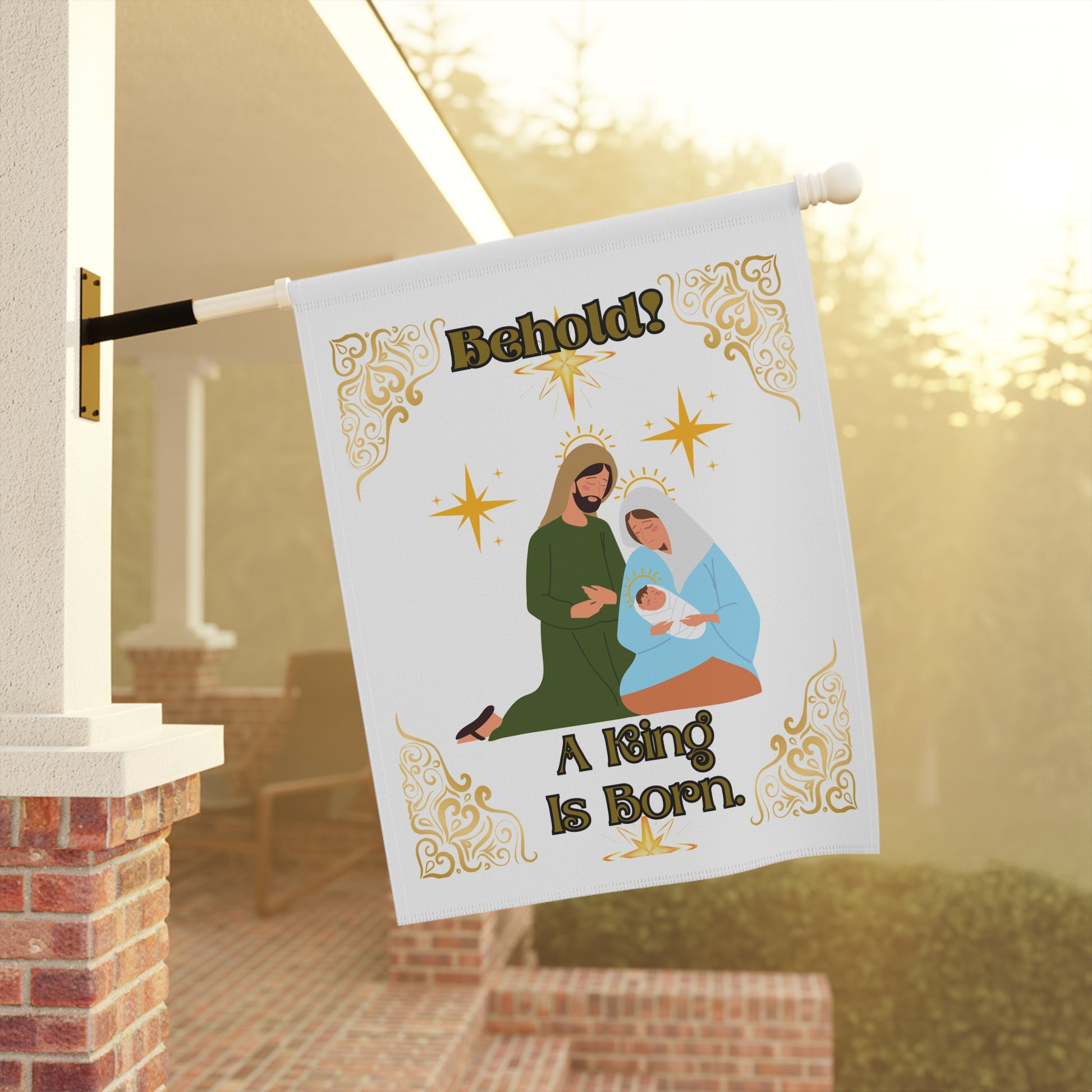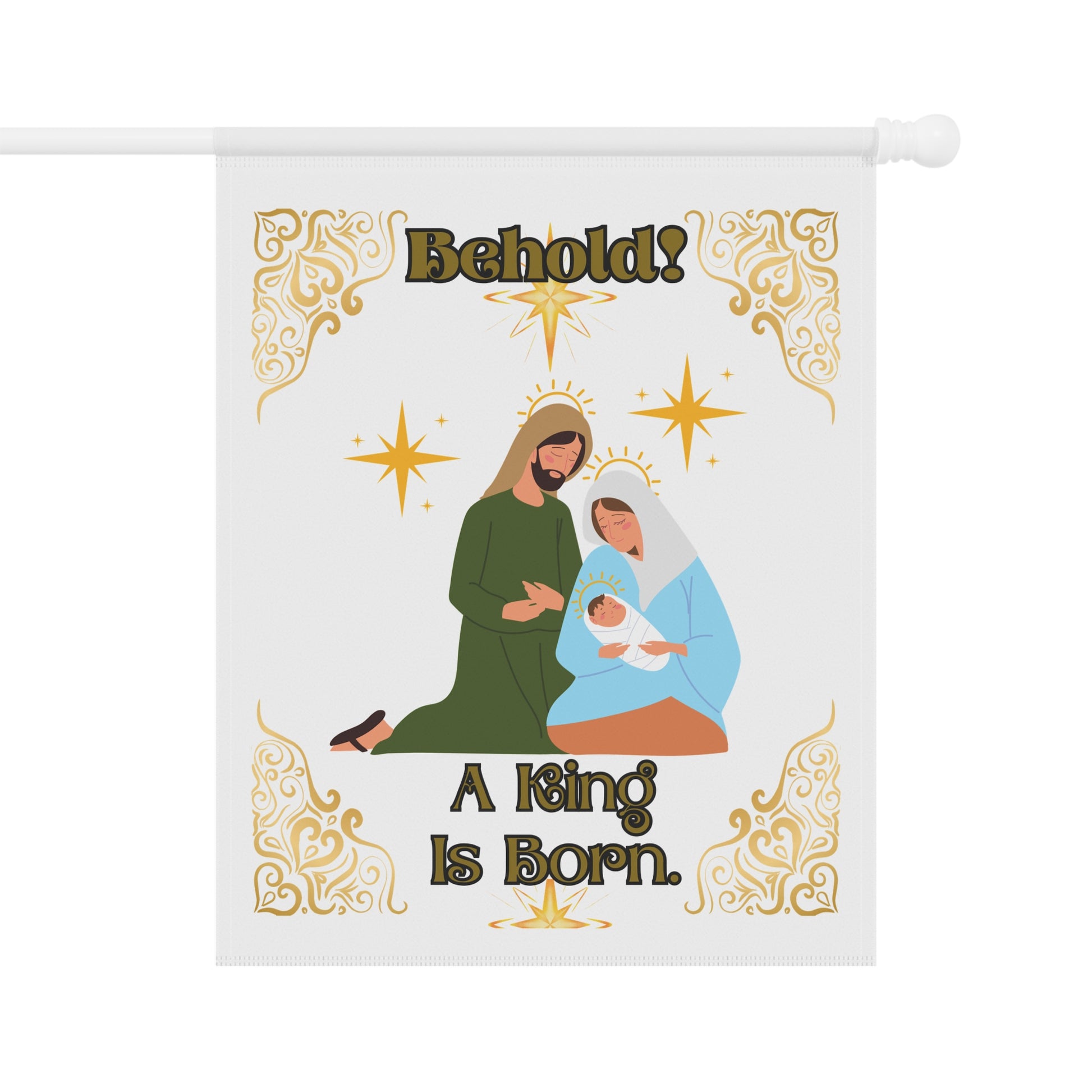 Get our custom designed "Behold A King Is Born" House Banner/Flag to help decorate and share your sentiment for the Christmas Season. Made with lightweight yet highly durable poly poplin-canvas fabric, this particular banner comes in size 24.5'' × 32'' and features a top sleeve for easy placement on poles. This design is printed in crisp detail and color on both sides of the flag. Check our store for different color variants of this same design. Happy Holidays!