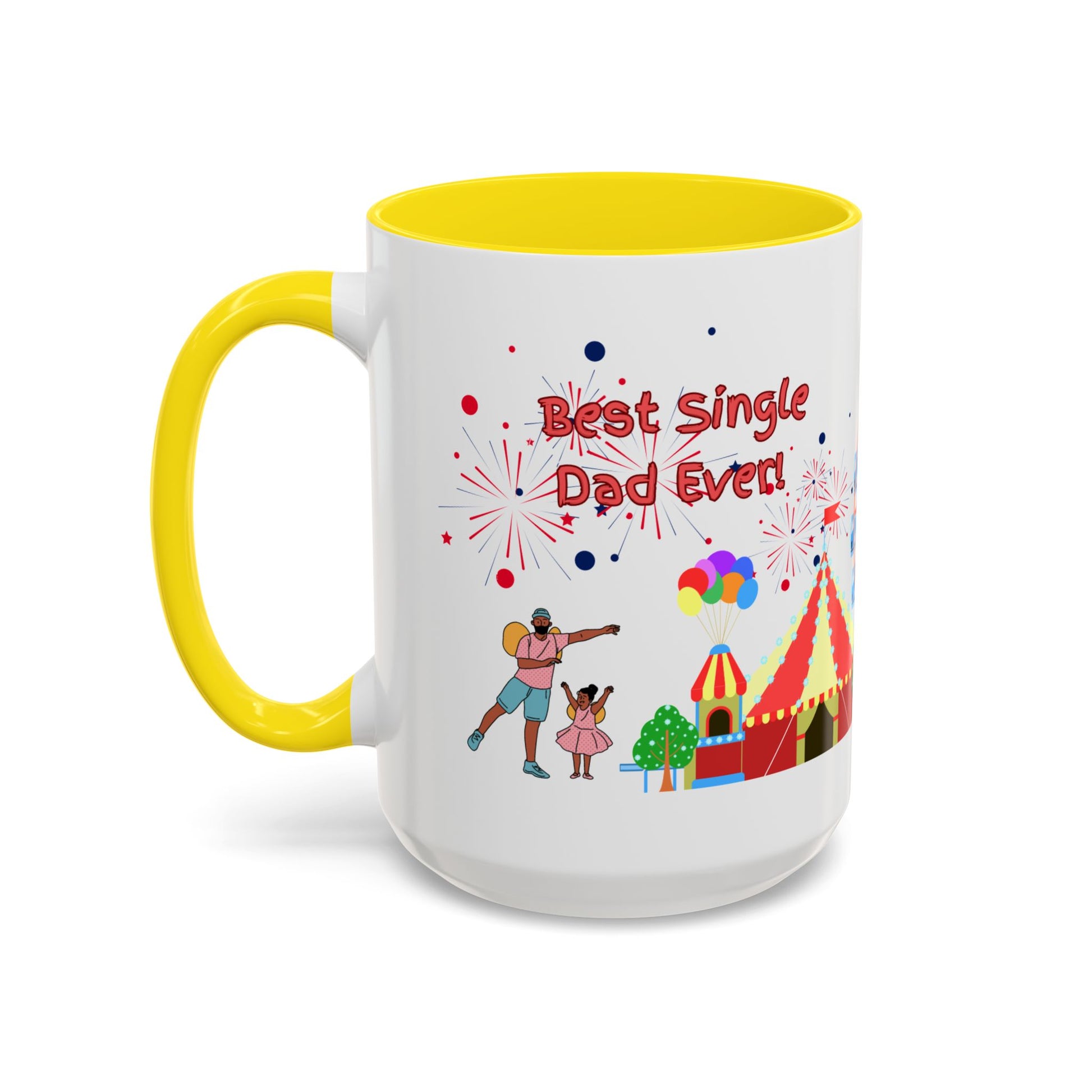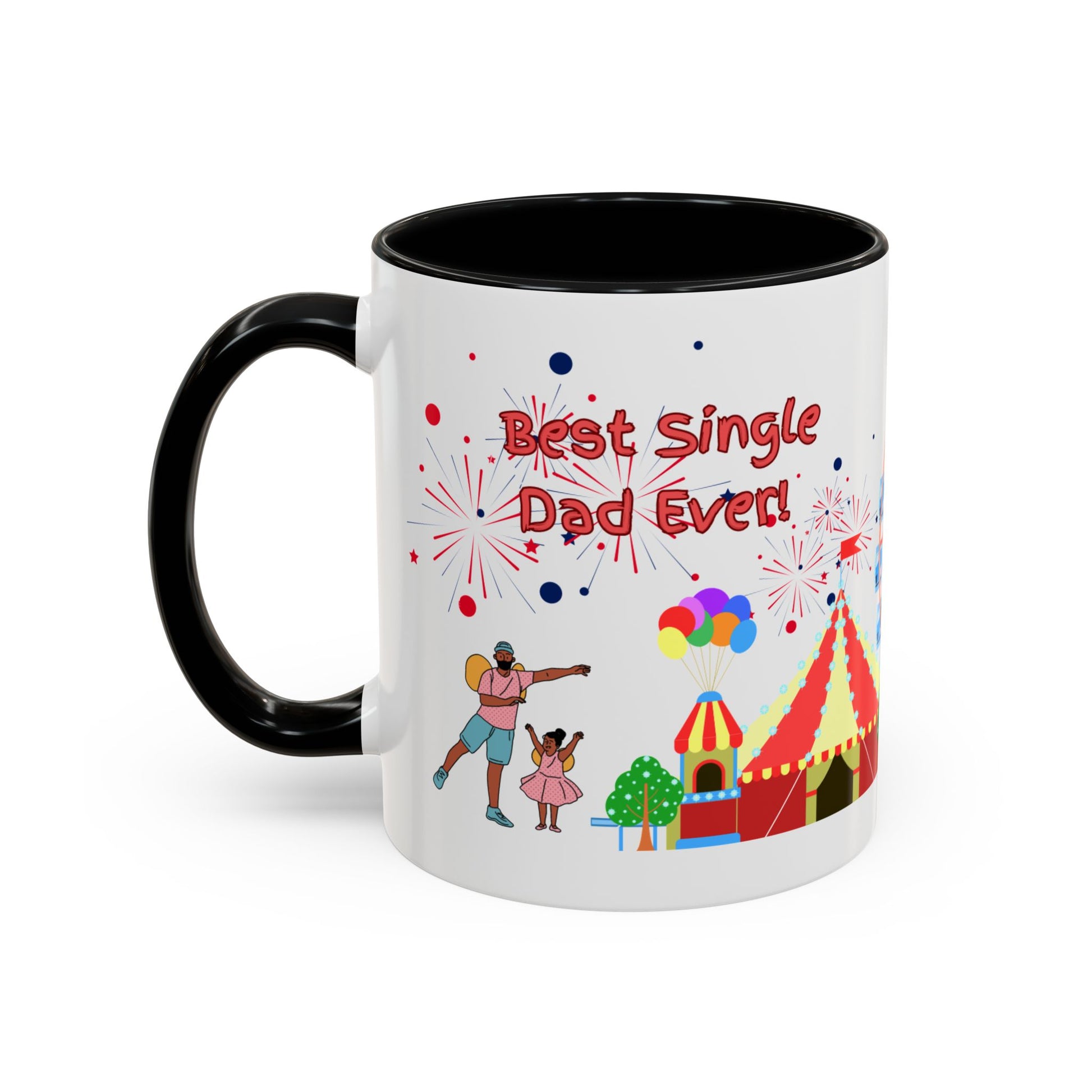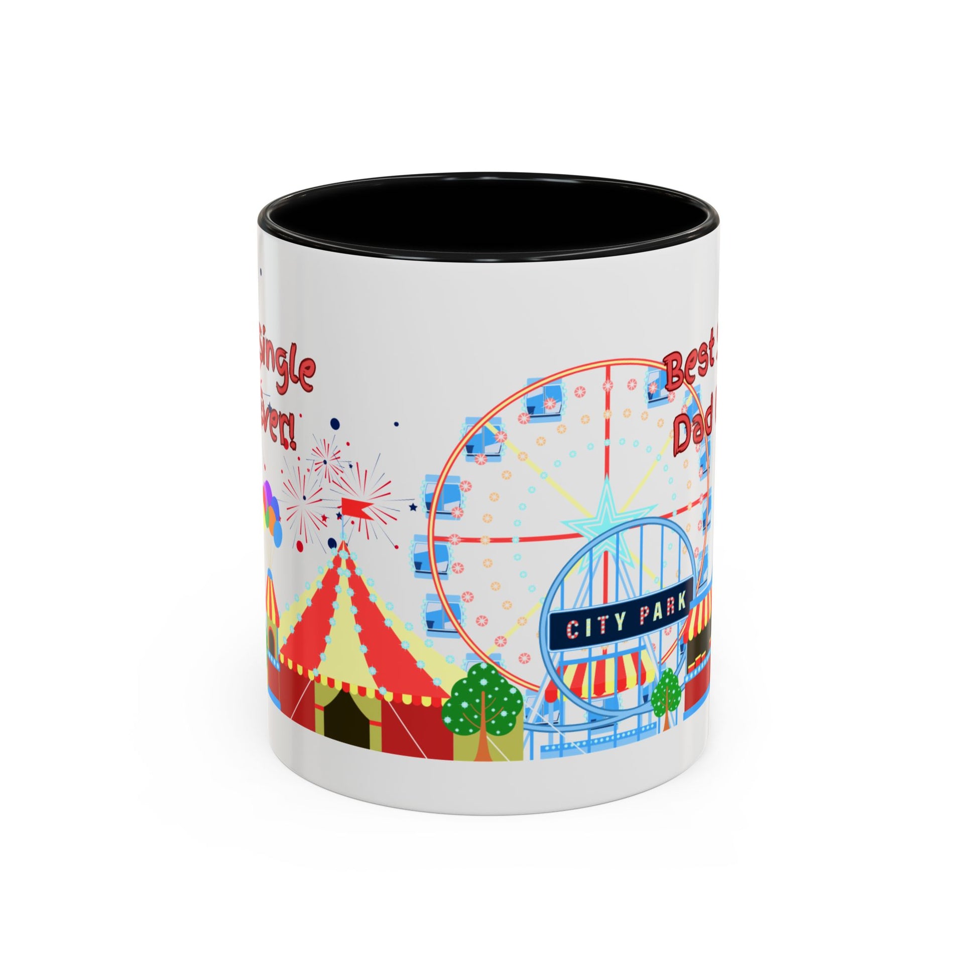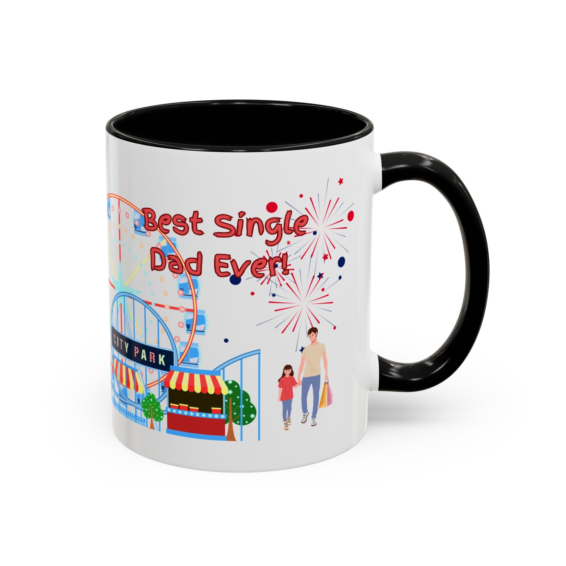 "Best Single Dad Ever" White Ceramic Coffee Mug With Colorful Accents — Amusement Park Family Design in 11oz and 15oz sizes