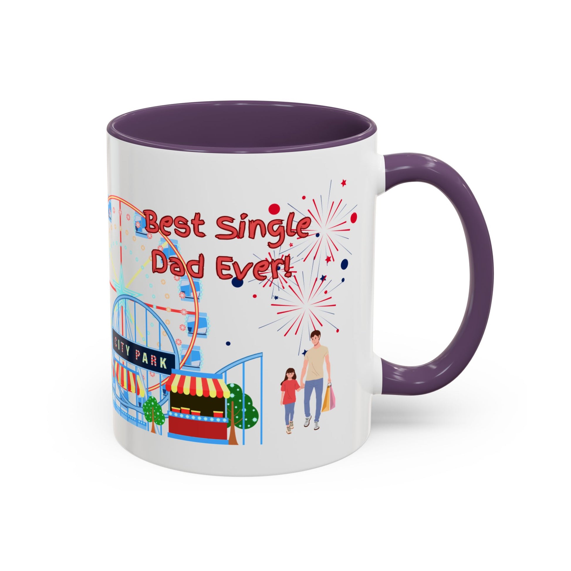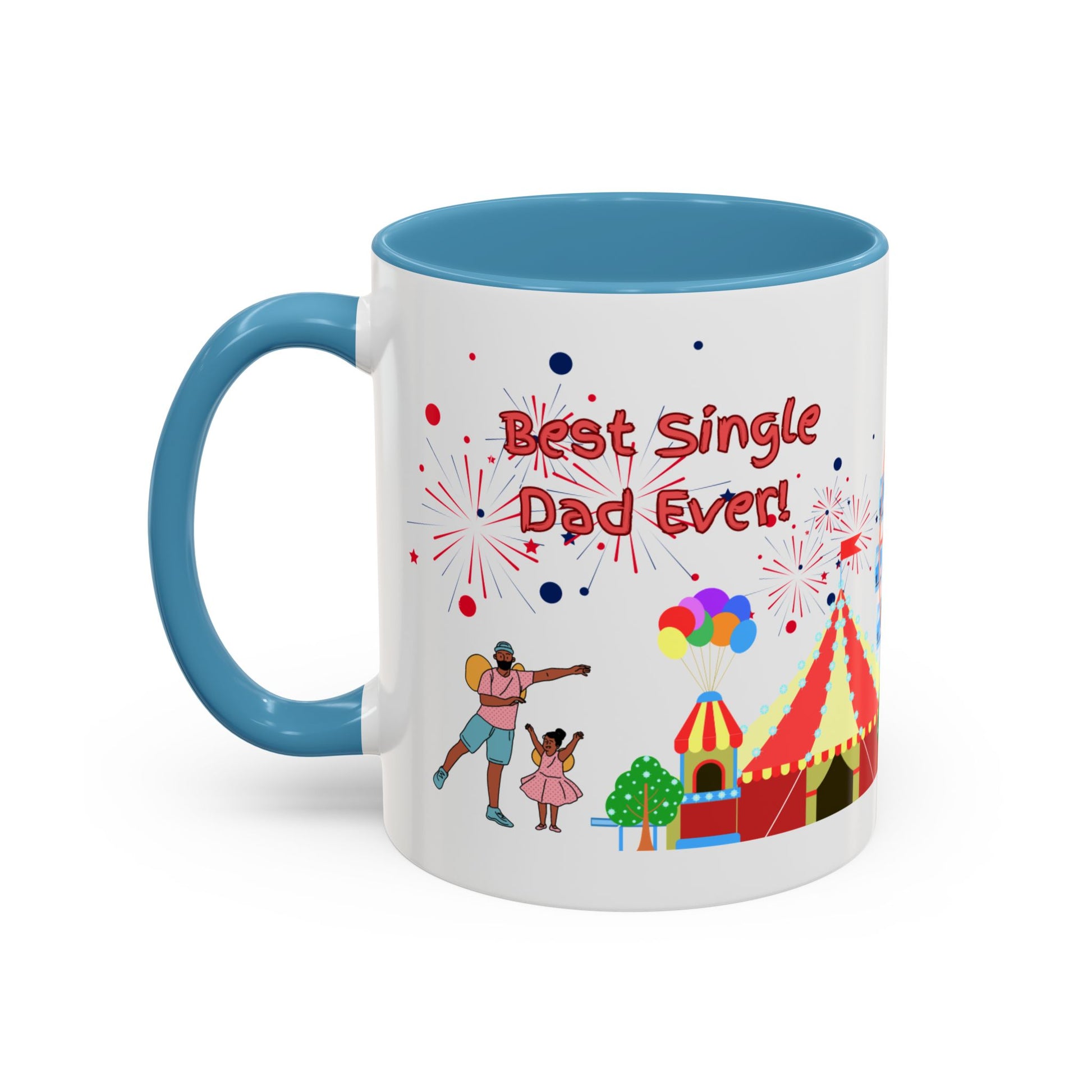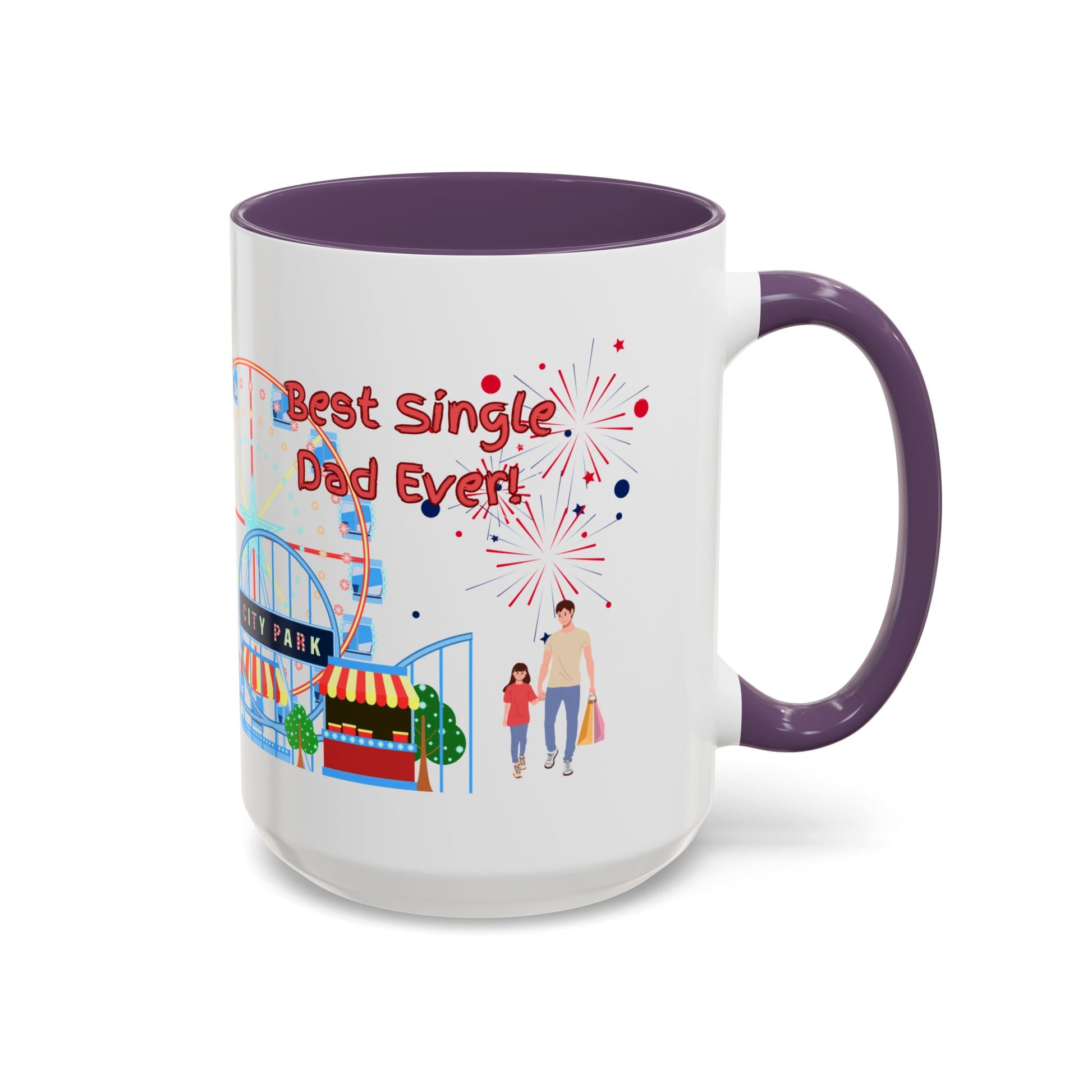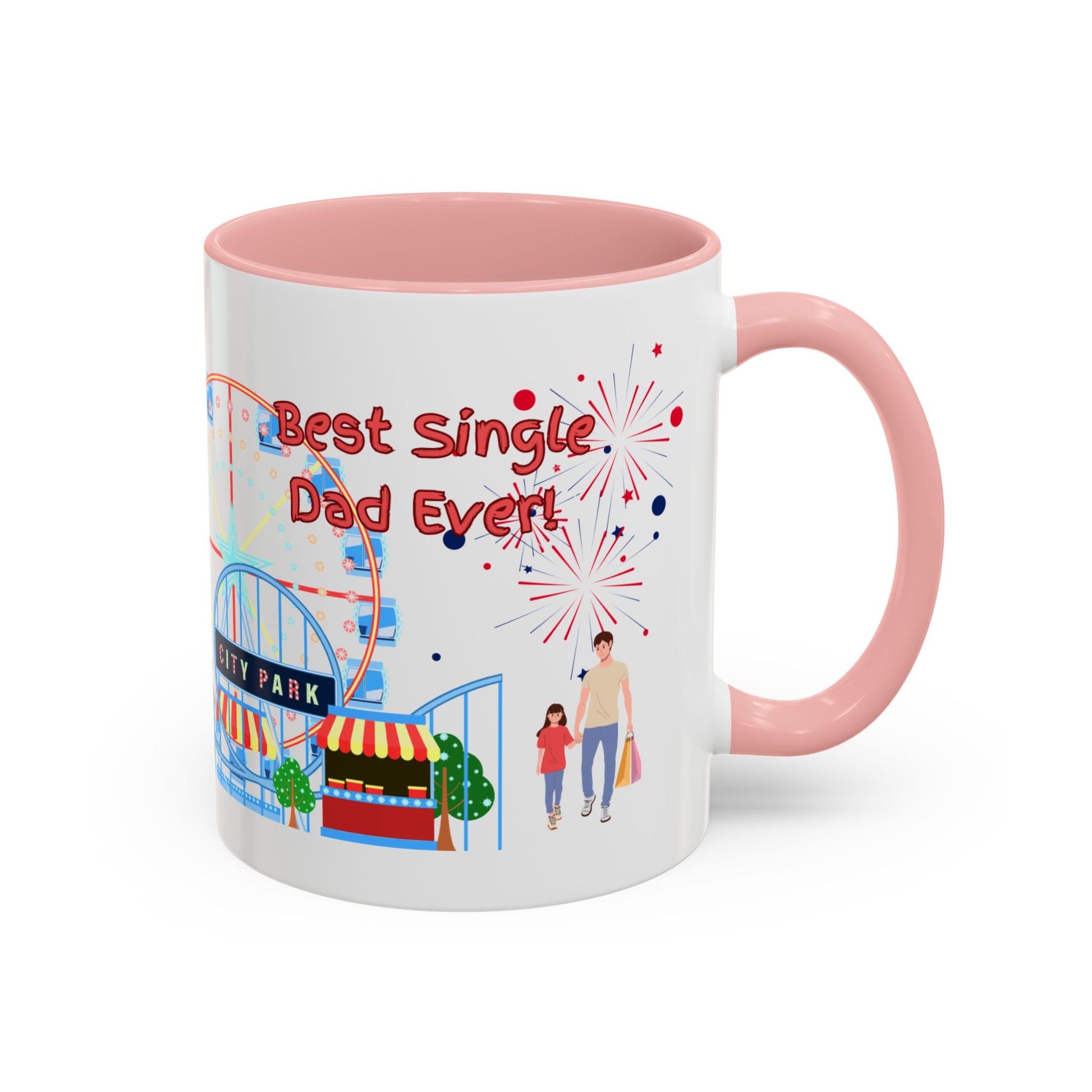 "Best Single Dad Ever" White Ceramic Coffee Mug With Colorful Accents — Amusement Park Family Design in 11oz and 15oz sizes