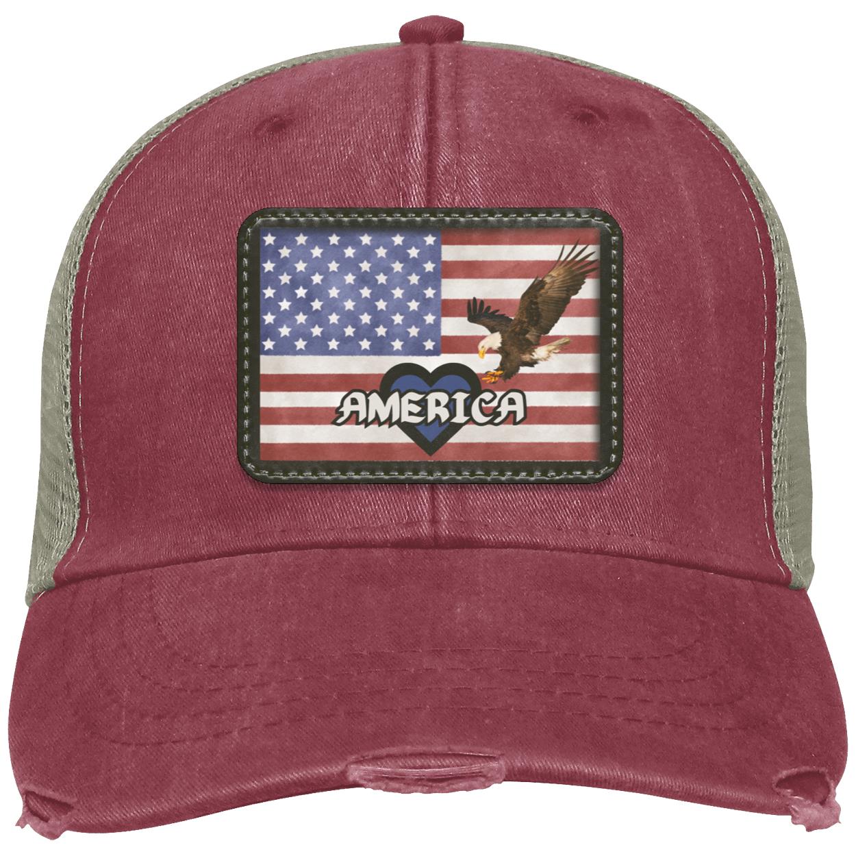 Presenting our new "Love America" custom designed, distressed trucker hats! Sure to get compliments, this version has a blue heart behind the word AMERICA along with our Stars N Stripes and the iconic American Eagle all printed on a rectangular vegan leather patch! This hat comes in 5 different colors to pick from. Please check our store for the same design/style hat with a red heart as well!.