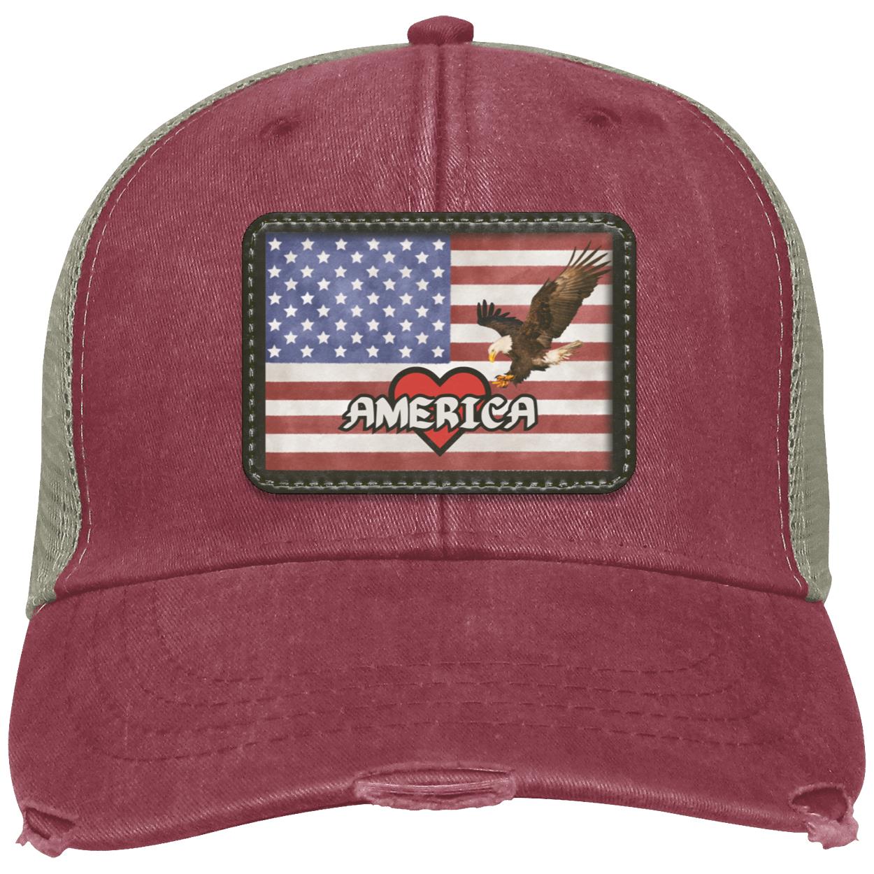 Presenting our new "Love America" custom designed, distressed trucker hats! Sure to get compliments, this version has a red heart behind the word AMERICA along with our Stars N Stripes and the iconic American Eagle all printed on a rectangular vegan leather patch! This hat comes in 5 different colors to pick from. Please check our store for the same design/style hat with a blue heart as well!.