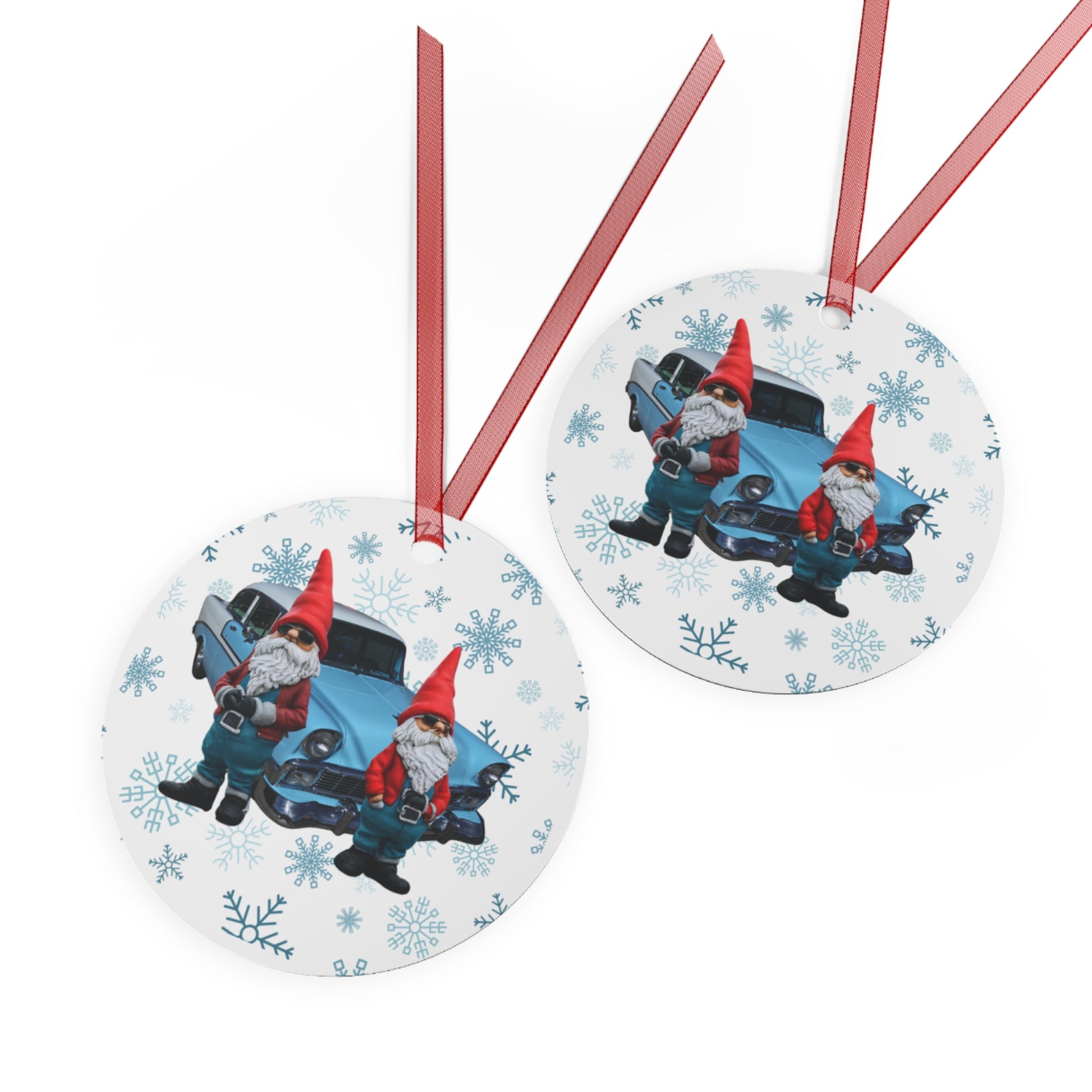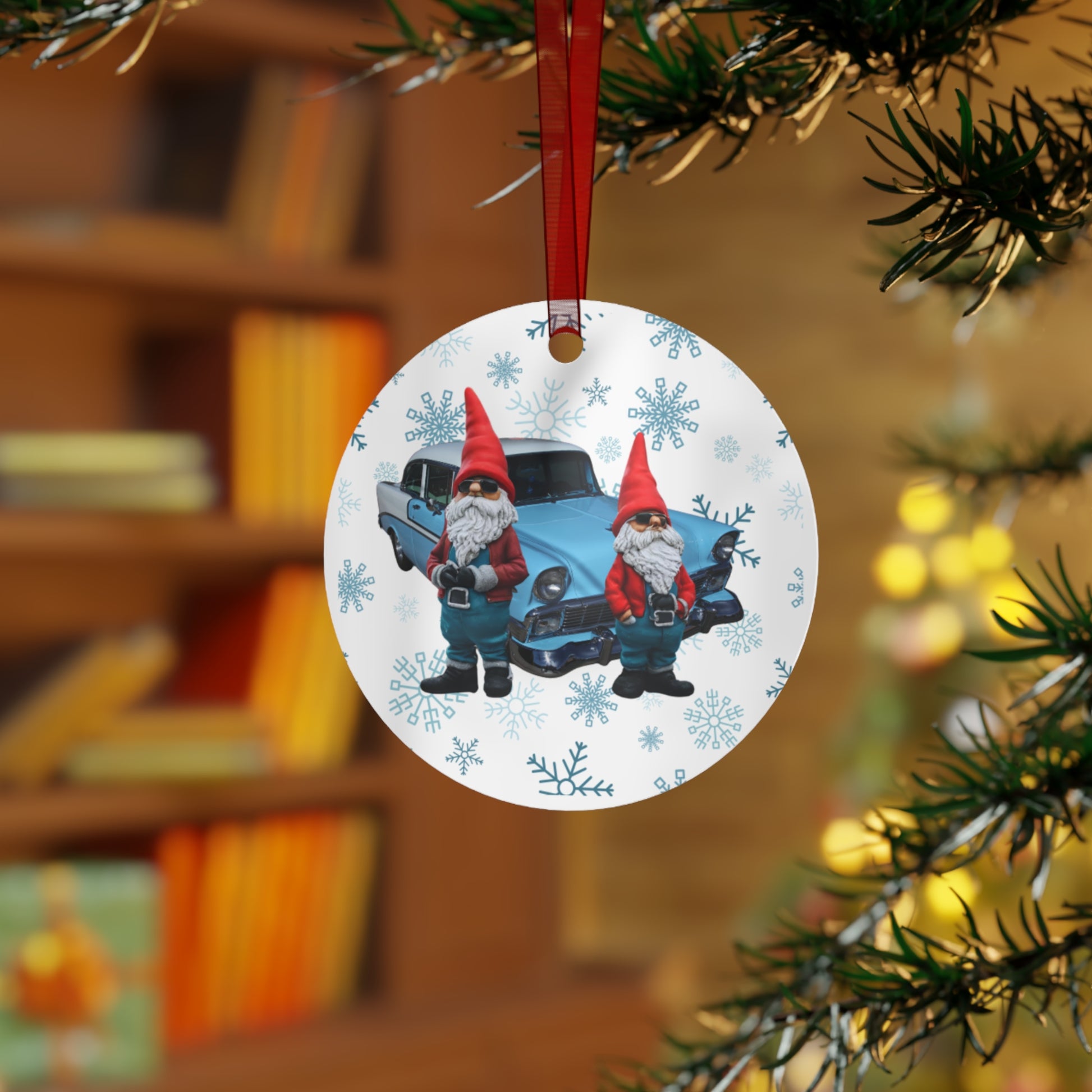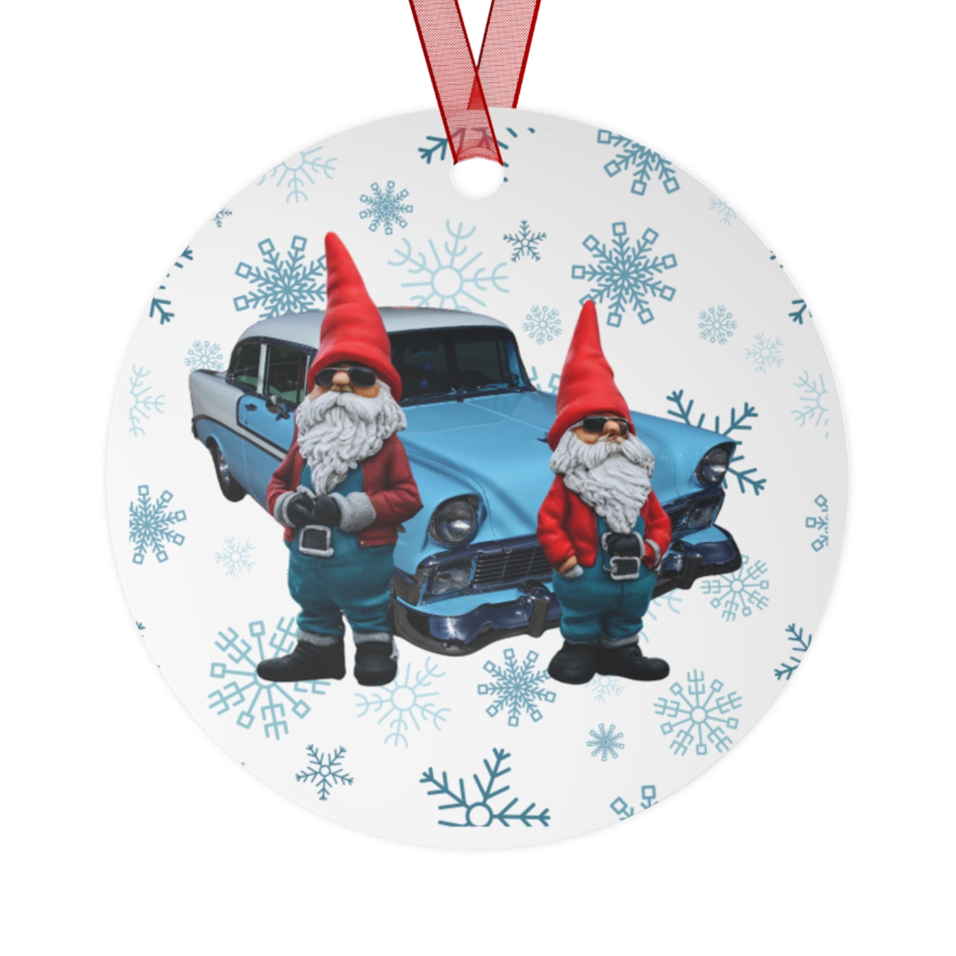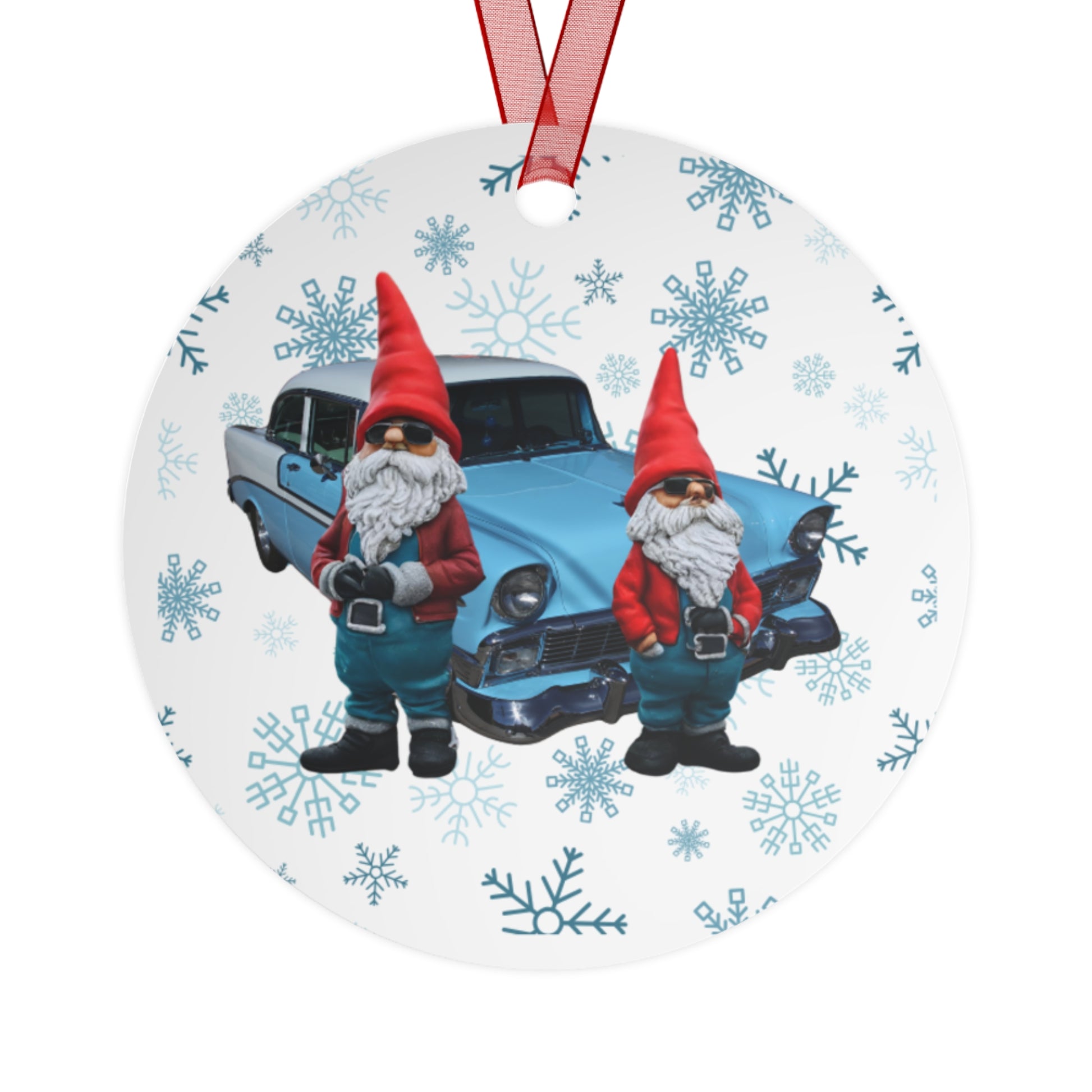 Let our custom designed "Cool Homeez" help bring in the Yuletide Season! Our custom designed, circular Christmas tree ornament is decorated with these cool Gnomes in front of their vintage ride surrounded by snowflakes. These aluminum based, metal ornaments are durable and will bring holiday cheer for years to come. The surface is scratch and chip-resistant, so they can be stored together in the famous Christmas decoration box. Note that there's one ornament per pack, and it already comes with a separate red ribbon for hanging. Happy Holidays!