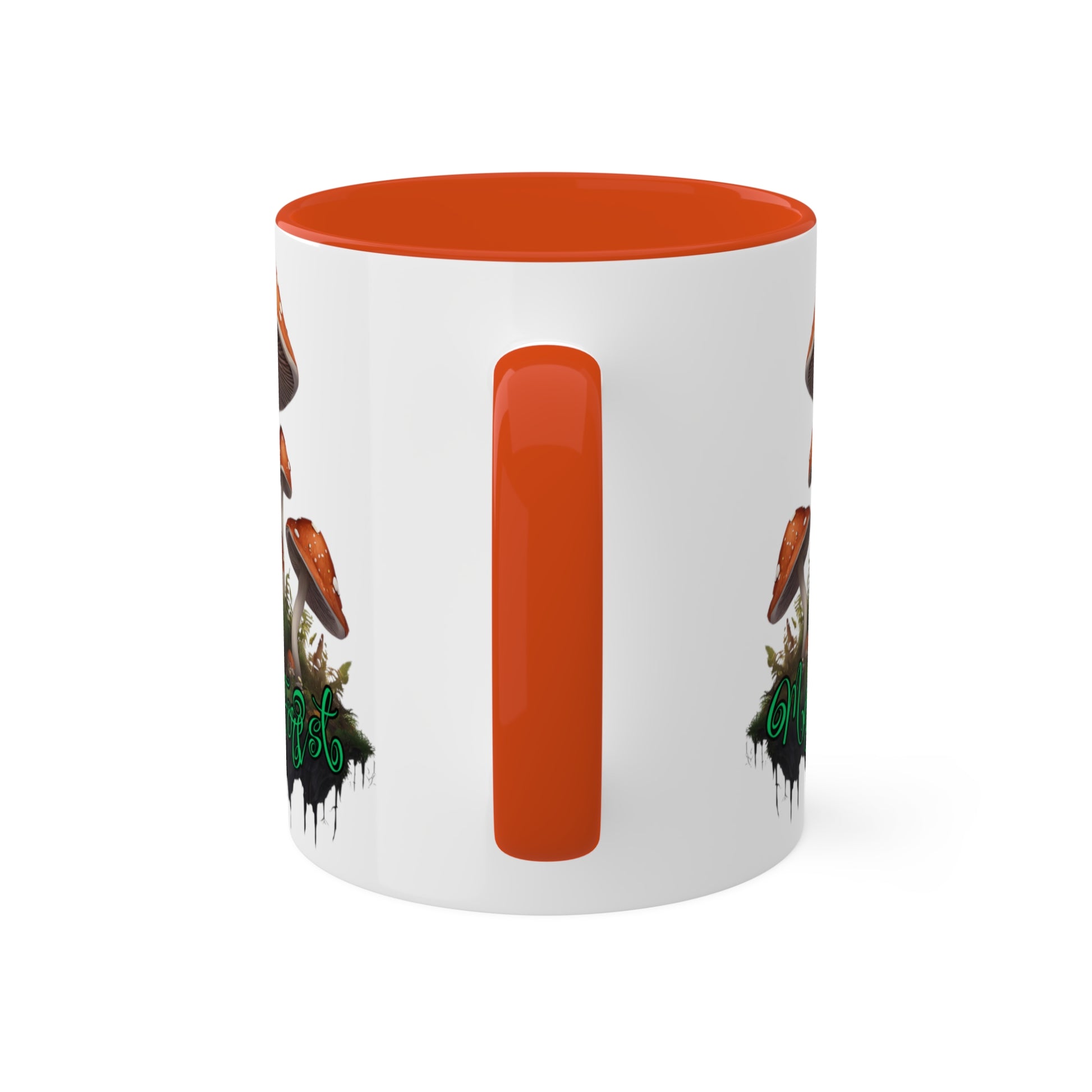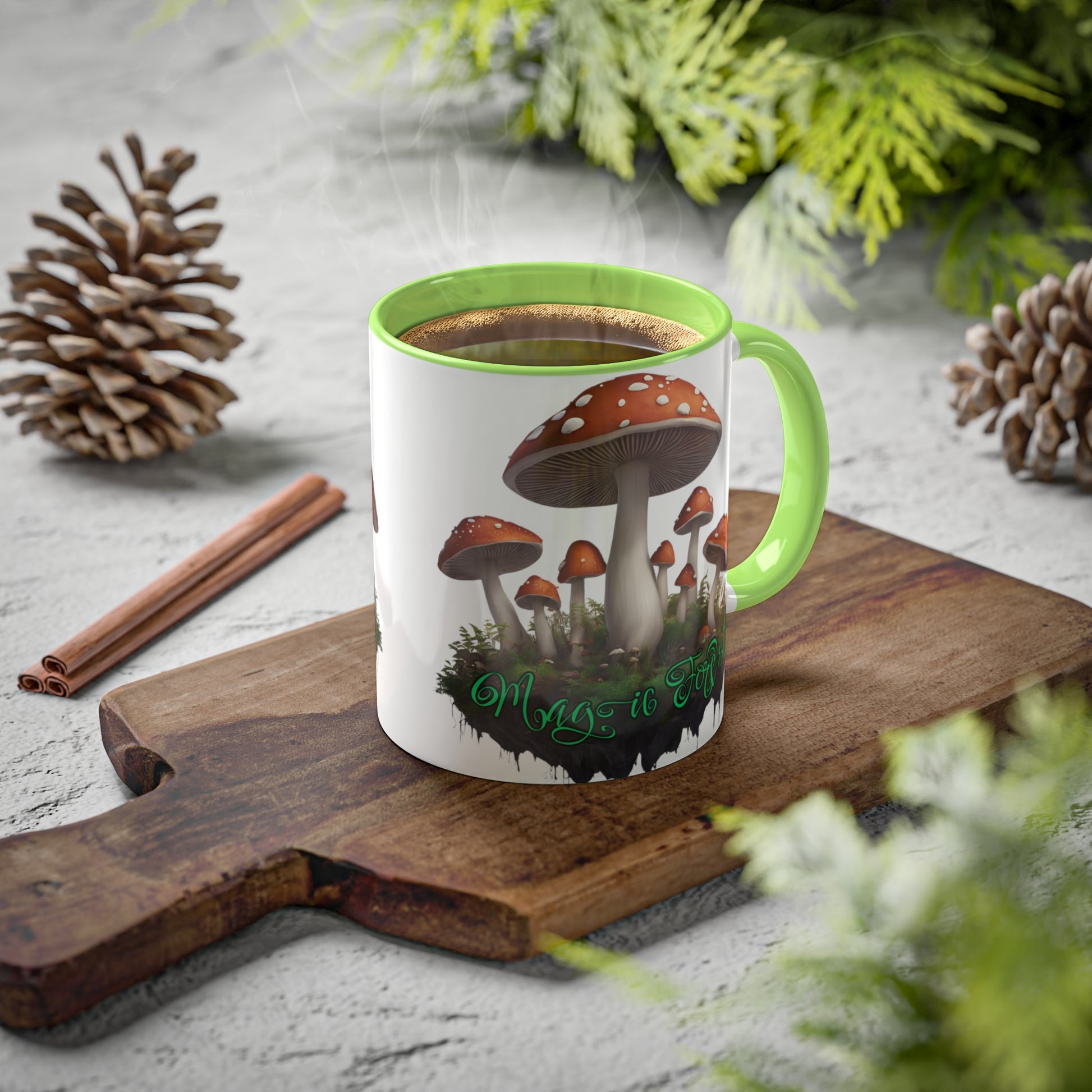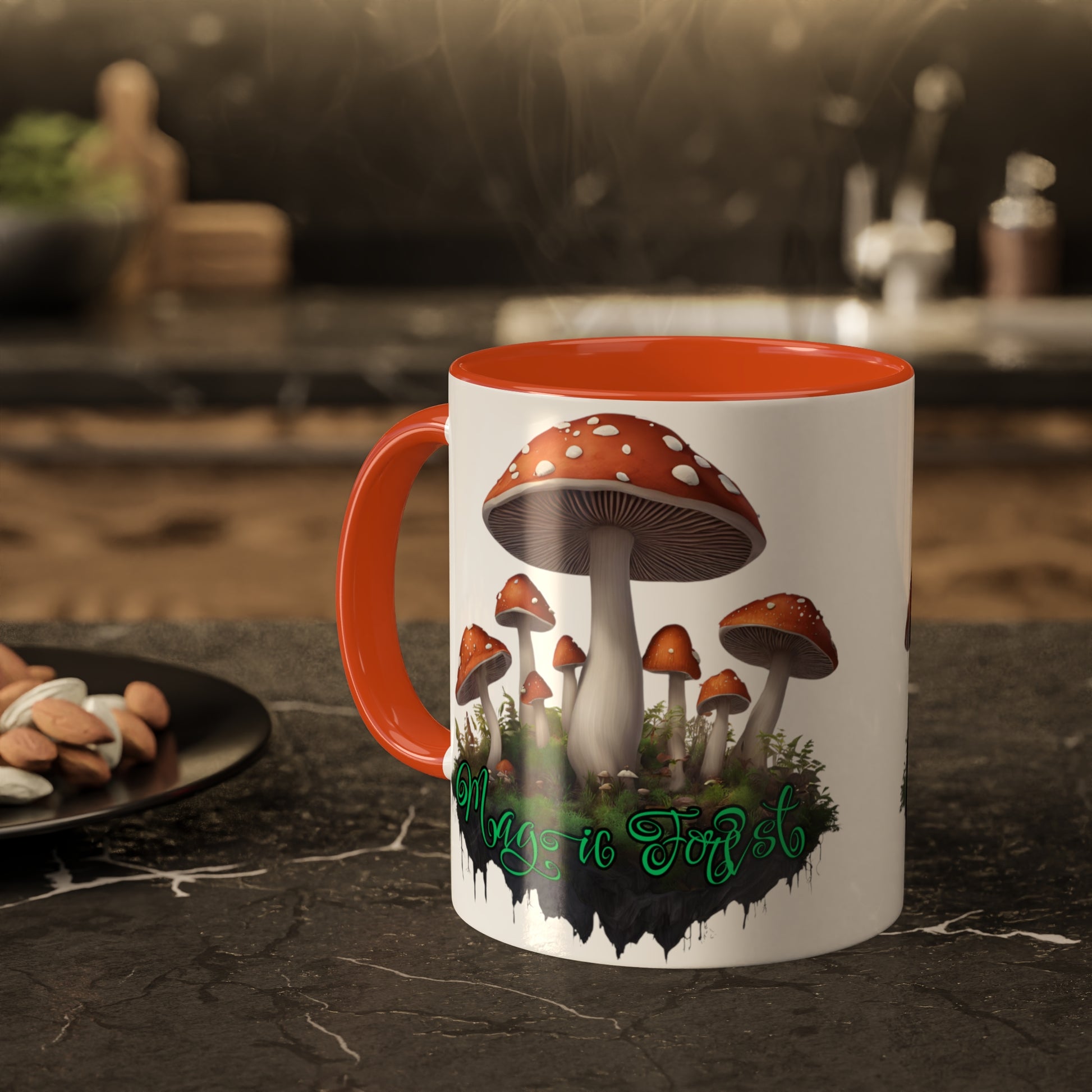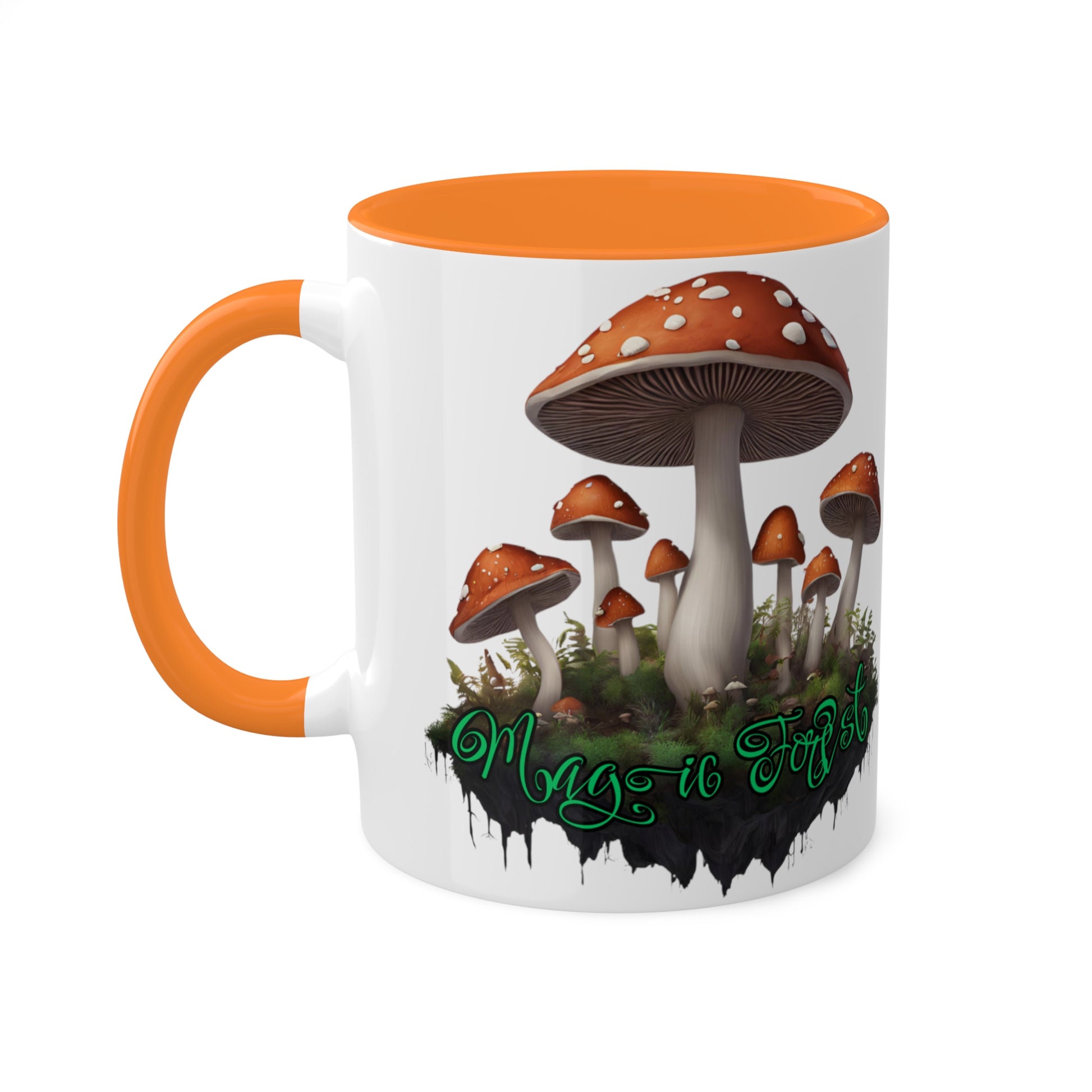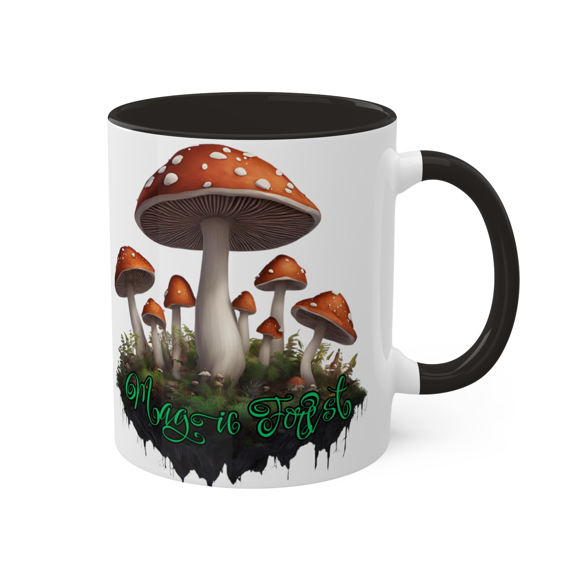 Warm your soul with our custom designed "Floating Magic Forest" two-tone/accented, white ceramic mug. Mugs are a staple in every kitchen and when they're combined with a custom flair, they become instant favorites. This mix of "nature/woodland and retro psychedelic art styles " inspired our custom designed mug. This mug has a wrap around graphic on solid white ceramic with a colorful handles and interiors. Available in 5 accent colors and 11 oz size. These colorful mugs hold your favorite "mushroom brew/coffee", any hot beverage or your " pick-me-up" juice of choice!