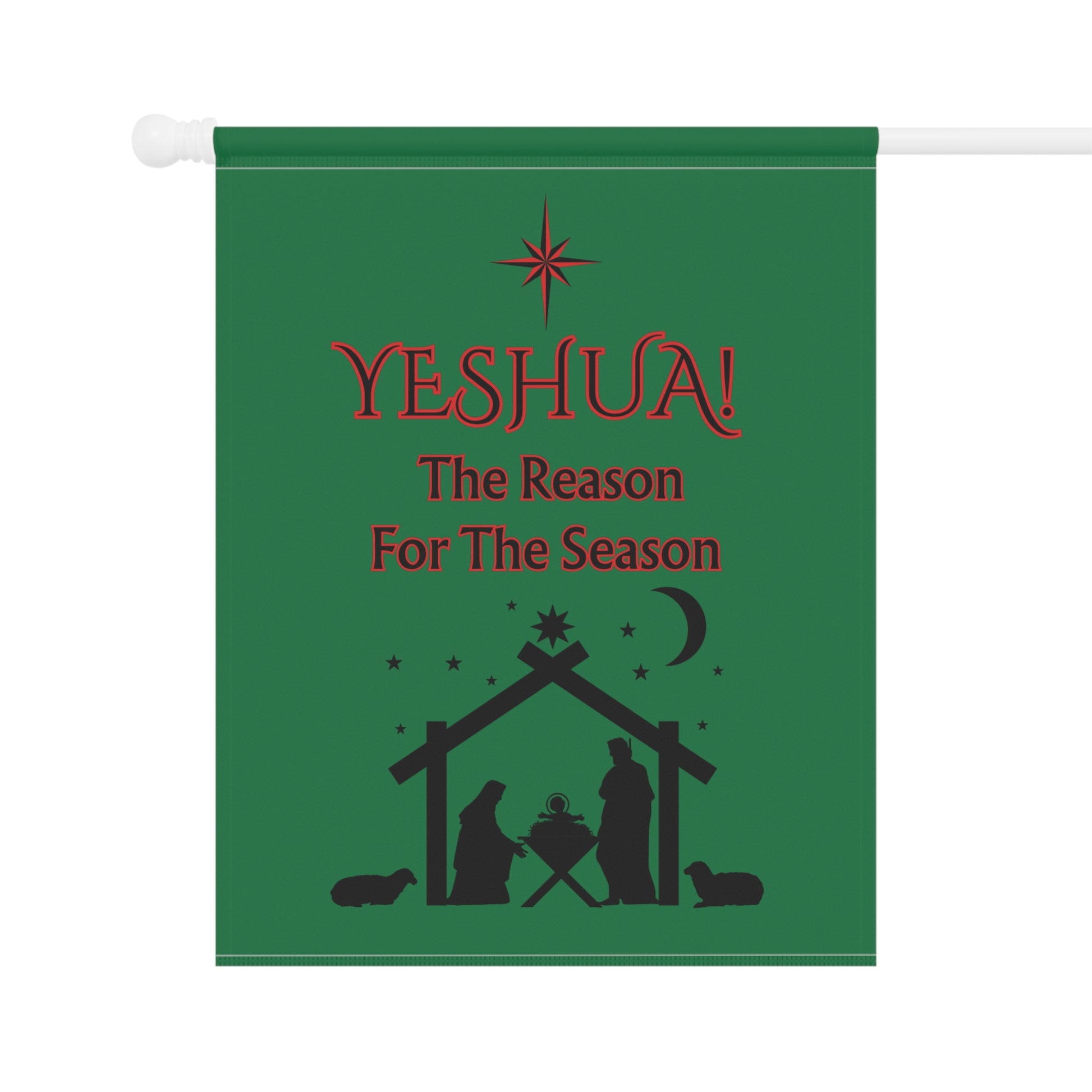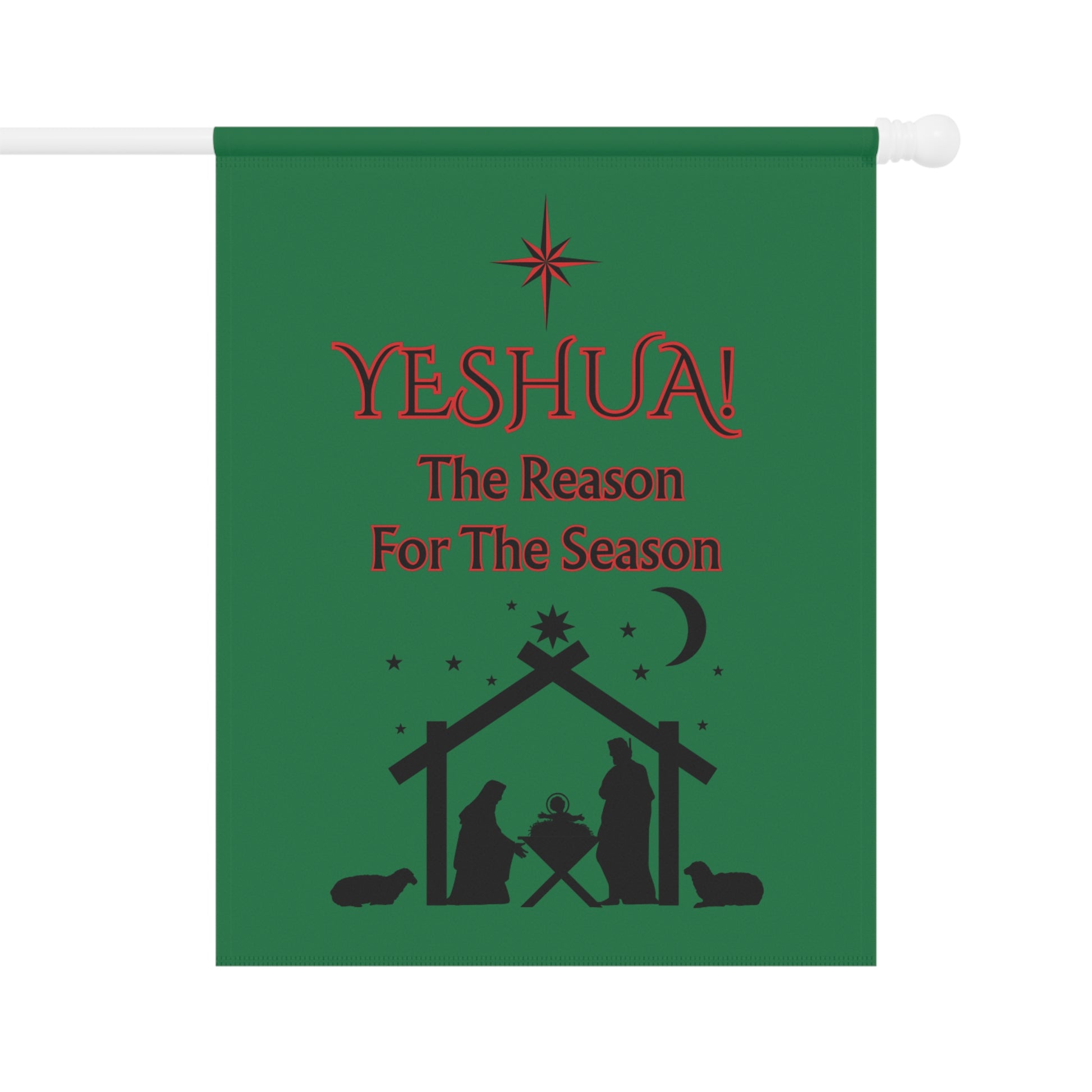 Celebrate the sacred story with our custom designed "Yeshua! The Reason For The Season" house banner that speaks softly of reverence and home. Printed on both sides in deep green with rich red lettering and a humble nativity silhouette, this banner hangs neatly from a top sleeve so the stable scene faces visitors coming up the path. It adds a quiet, heartfelt note to front porches, entryways, or garden beds during Advent and the Christmas season — a visible reminder of faith woven into everyday surroundings. The black inner lining keeps the colors bold, while two size options let you choose a subtle accent or a more pronounced display. BTW, check our store for a garden banner in the same color and similar design. Happy Holidays!