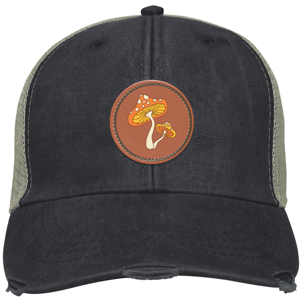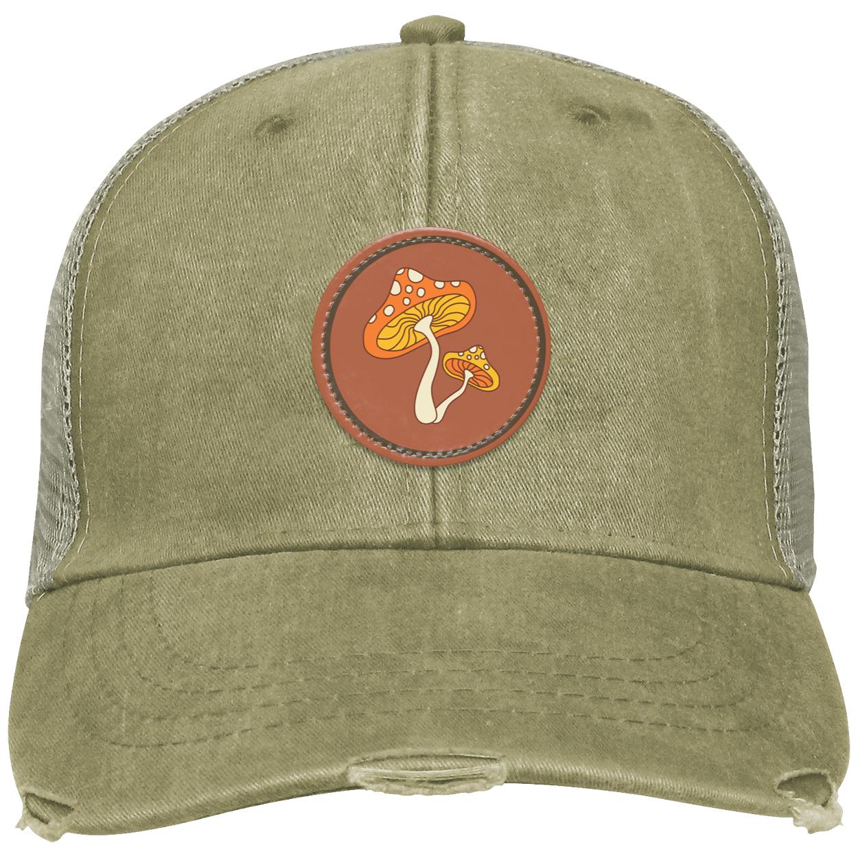 "Groovy Mushroom", Distressed Ollie Cap with Small Brown Vegan Leather Patch