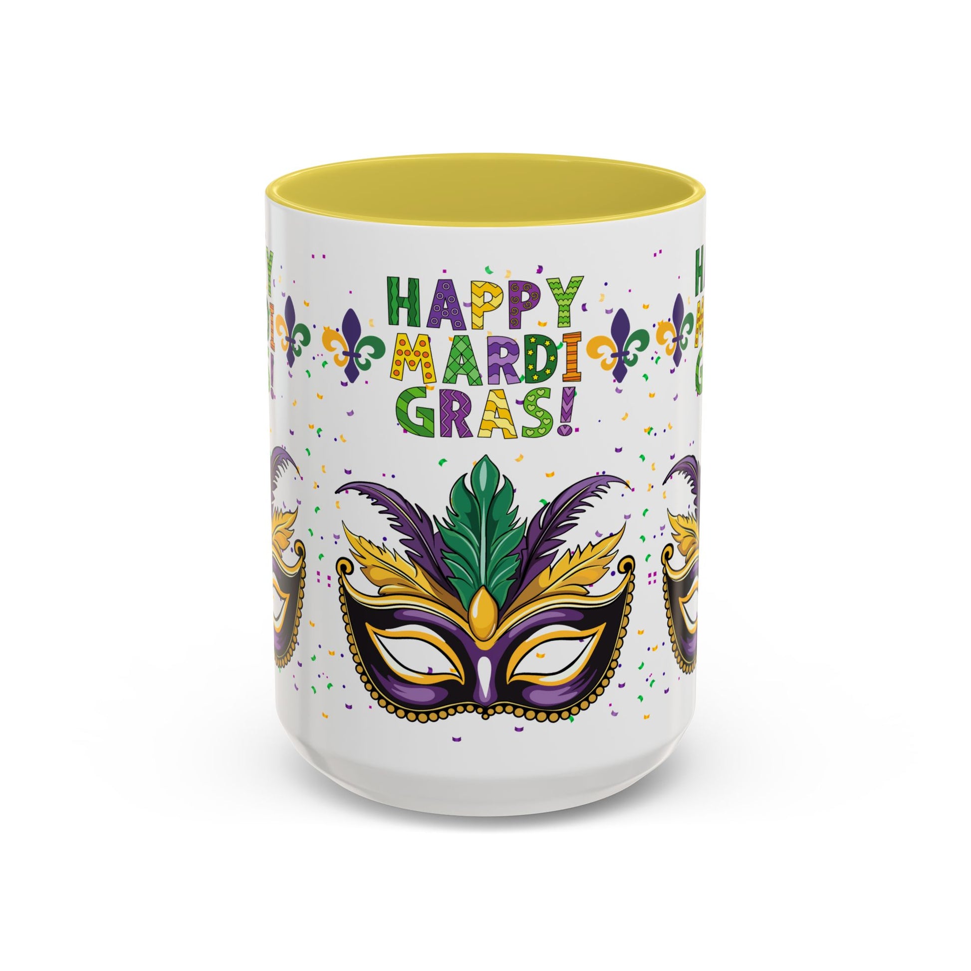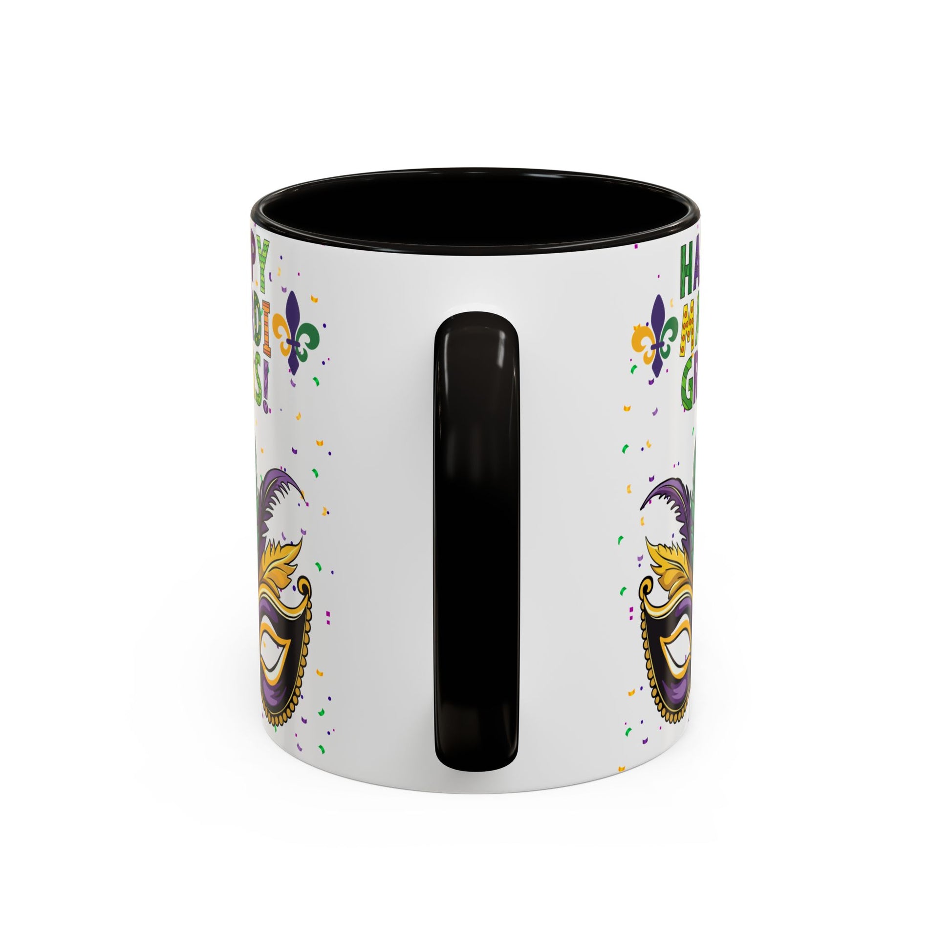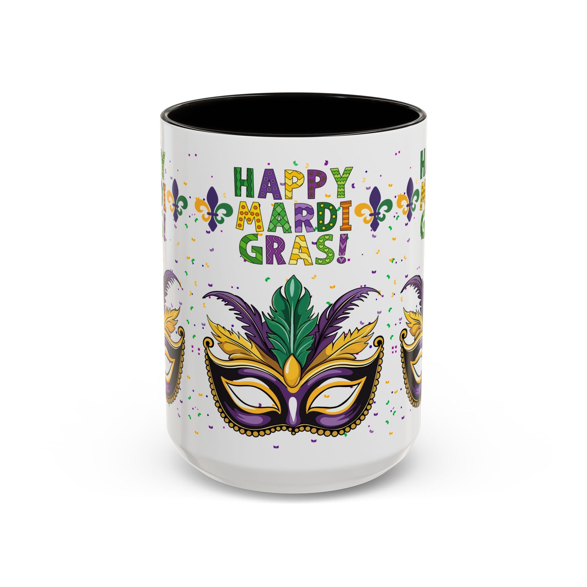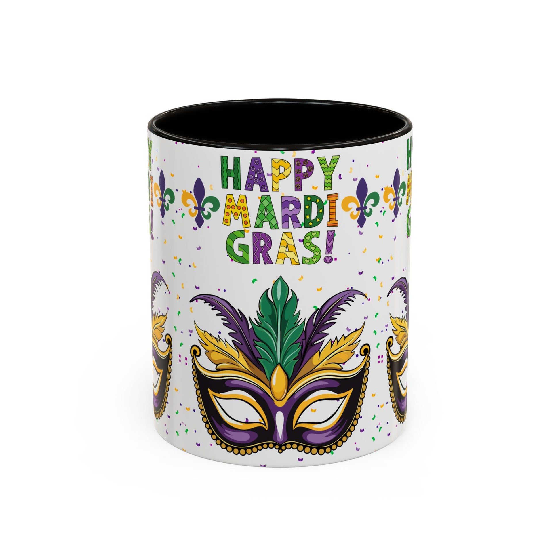 Our "Happy Mardi Gras" bright, festive mug brings Carnival Season energy to slow mornings and late-night celebrations alike. The glossy, white ceramic surface showcases a vivid mask, fleur-de-lis accents and confetti in traditional purple, green and gold. Choose a black interior and handle for added contrast or pick from a variety of accent colors to match your party palette. Sturdy C-shaped handle and ORCA-coated print hold up through regular use, while dishwasher and microwave safety keeps this mug ready for coffee sips between parades and porch chats. It’s the kind of cup that makes you smile when you reach for it — whether you’re nursing a hangover, planning a costume, or setting out a colorful display for guests. Happy Mardi Gras!
