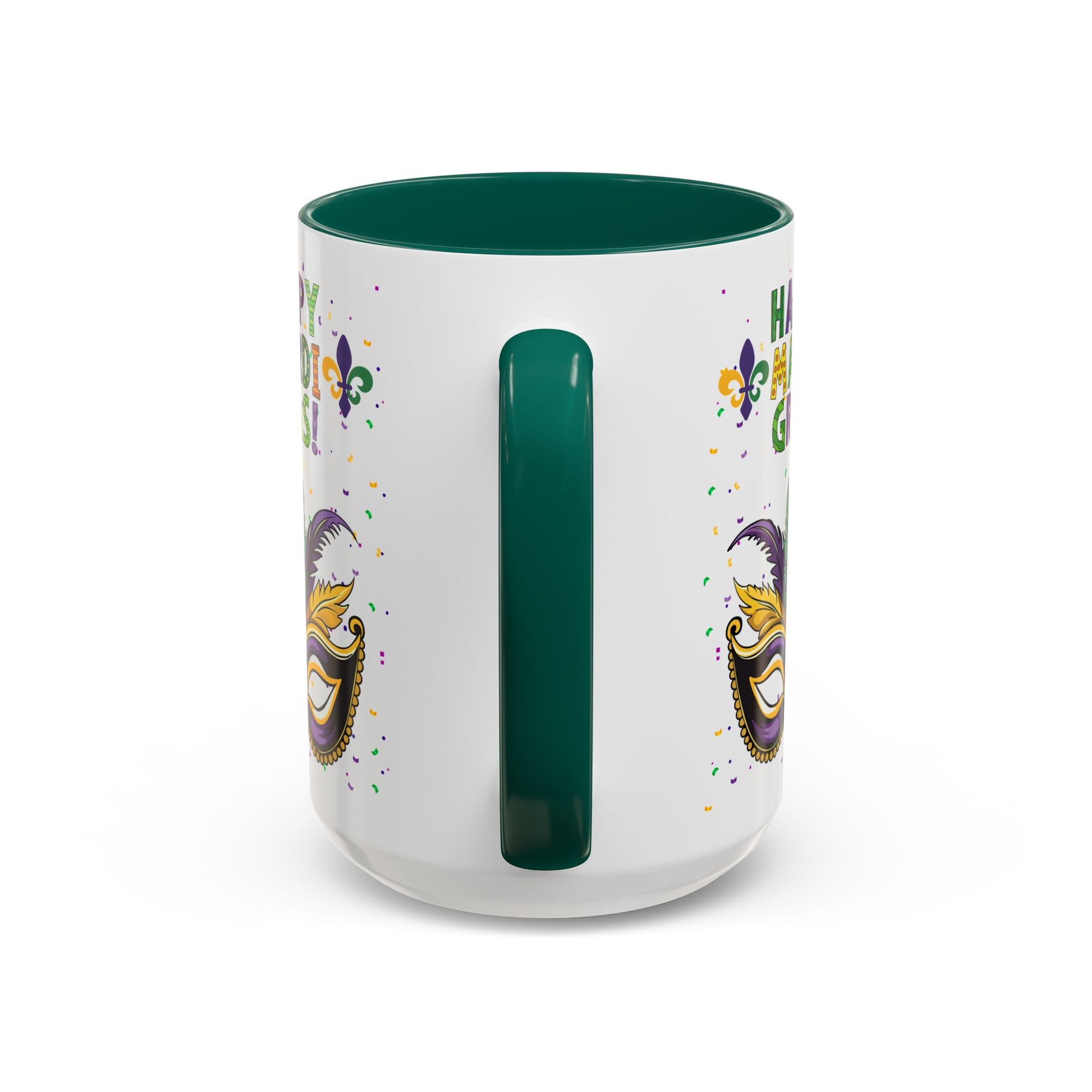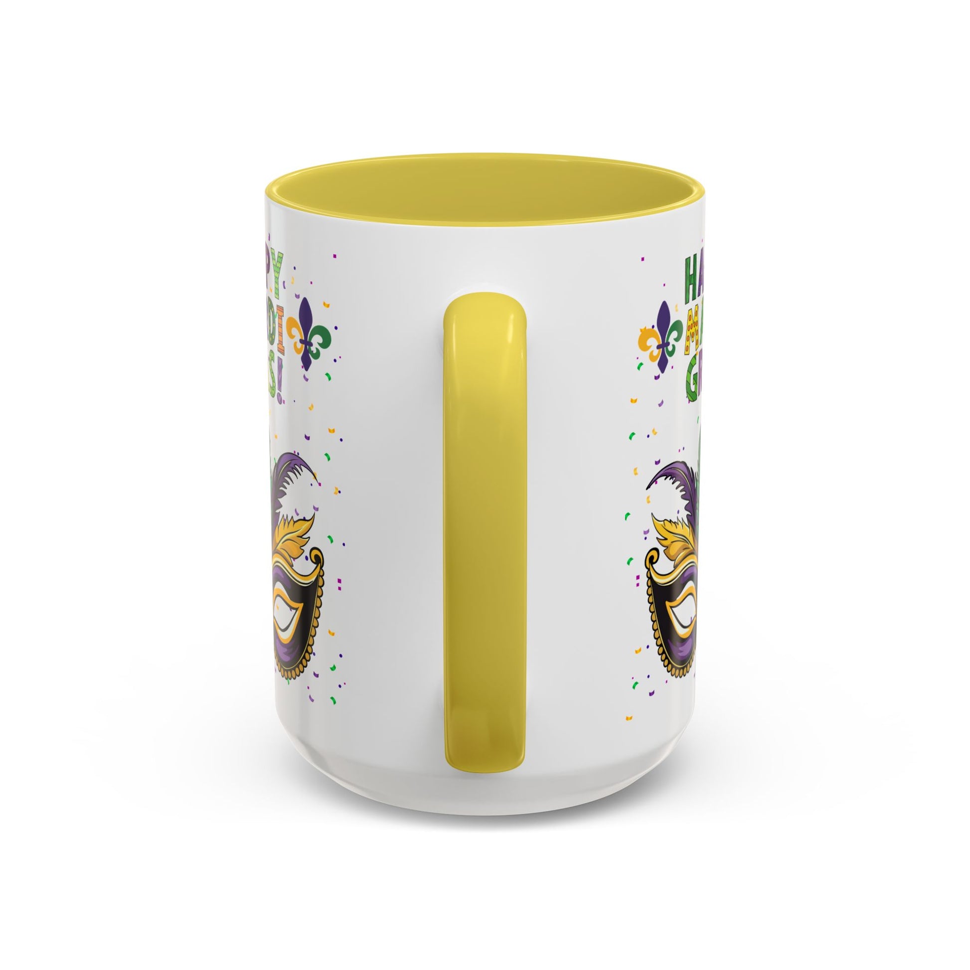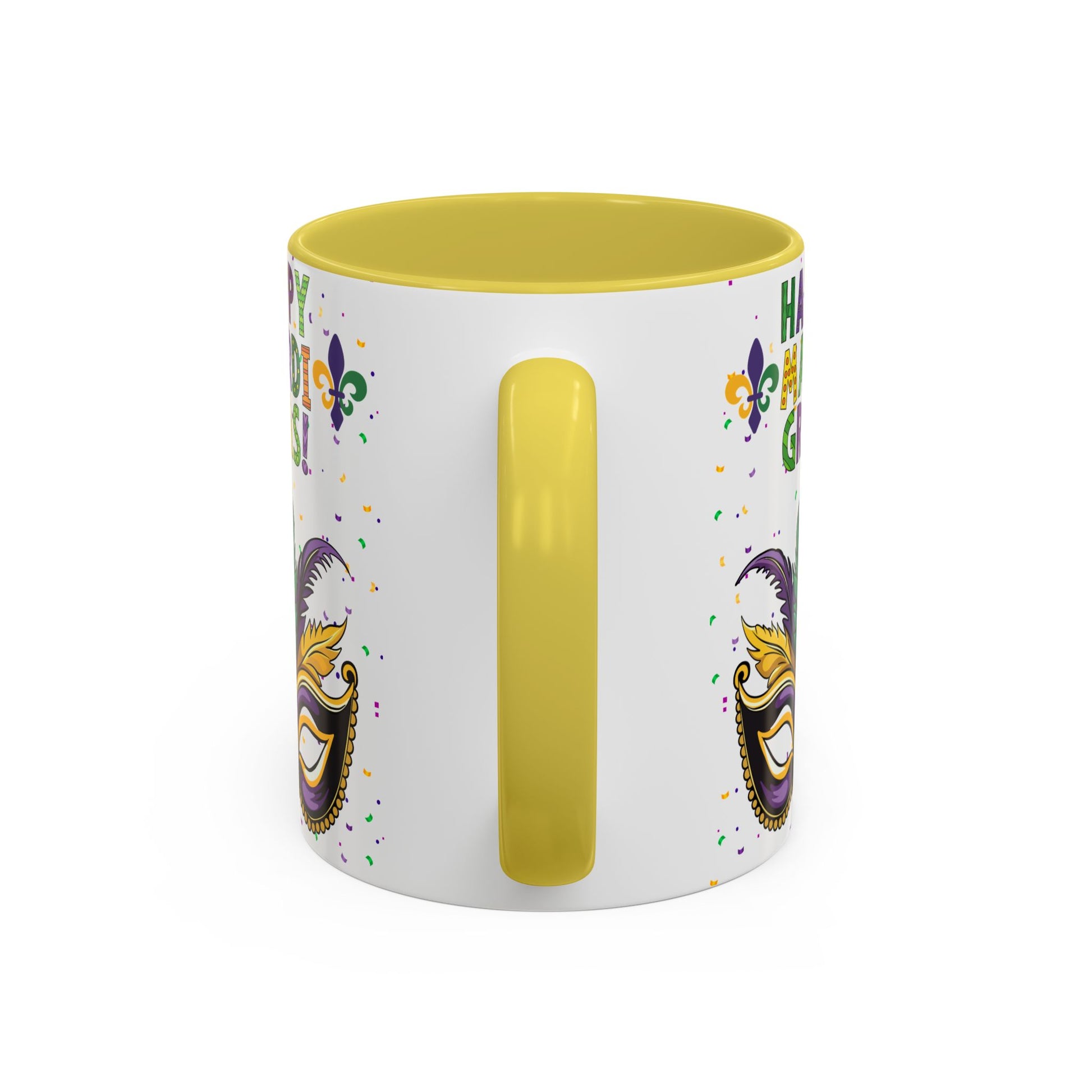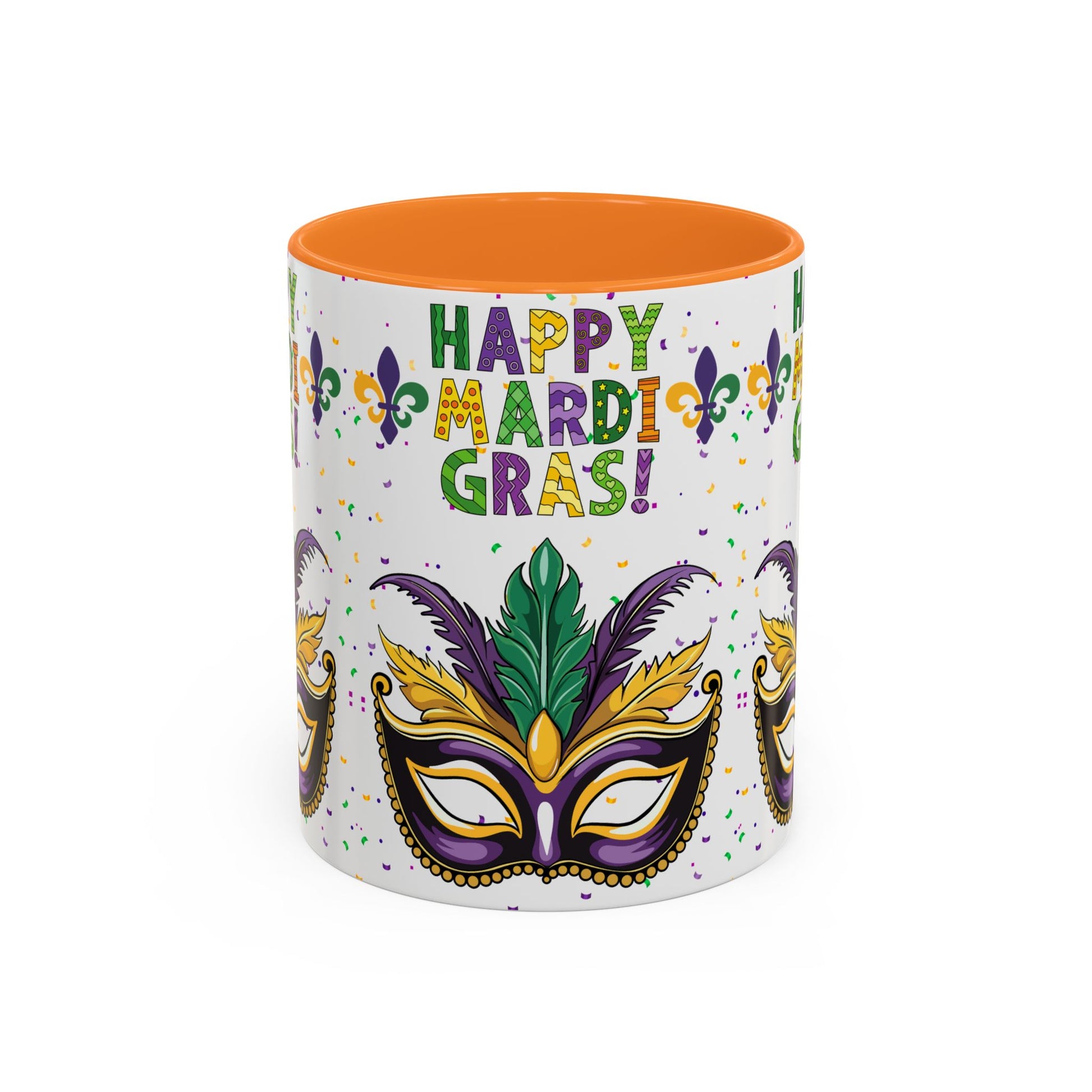 Our "Happy Mardi Gras" bright, festive mug brings Carnival Season energy to slow mornings and late-night celebrations alike. The glossy, white ceramic surface showcases a vivid mask, fleur-de-lis accents and confetti in traditional purple, green and gold. Choose a black interior and handle for added contrast or pick from a variety of accent colors to match your party palette. Sturdy C-shaped handle and ORCA-coated print hold up through regular use, while dishwasher and microwave safety keeps this mug ready for coffee sips between parades and porch chats. It’s the kind of cup that makes you smile when you reach for it — whether you’re nursing a hangover, planning a costume, or setting out a colorful display for guests. Happy Mardi Gras!
