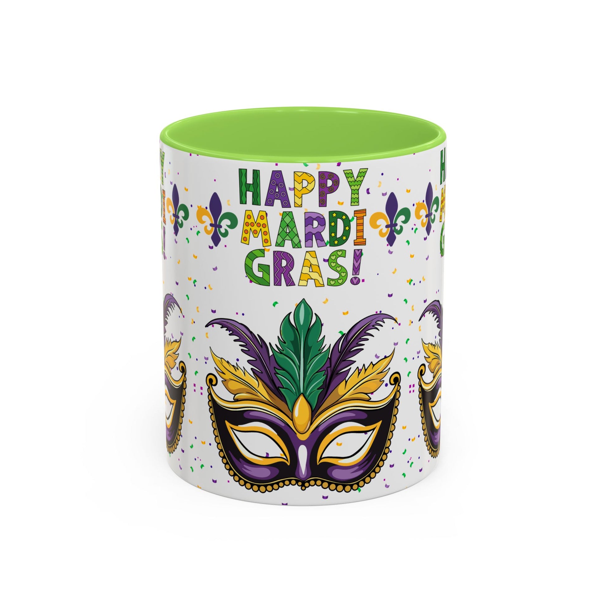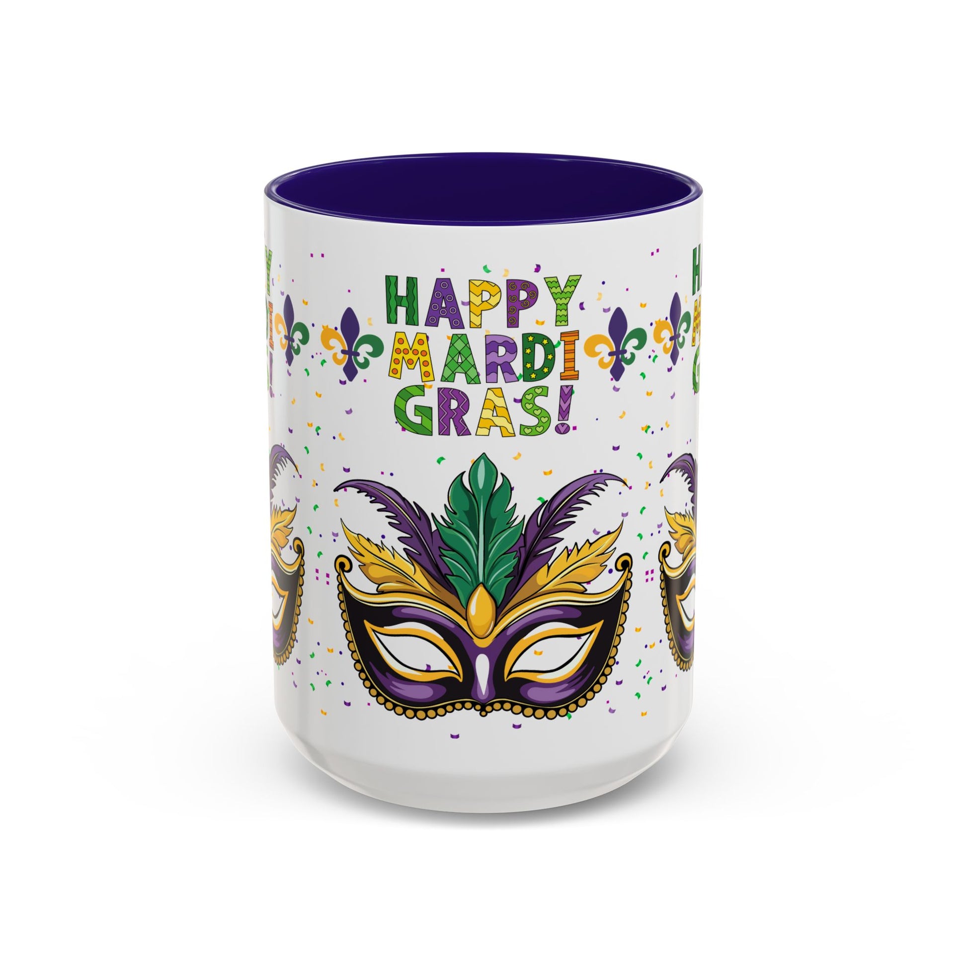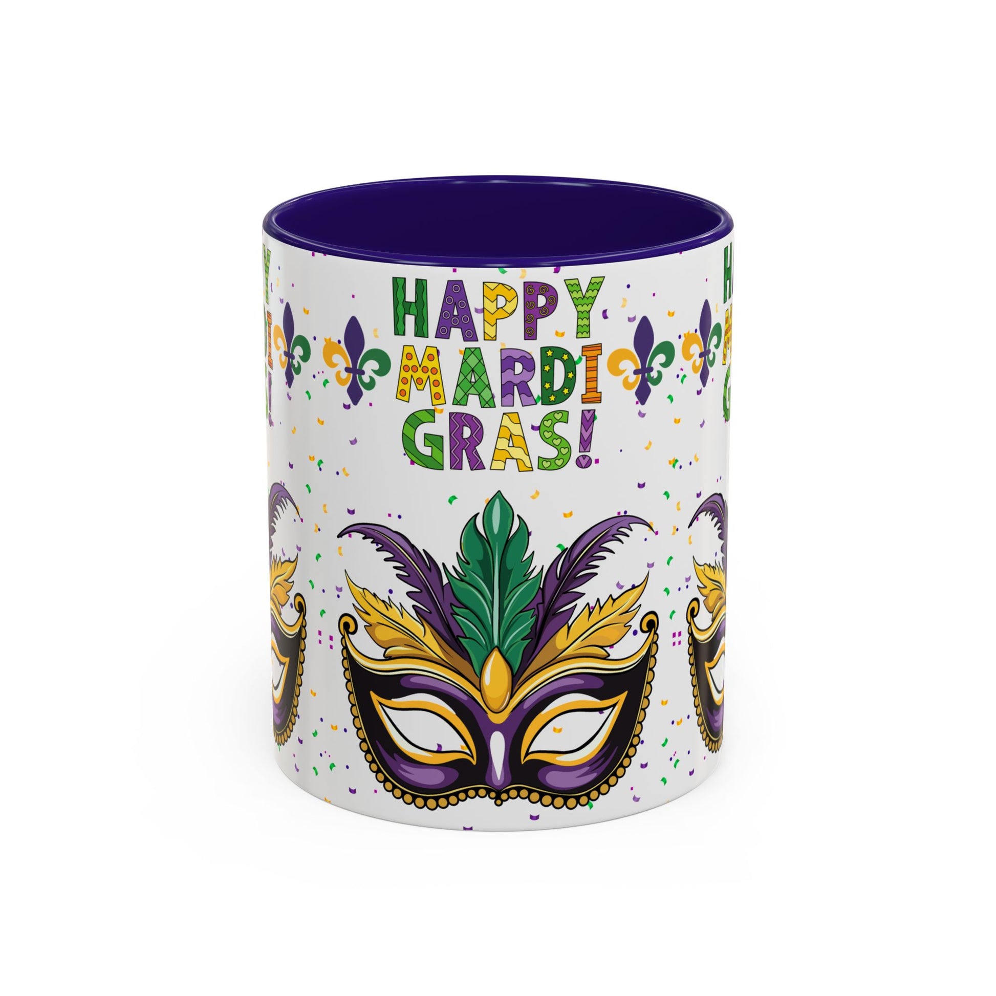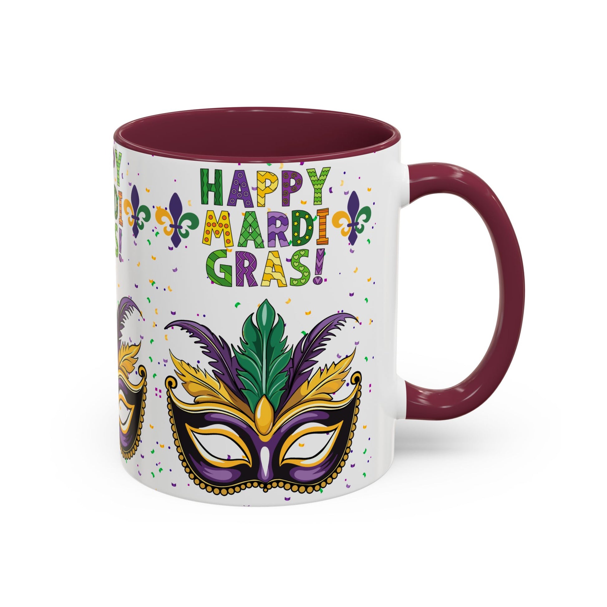 "Happy Mardi Gras" Mugs — Colorful 11oz/15oz Carnival Mask-Fleur De Lis Design White Ceramic Mugs