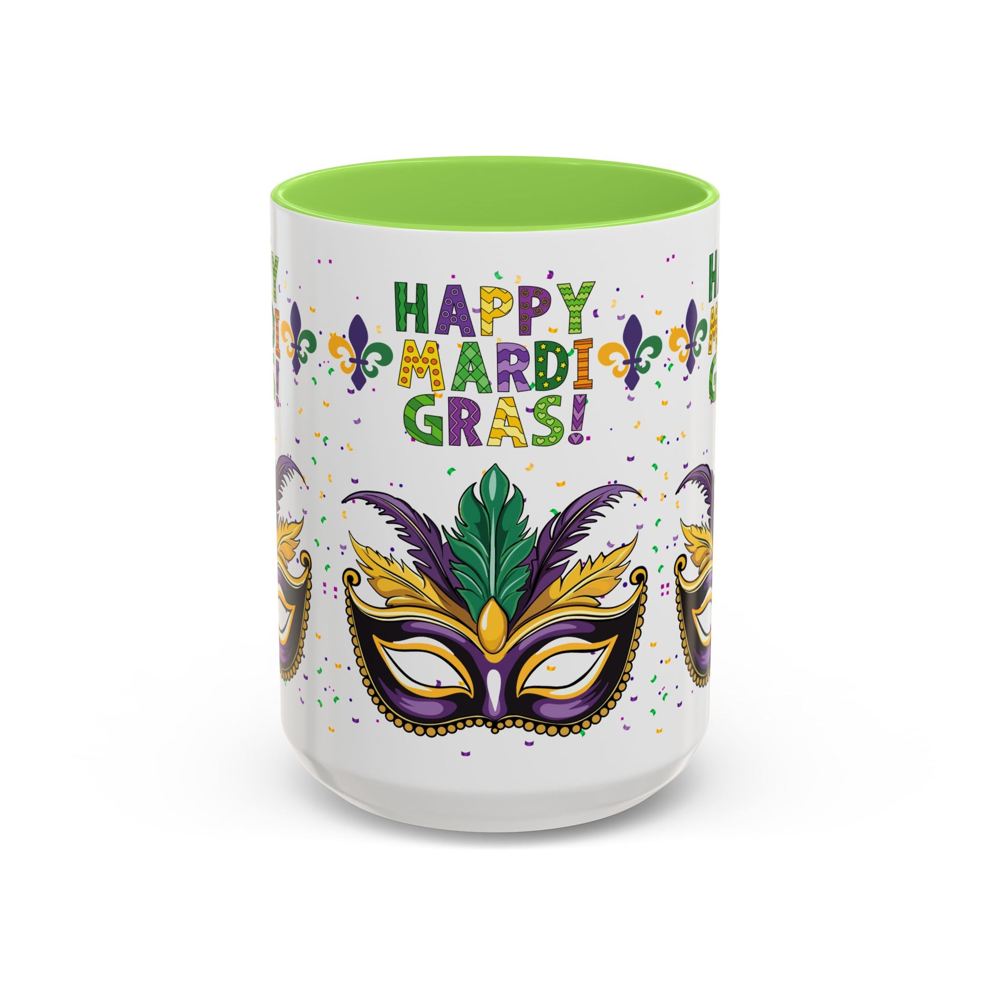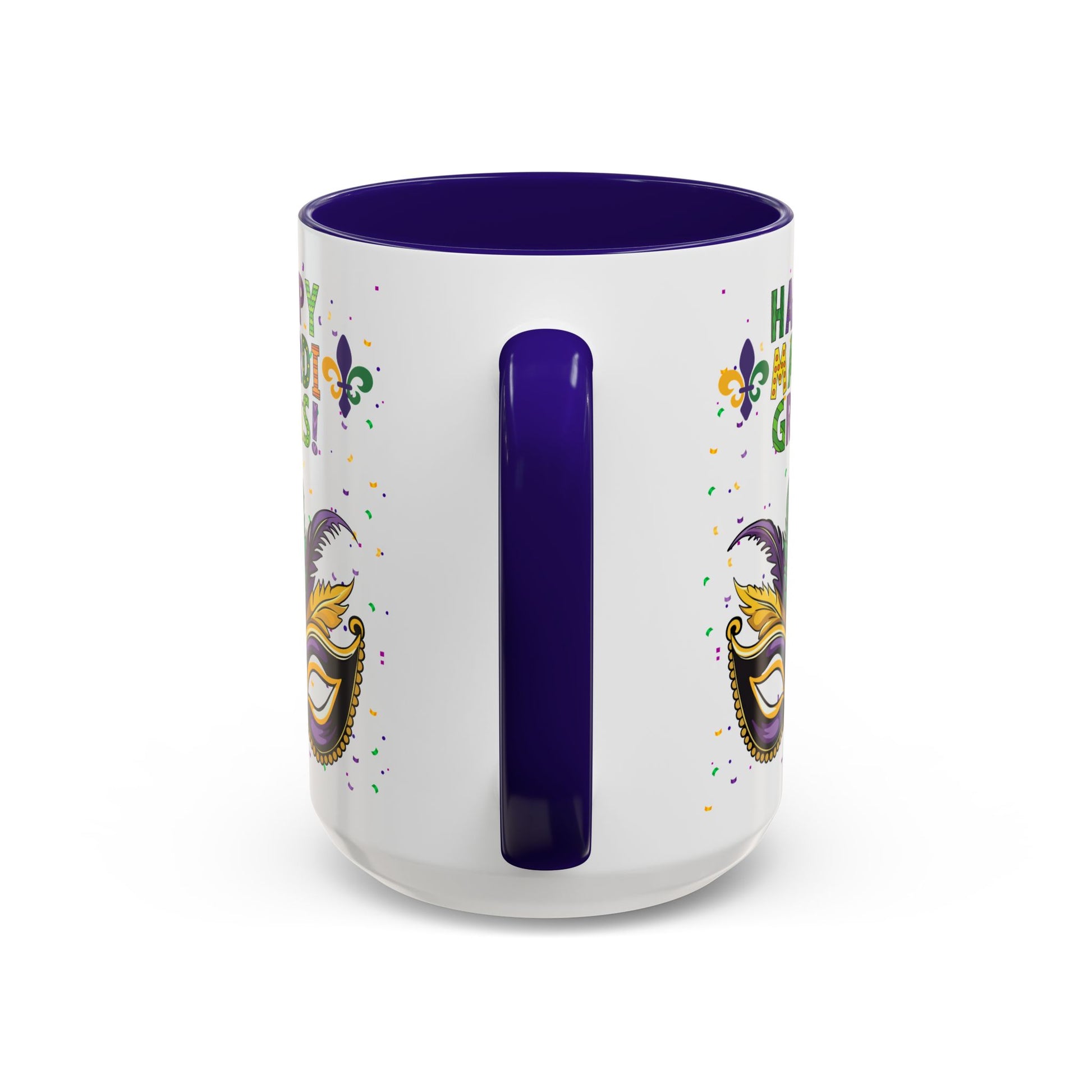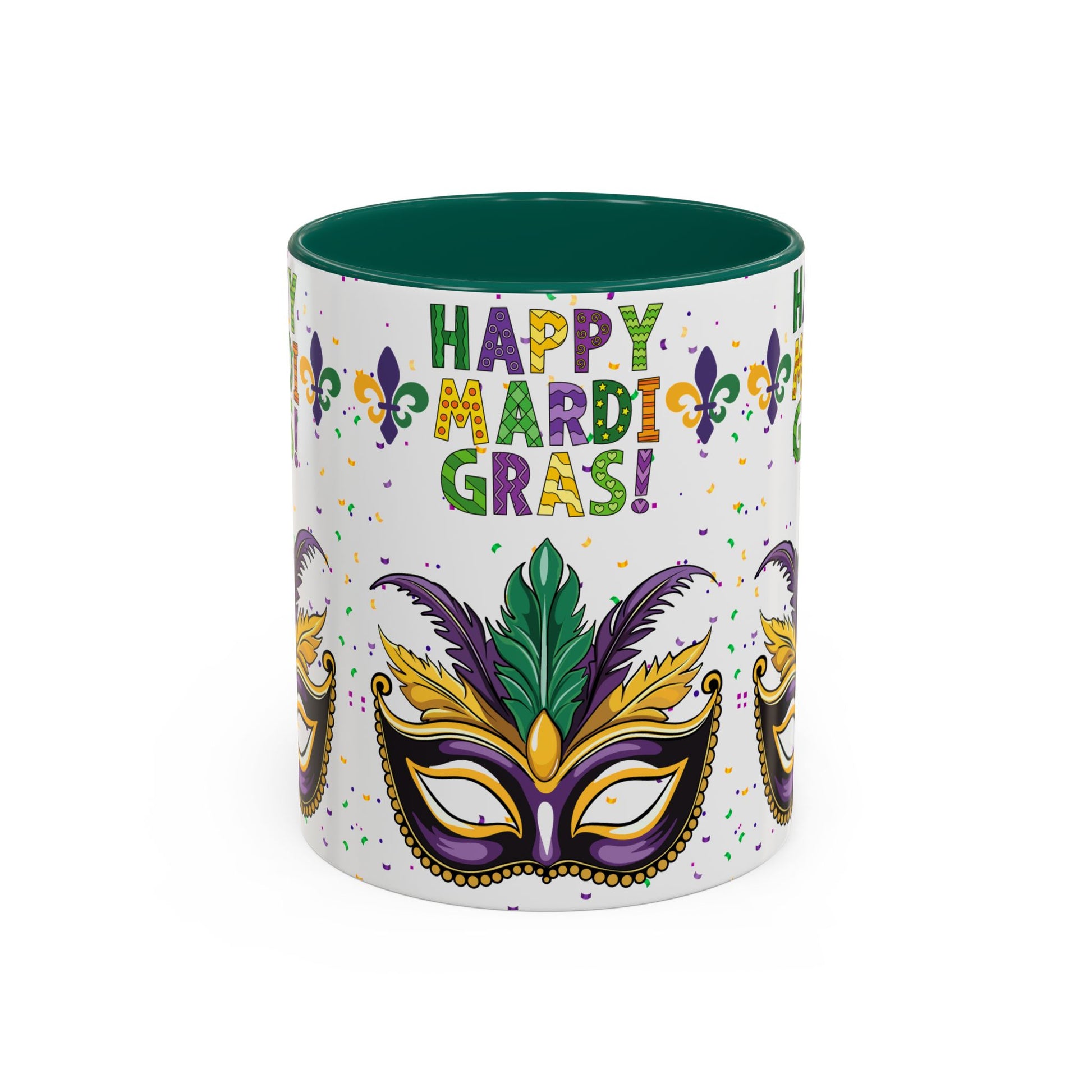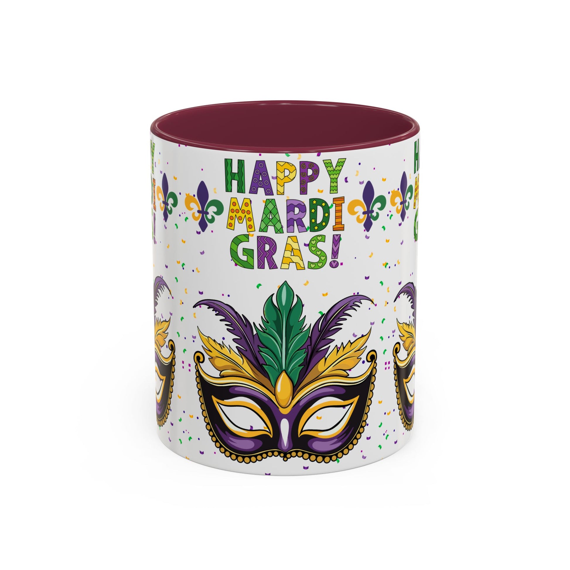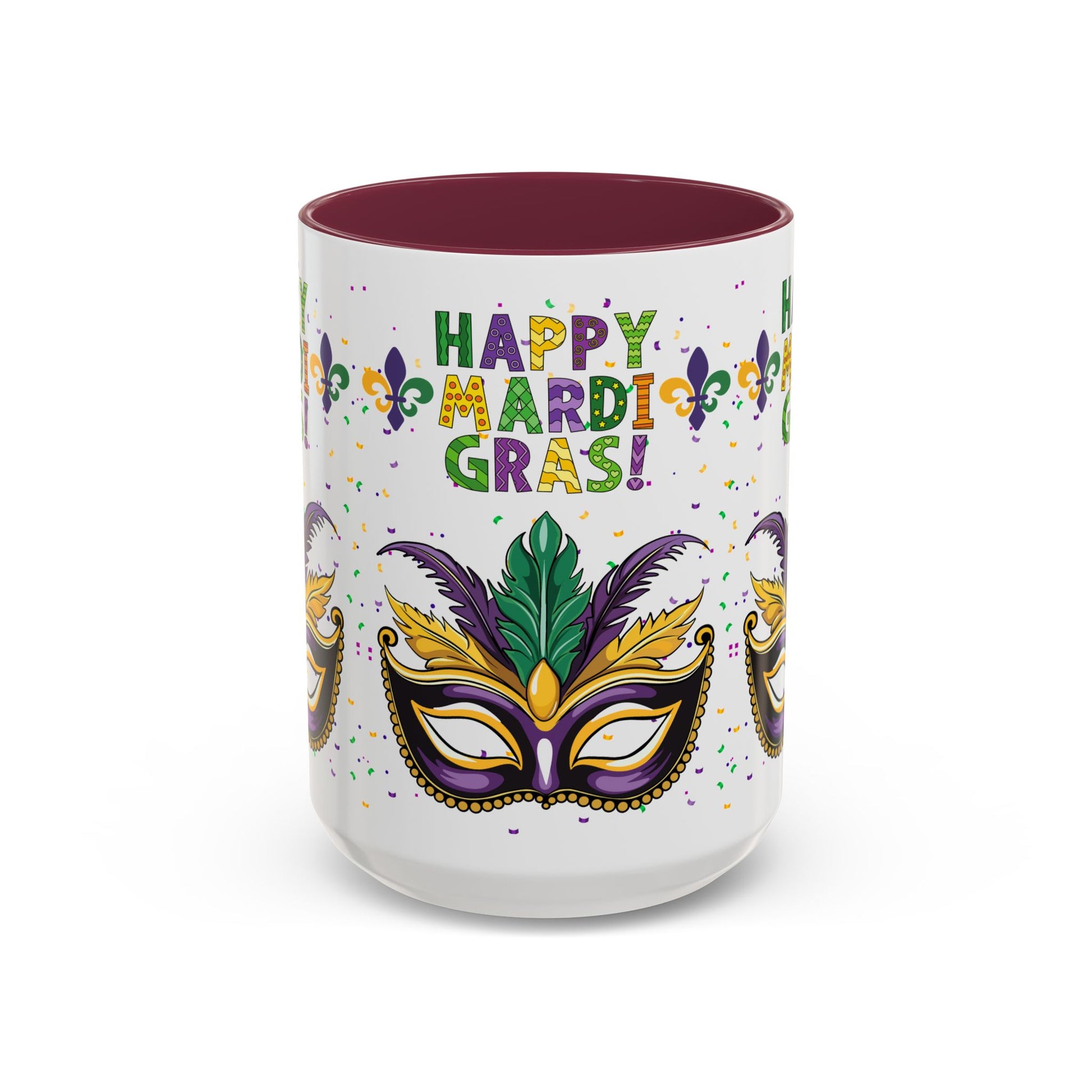 "Happy Mardi Gras" Mugs — Colorful 11oz/15oz Carnival Mask-Fleur De Lis Design White Ceramic Mugs