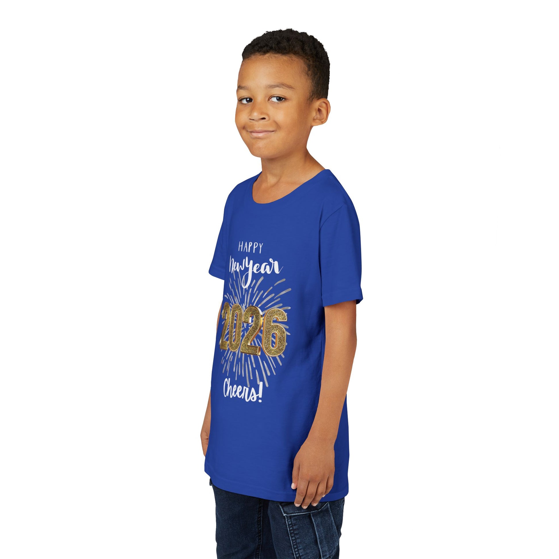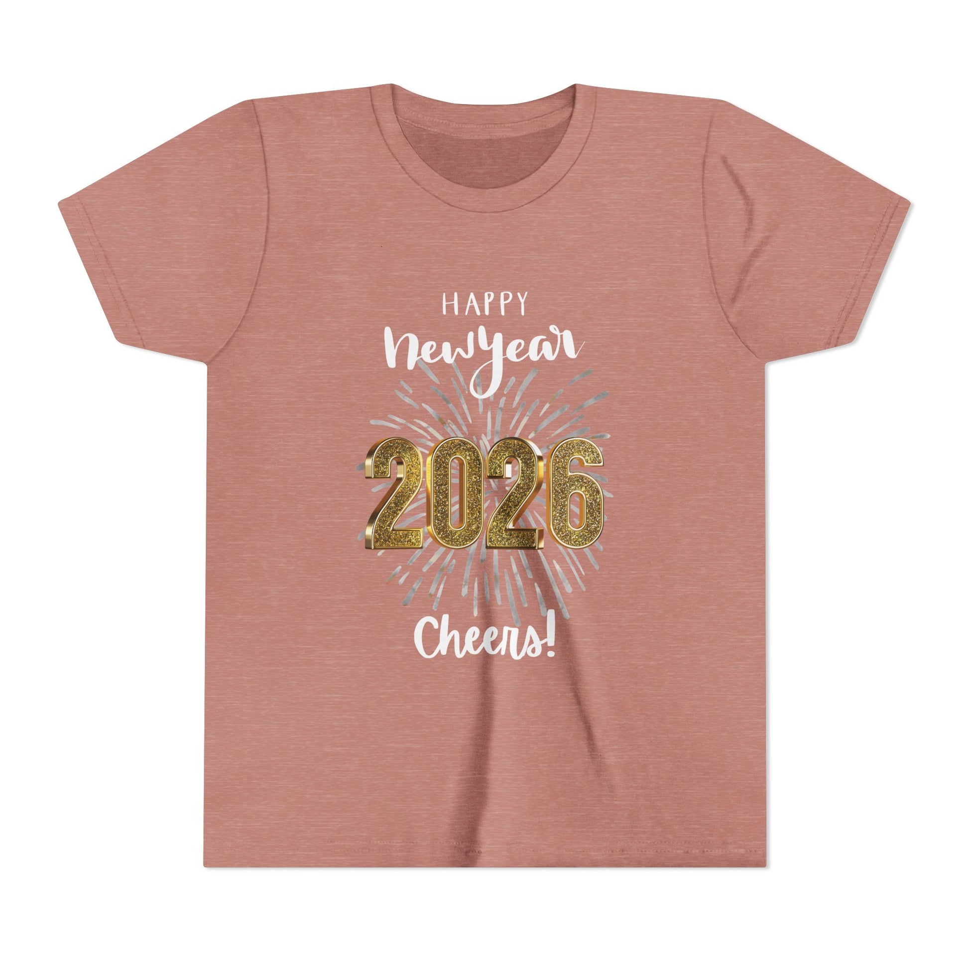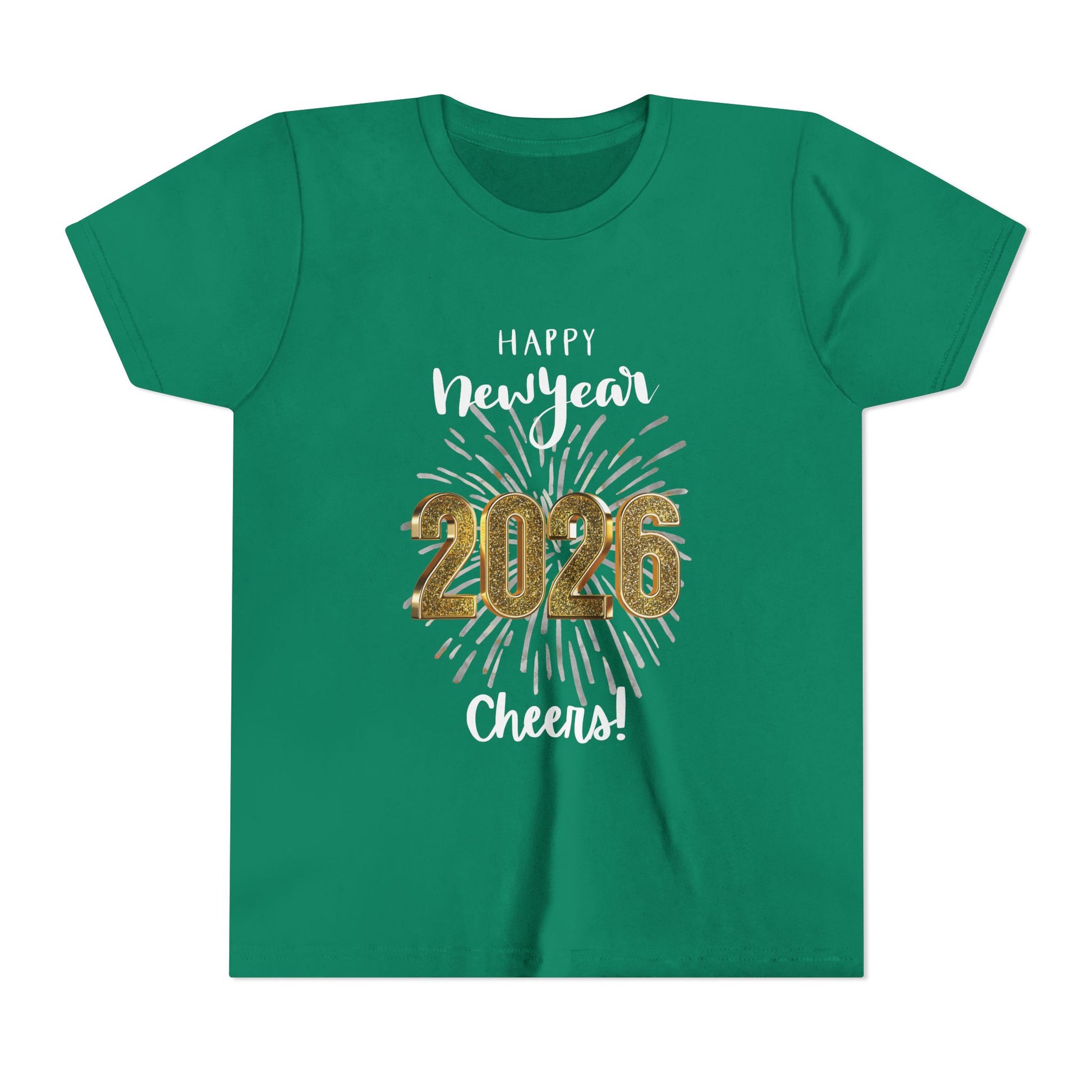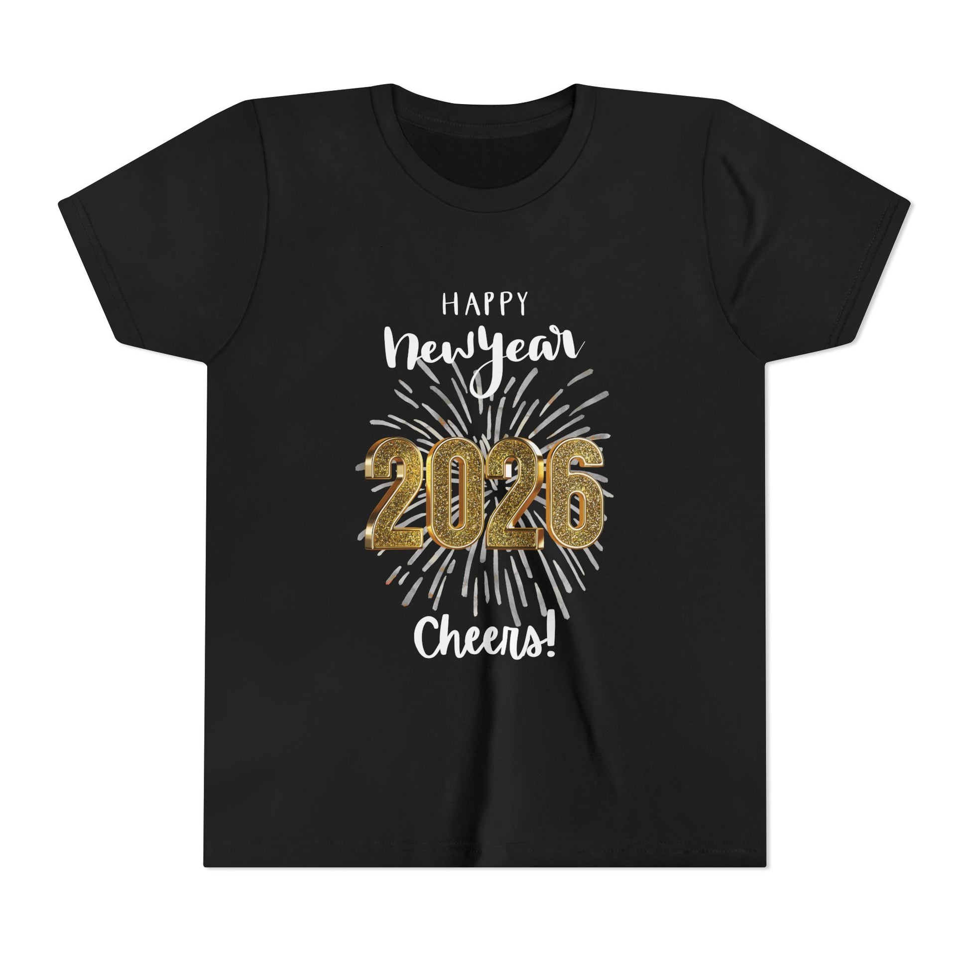"Happy New Year 2026- Cheers!", Unisex Youth Tee. Sparkling Fireworks Make This Tee The One to Wear On That Special Day!
