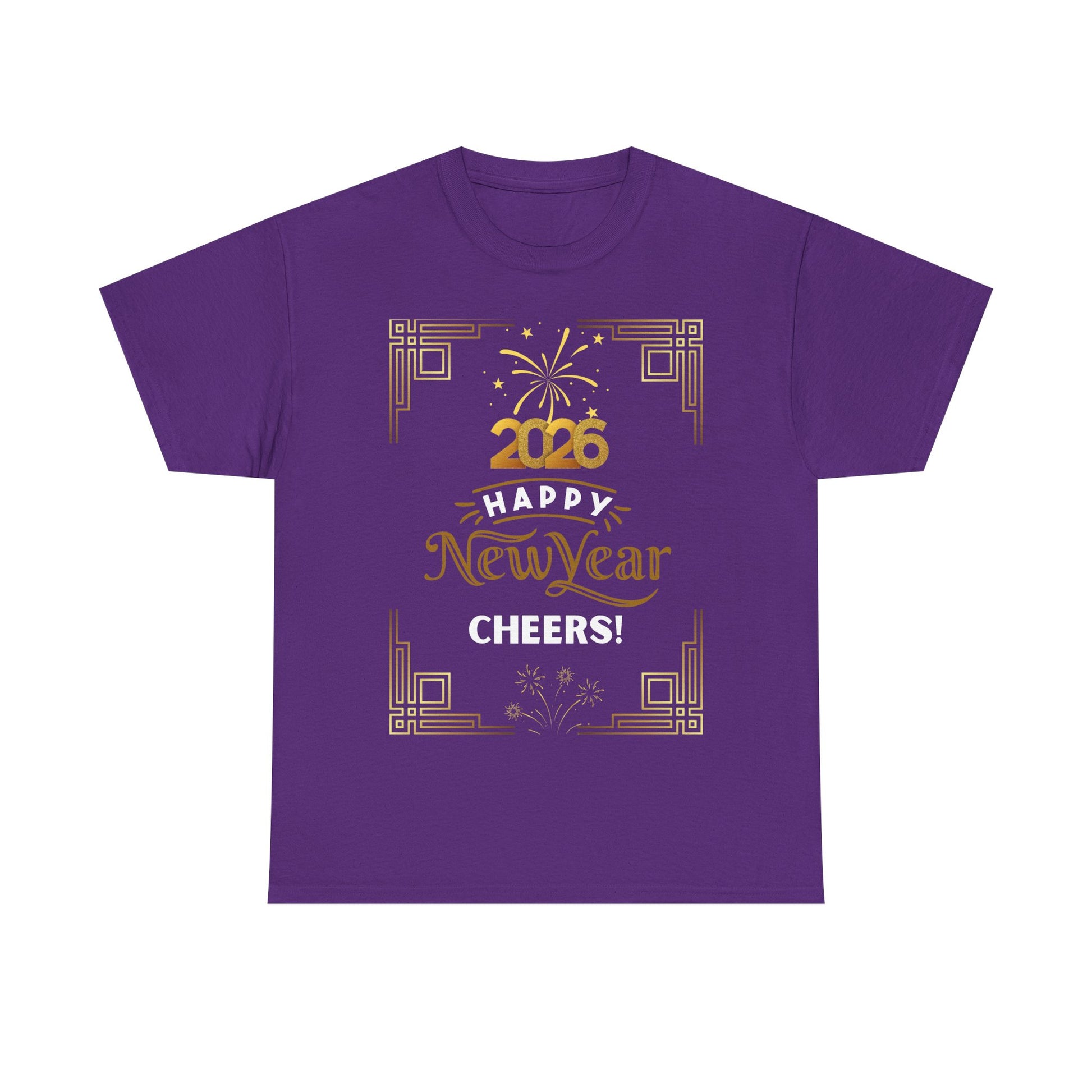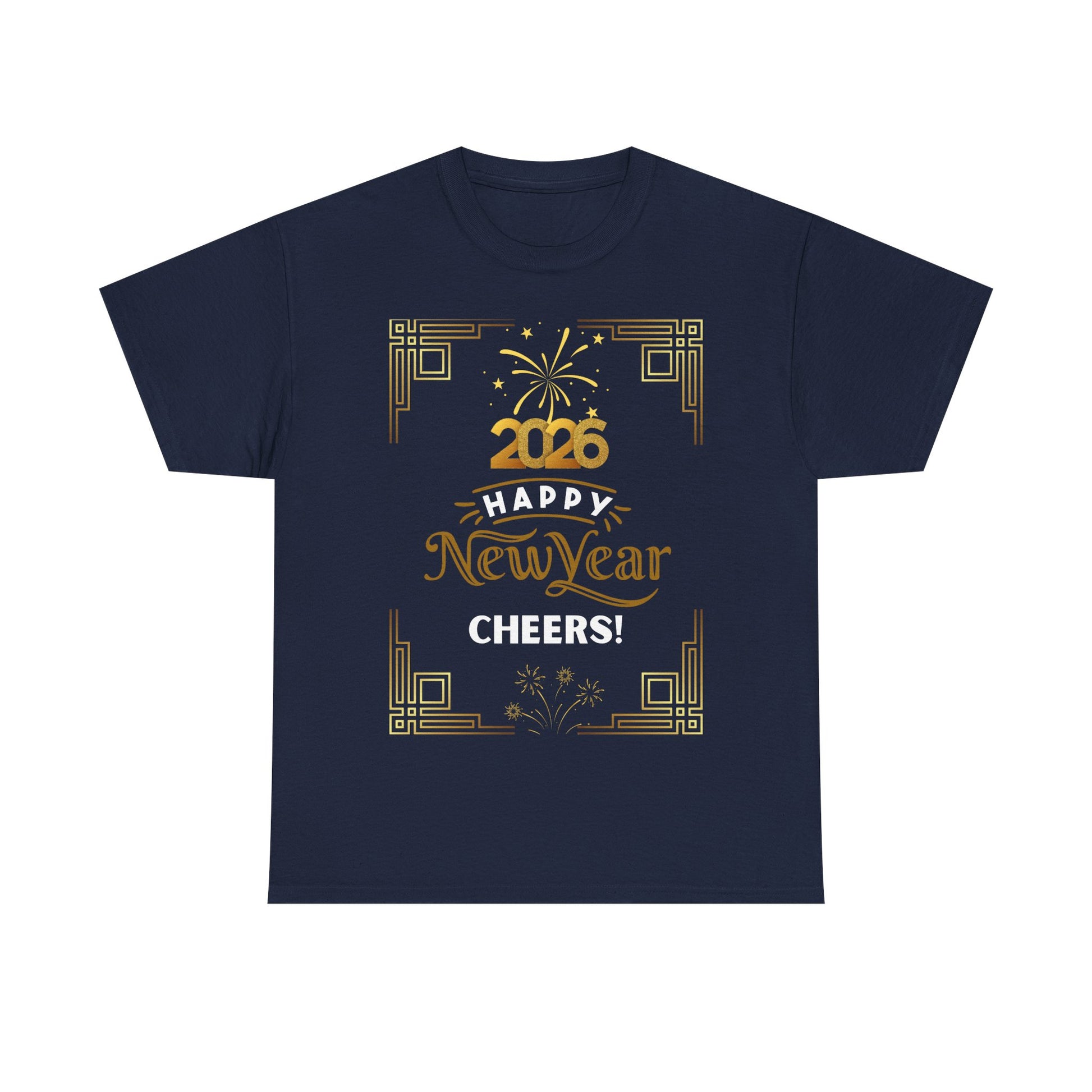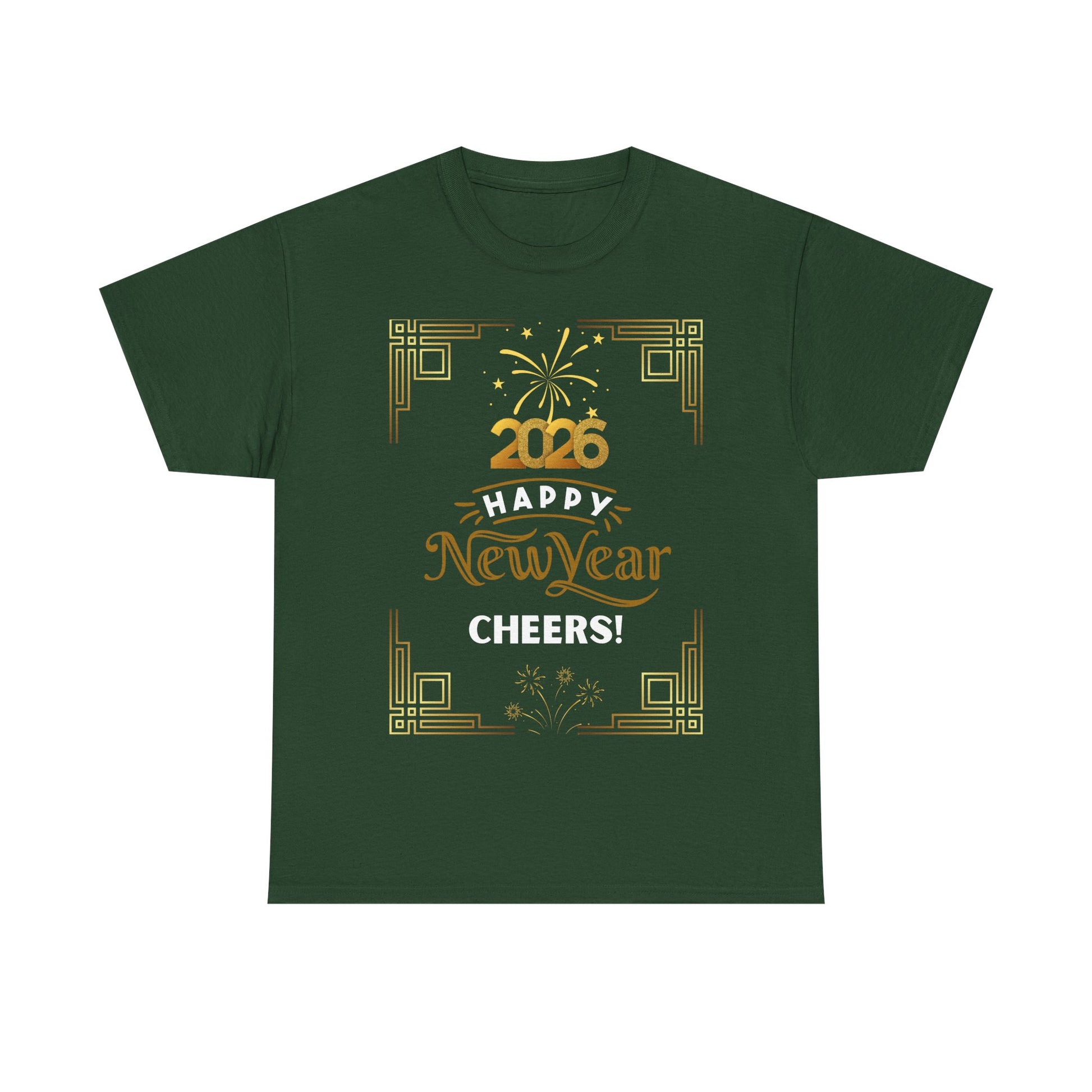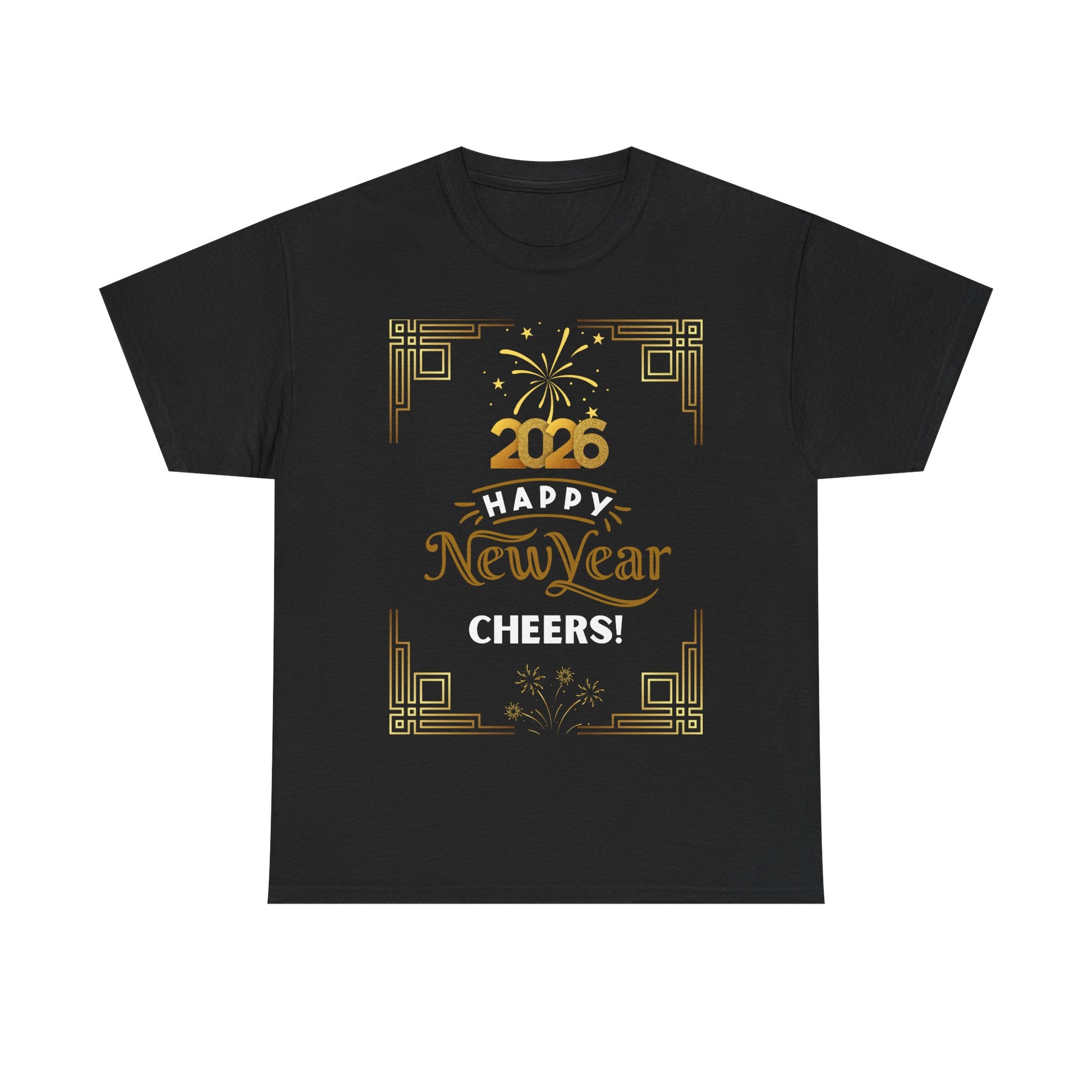 "Happy New Year -Cheers!" 2026 Unisex Midweight T-Shirt- 100 % Cotton — Festive "Art Deco Style" New Years Tee Great for Casual Celebrations or Parties While Ringing In the New Year!