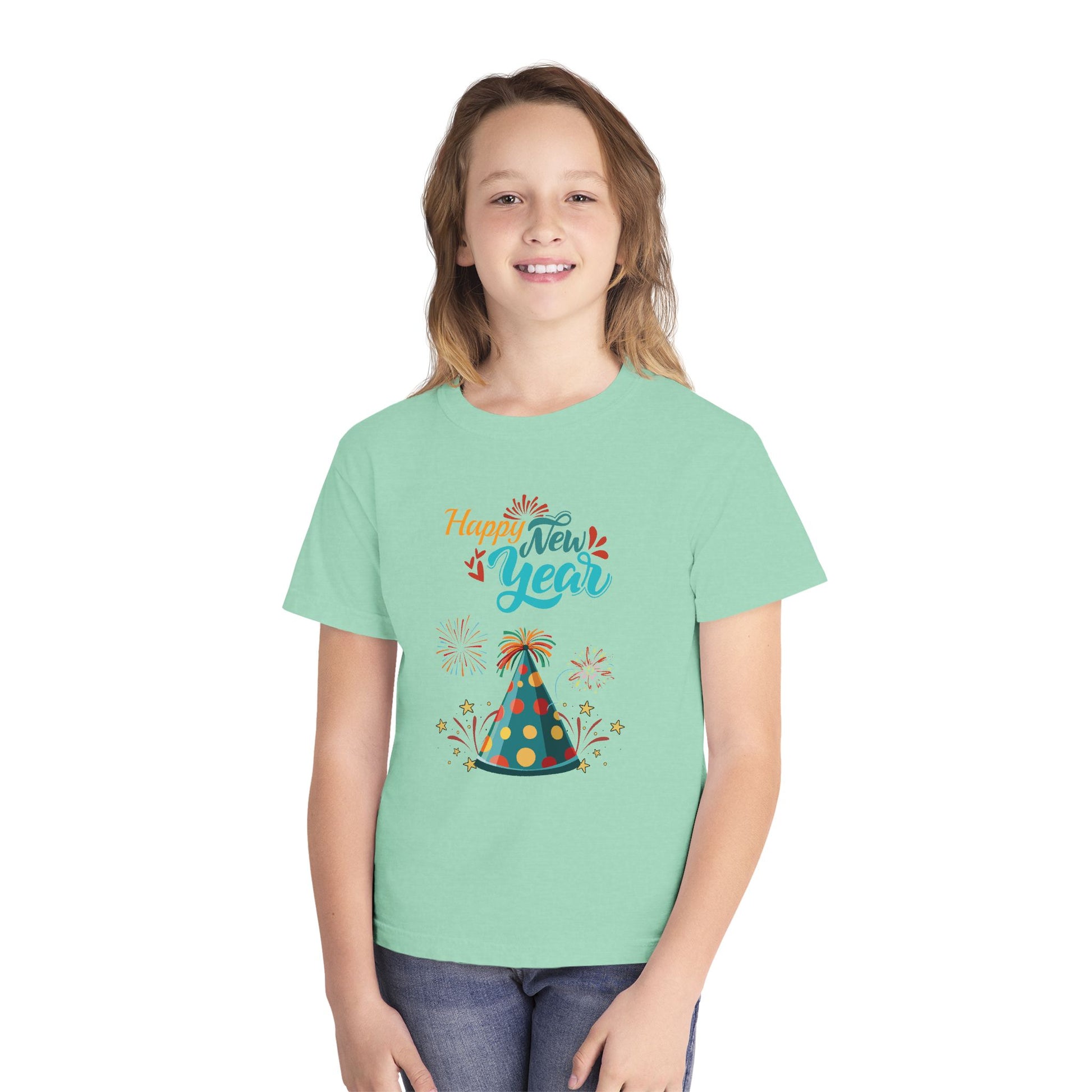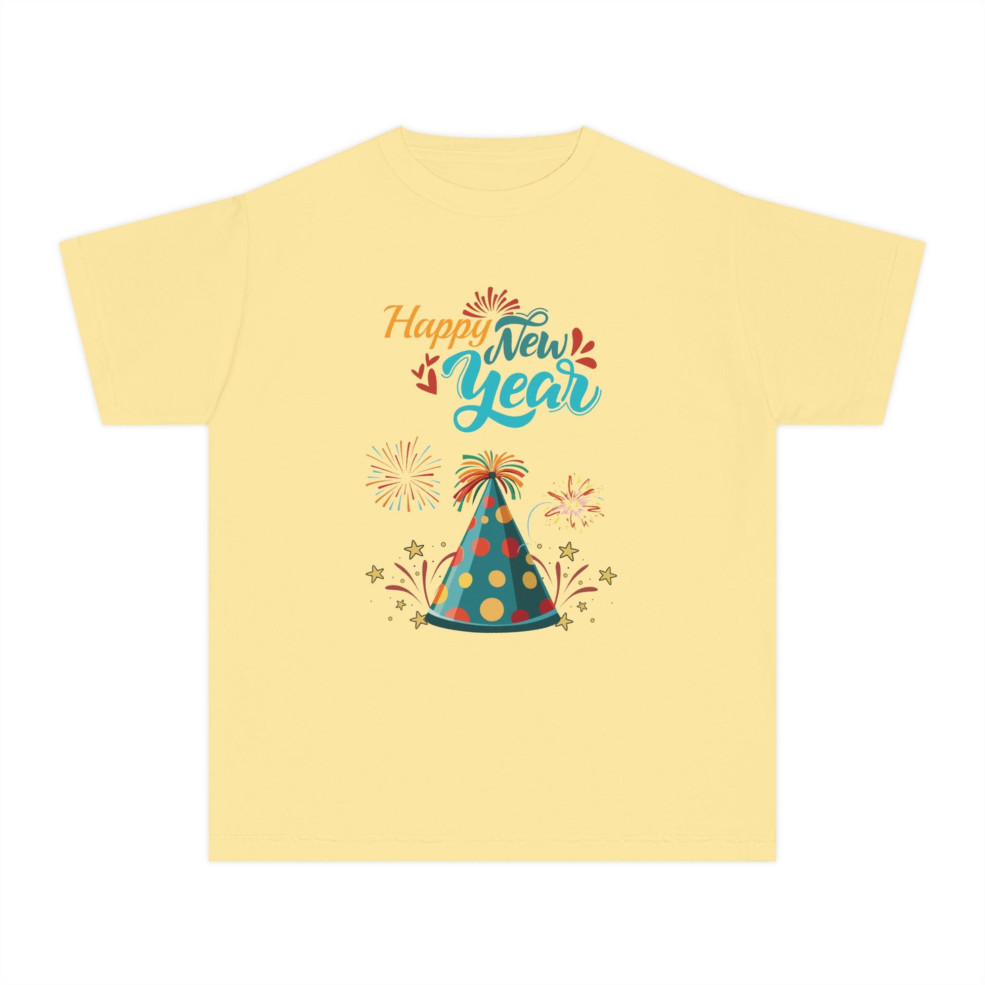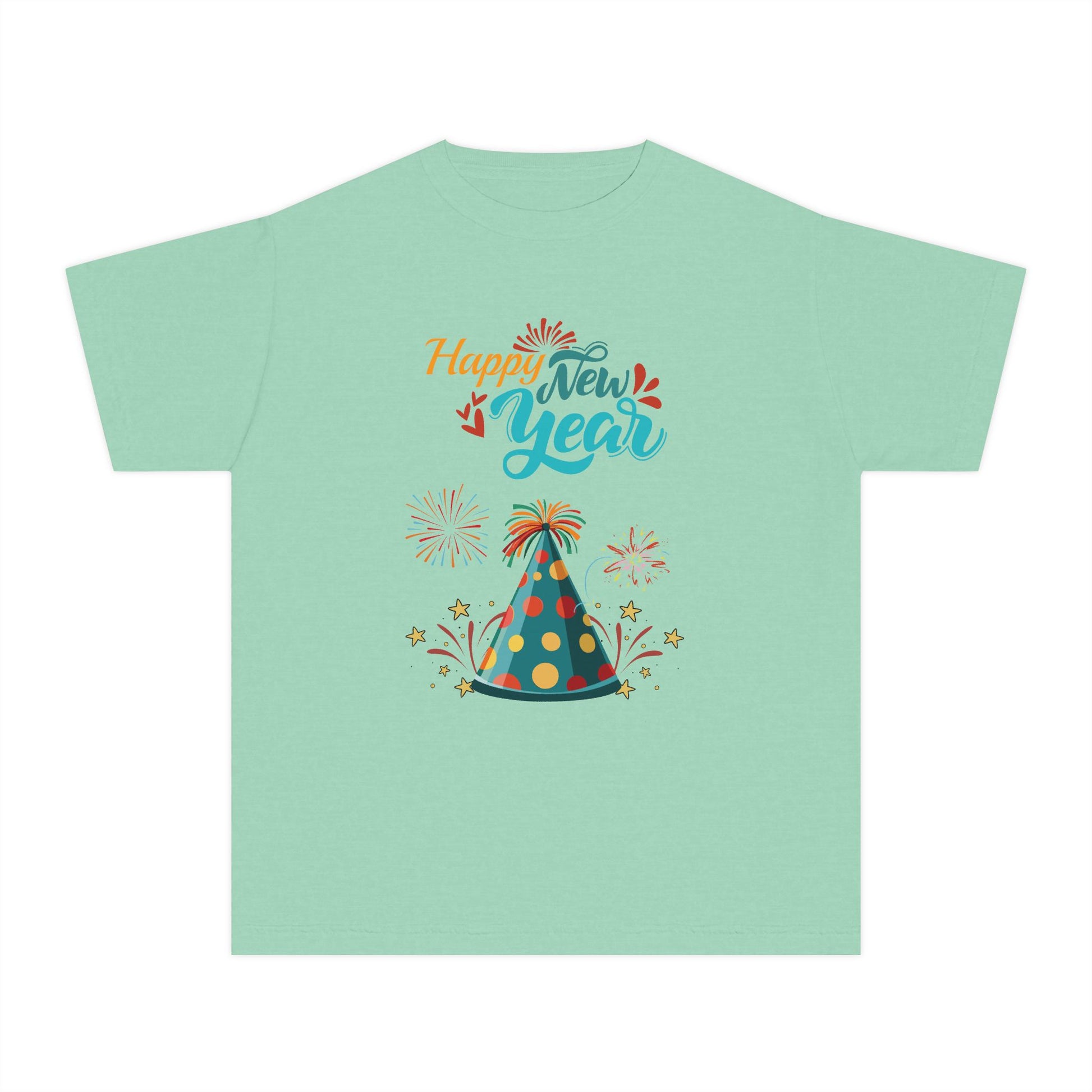 "Happy New Year -Party Hat and Fireworks" Kids/Youth T-Shirt . A Fun, Colorful Tee For The Kids To Wear When Celebrating The New Year!