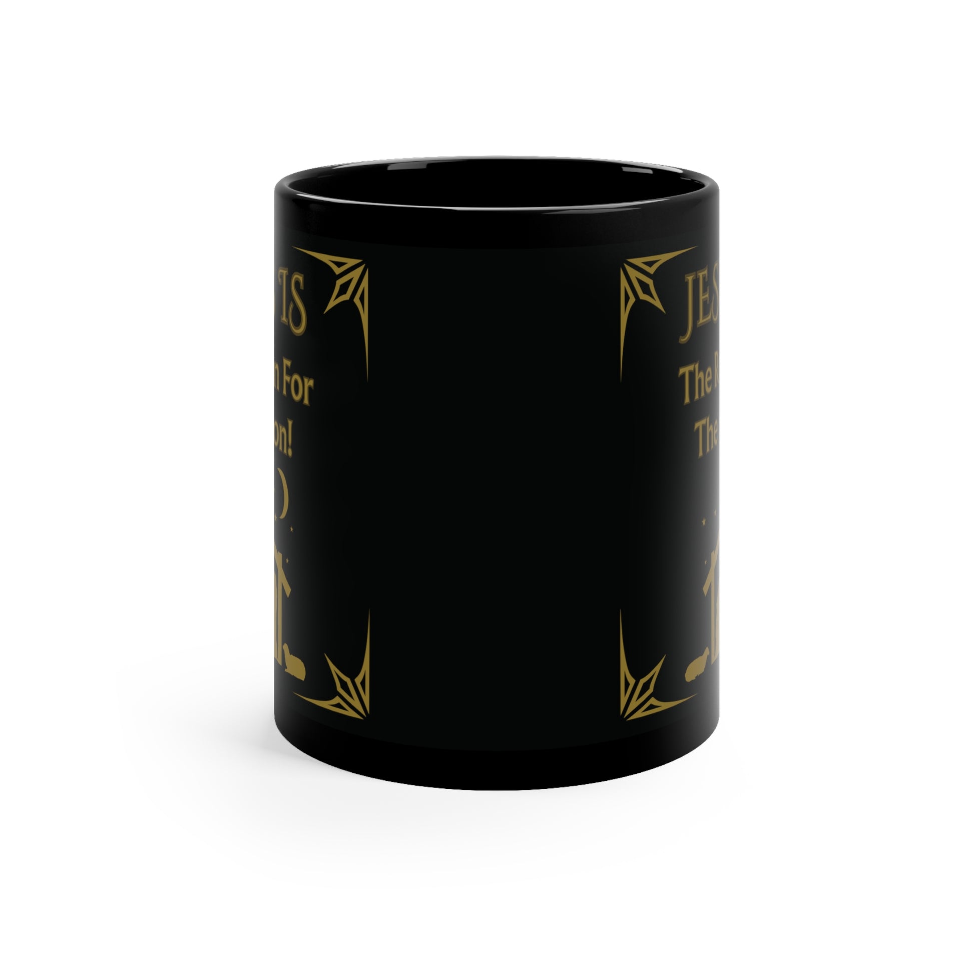 "Jesus Is The Reason For The Season!" Black Coffee Mug — 11oz Nativity Christmas Mug=Gold Desgn