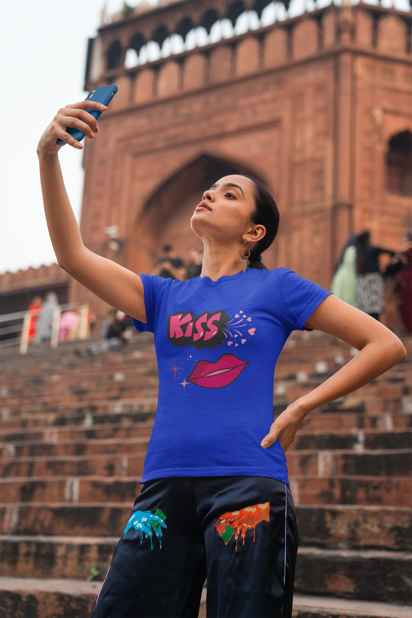 Bright, playful, and unapologetically bold — this fitted women's tee wears its pop art heart on its sleeve. The word KISS pops in vibrant, comic-style lettering above full-color, glossy lips that demand attention. Slip it on with high-waisted jeans for a night out or layer it under a blazer to flip daytime basics into something unexpectedly cheeky. The soft gray ground keeps the colors striking without shouting, while the semi-fitted cut flatters curves and moves with you. This tee carries a confident, tongue-in-cheek energy that fits into nights of laughter, gallery runs, and city streets that never sleep. This stylish women's Tee comes in 7 colors. Happy Valentine's Day!