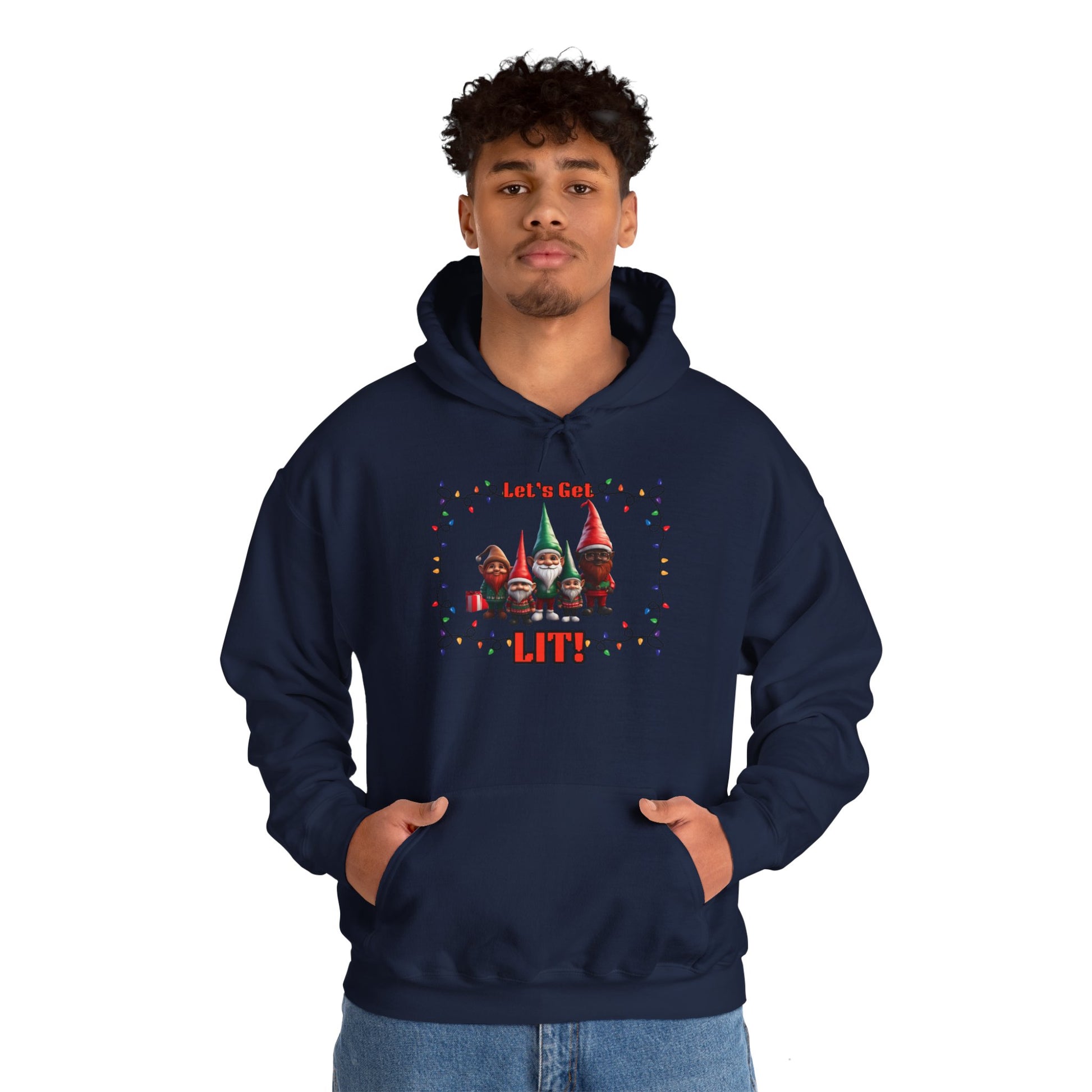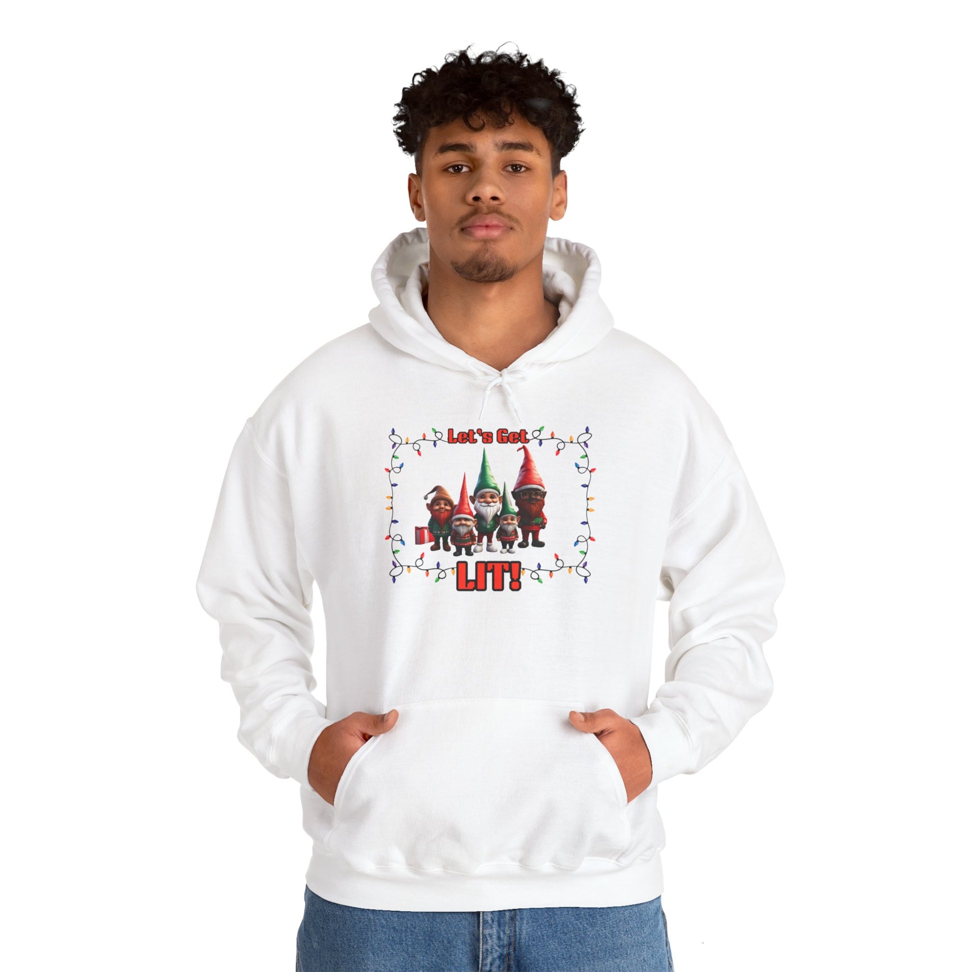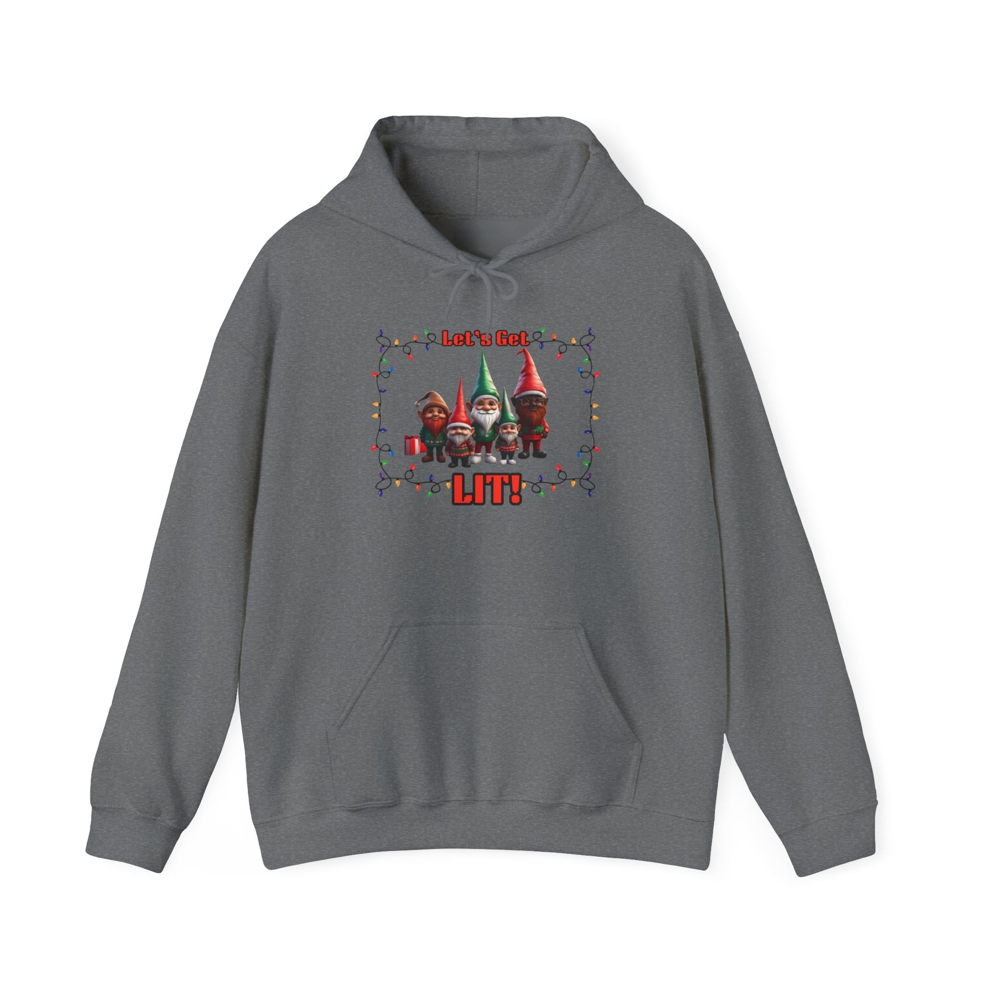 Our custom designed "Let's Get Lit #1" Pullover Hoodie, features a motley crew of adorable "gnome like" Santa's  helpers eager to help you bring Xmas cheer! This unisex, heavy blend hooded sweat shirt is relaxation itself. Made with a thick blend of cotton and polyester, it feels plush, soft and warm, a perfect choice for any cold day. In the front, the spacious kangaroo pocket adds daily practicality while the hood's drawstring is the same color as the base sweater for extra style points.  This hoodie comes in 7 different colors.  Happy Holidays!