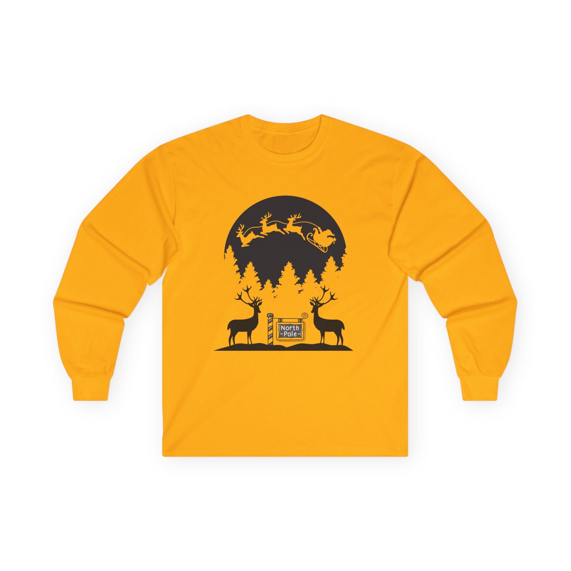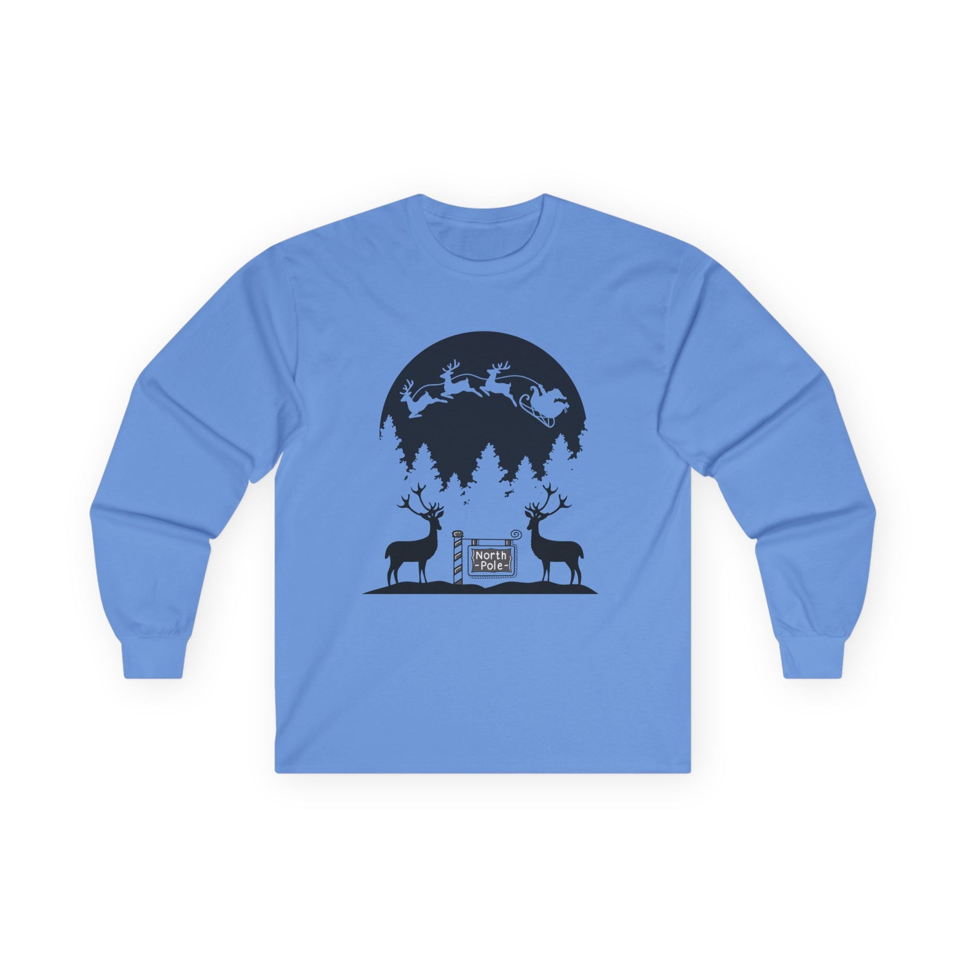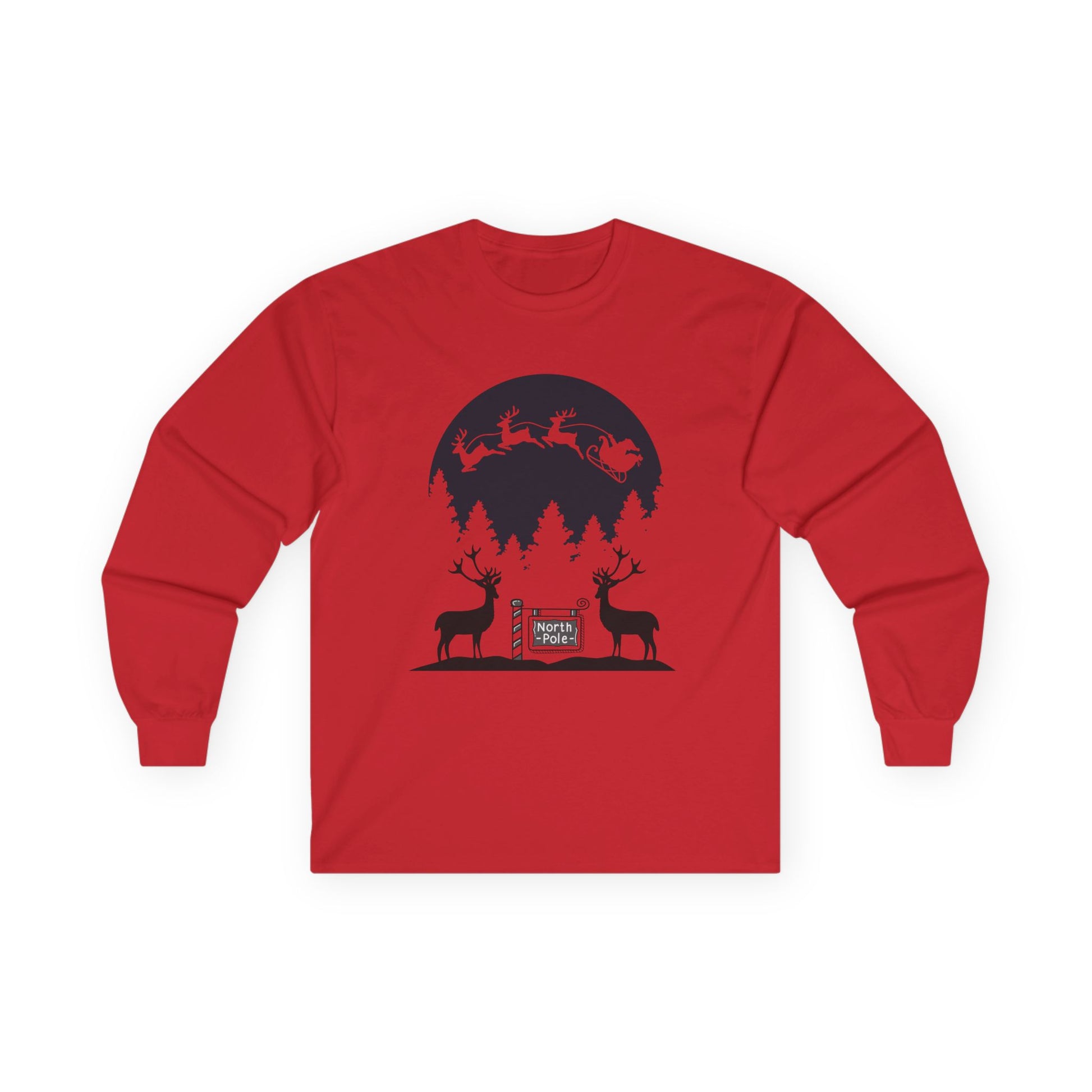 Our custom designed "Santa And His Reindeer" Unisex long-sleeve tee carries a quiet, snowy evening in its print — silhouettes of deer, fir trees, and a sleigh gliding across the moonlit sky. The thicker, vintage-feel cotton drapes with calm weight, while the tubular knit body and taped shoulders keep the shape soft and unfussy. Wear it for slow winter nights by the fire, late-night drives through pine country, or low-key holiday gatherings when you want comfort that still feels thoughtful. The graphic reads like a page from a midnight walk: peaceful, slightly nostalgic, and entirely wearable. This particular item comes in 7 colors Check our store for the same design in an infant sized short sleeve tee and make it a Family Affair!