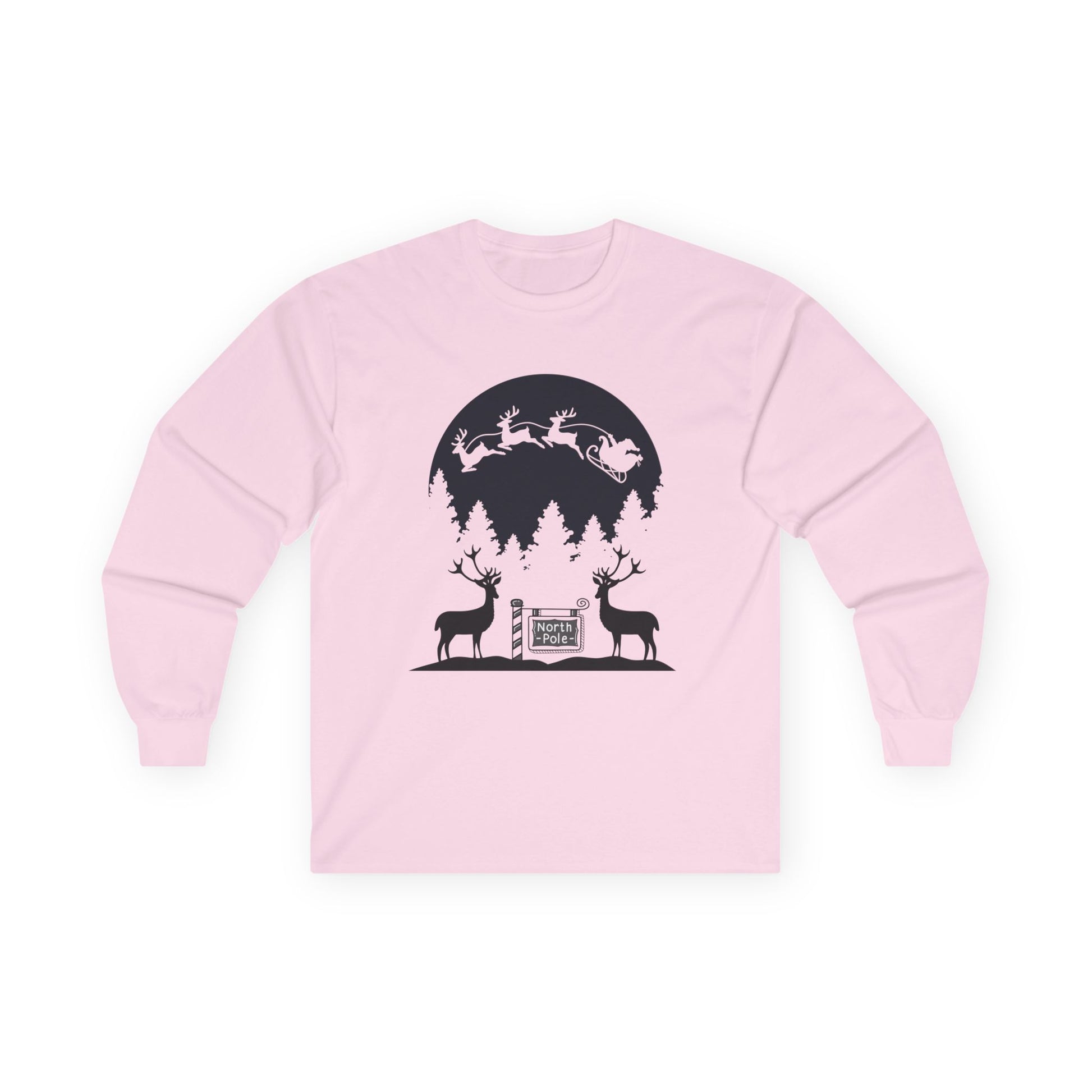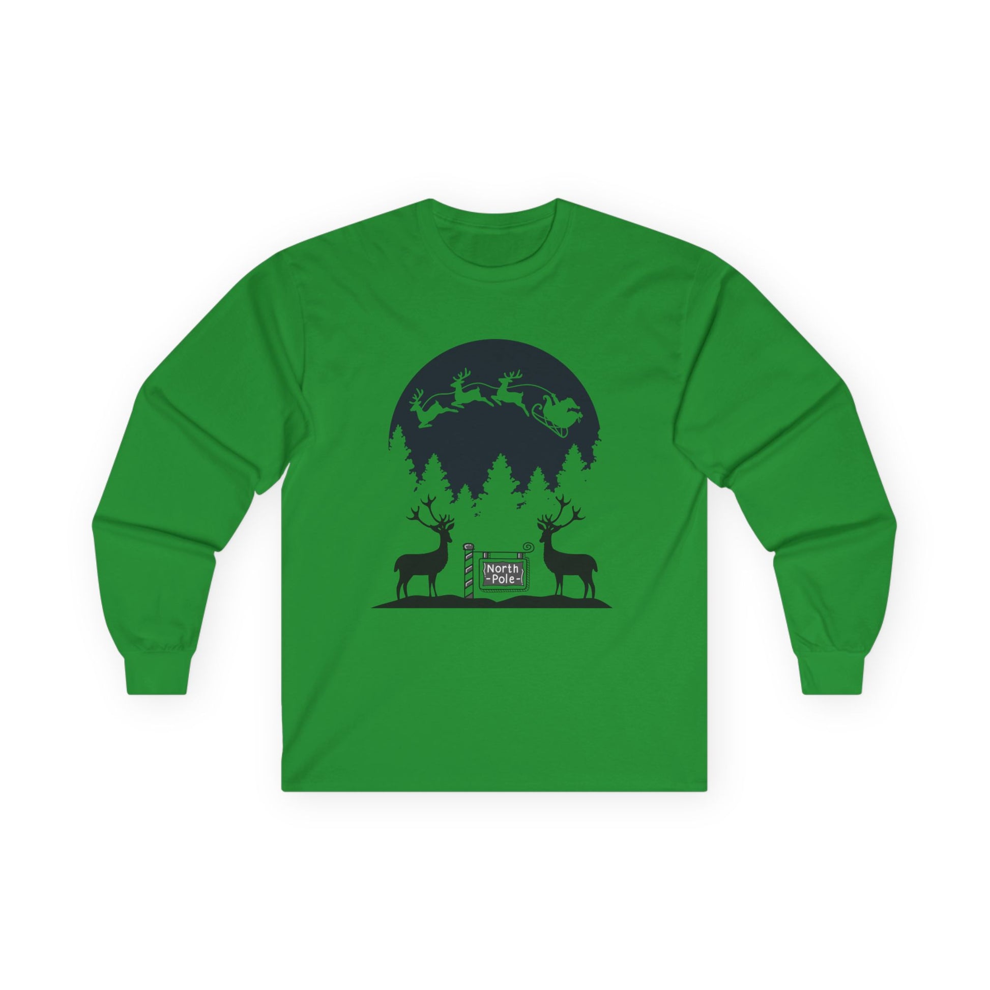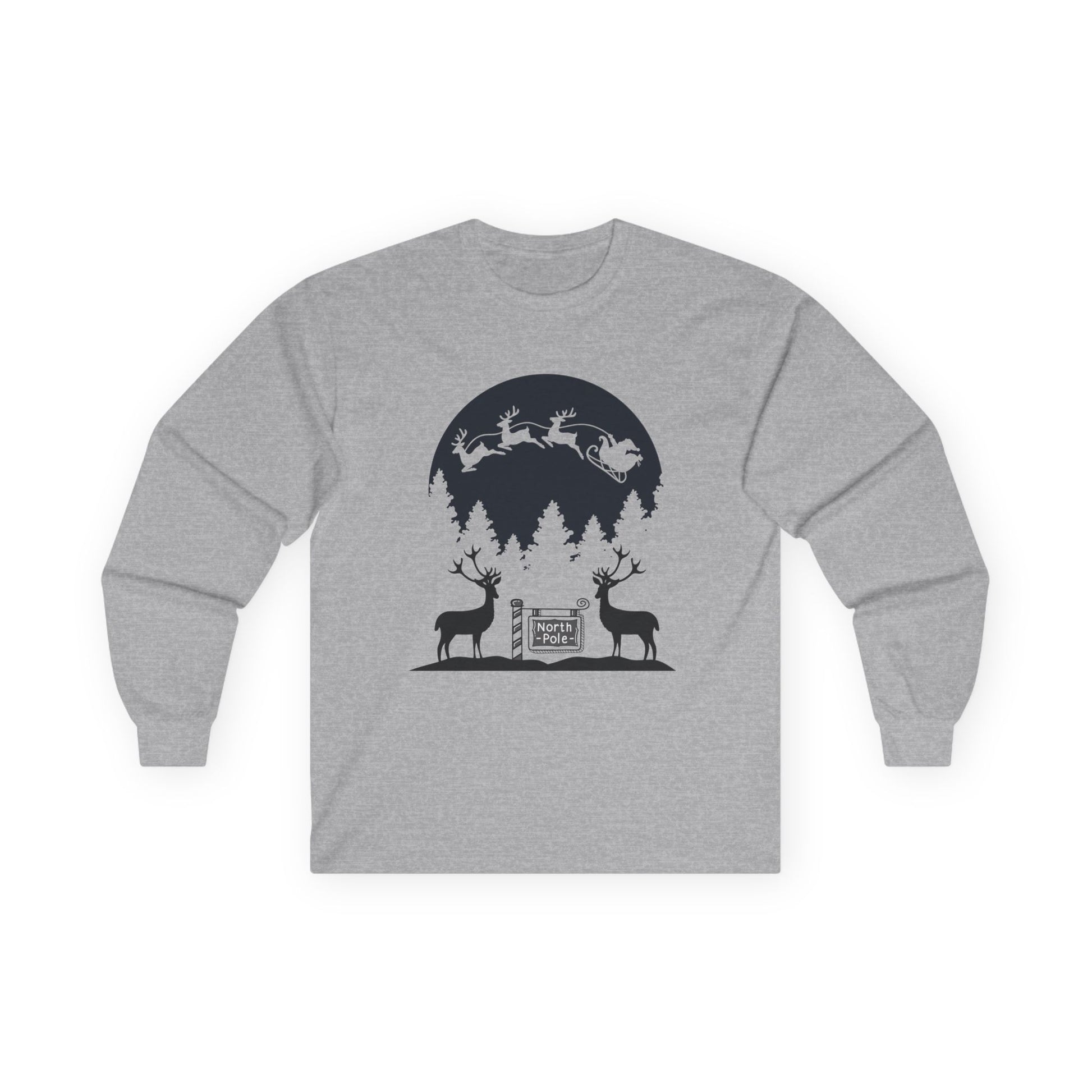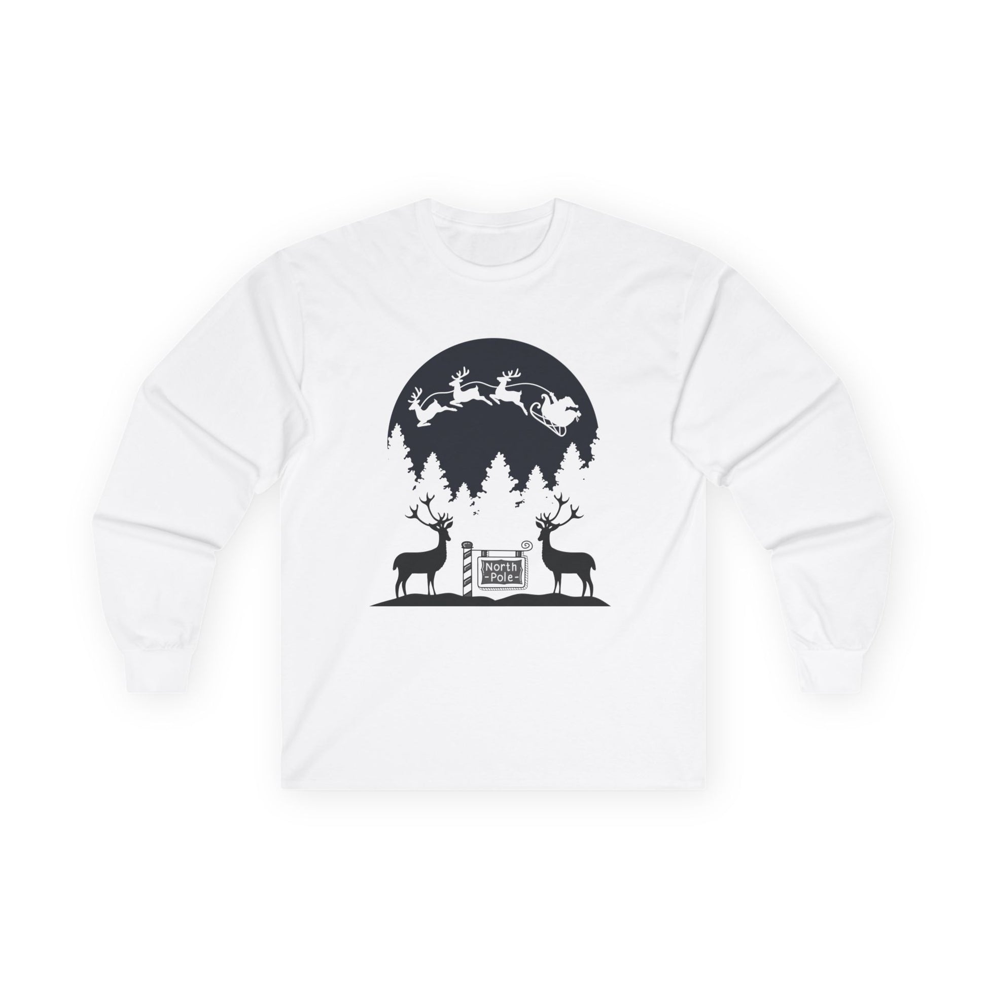 Our custom designed "Santa And His Reindeer" Unisex long-sleeve tee carries a quiet, snowy evening in its print — silhouettes of deer, fir trees, and a sleigh gliding across the moonlit sky. The thicker, vintage-feel cotton drapes with calm weight, while the tubular knit body and taped shoulders keep the shape soft and unfussy. Wear it for slow winter nights by the fire, late-night drives through pine country, or low-key holiday gatherings when you want comfort that still feels thoughtful. The graphic reads like a page from a midnight walk: peaceful, slightly nostalgic, and entirely wearable. This particular item comes in 7 colors Check our store for the same design in an infant sized short sleeve tee and make it a Family Affair!