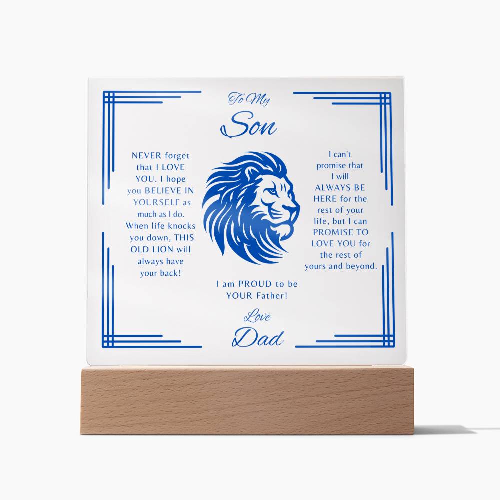 Your SON may cry when he sees this beautiful acrylic plaque from Dad! The mighty lion is a symbol of fatherhood, leadership, protection and strength! This piece looks great with or without a lighted base. Place it in your son's room where he can see it when he falls asleep and upon awakening in the morning so he knows that you, DAD, will always be there for him -no matter what ! It can also serve as an AWESOME night light at the bedside when lit.