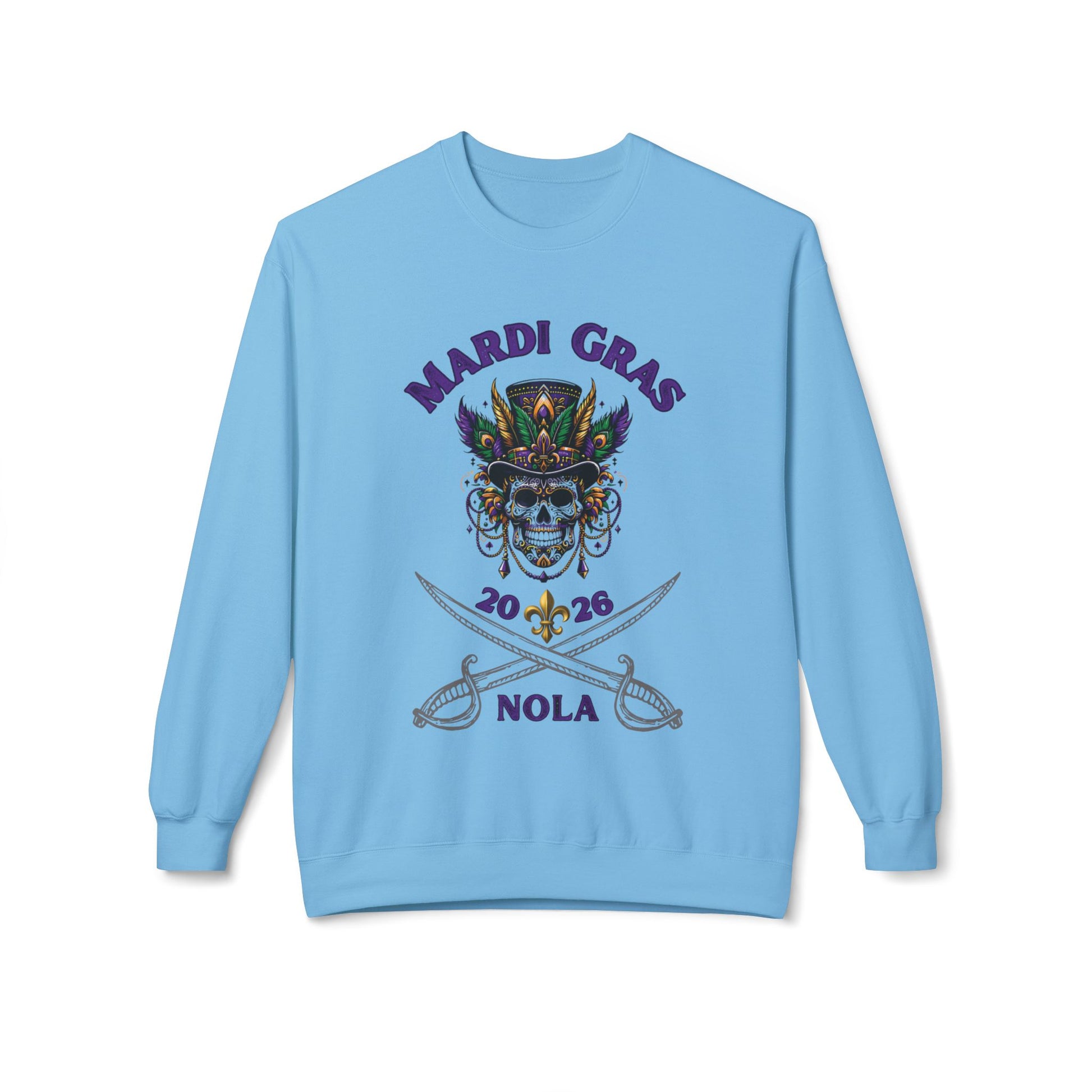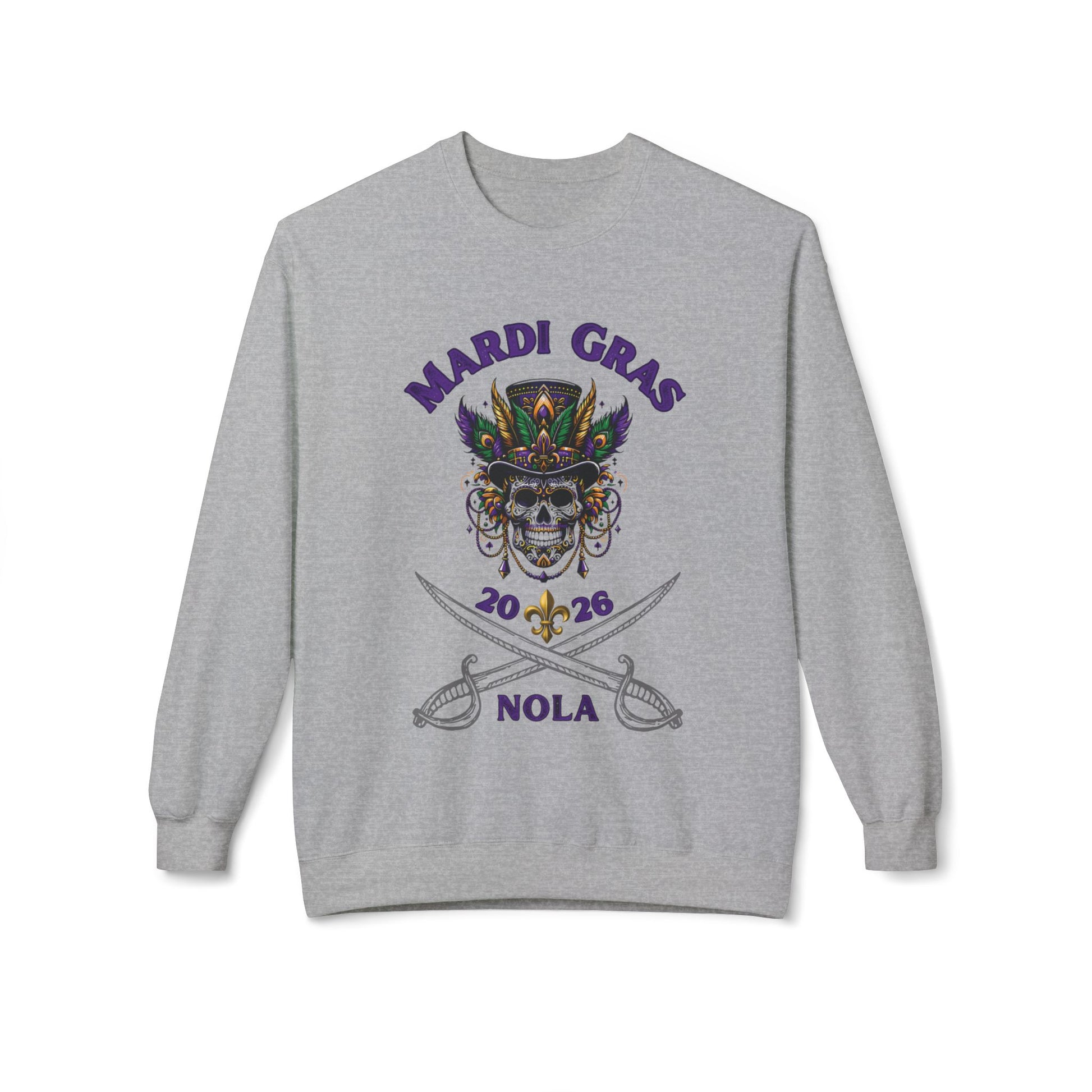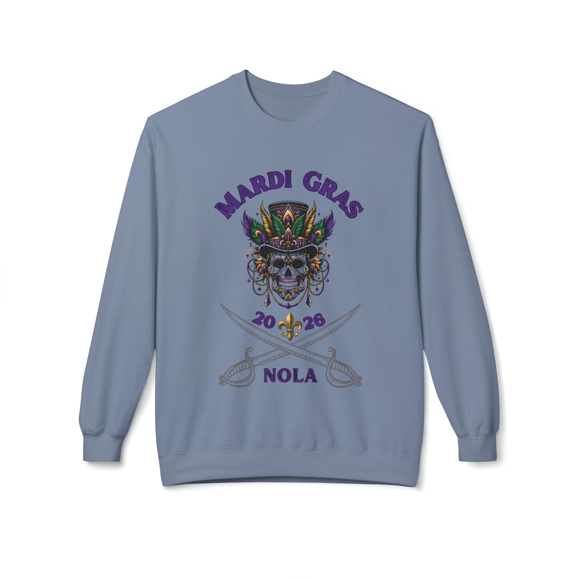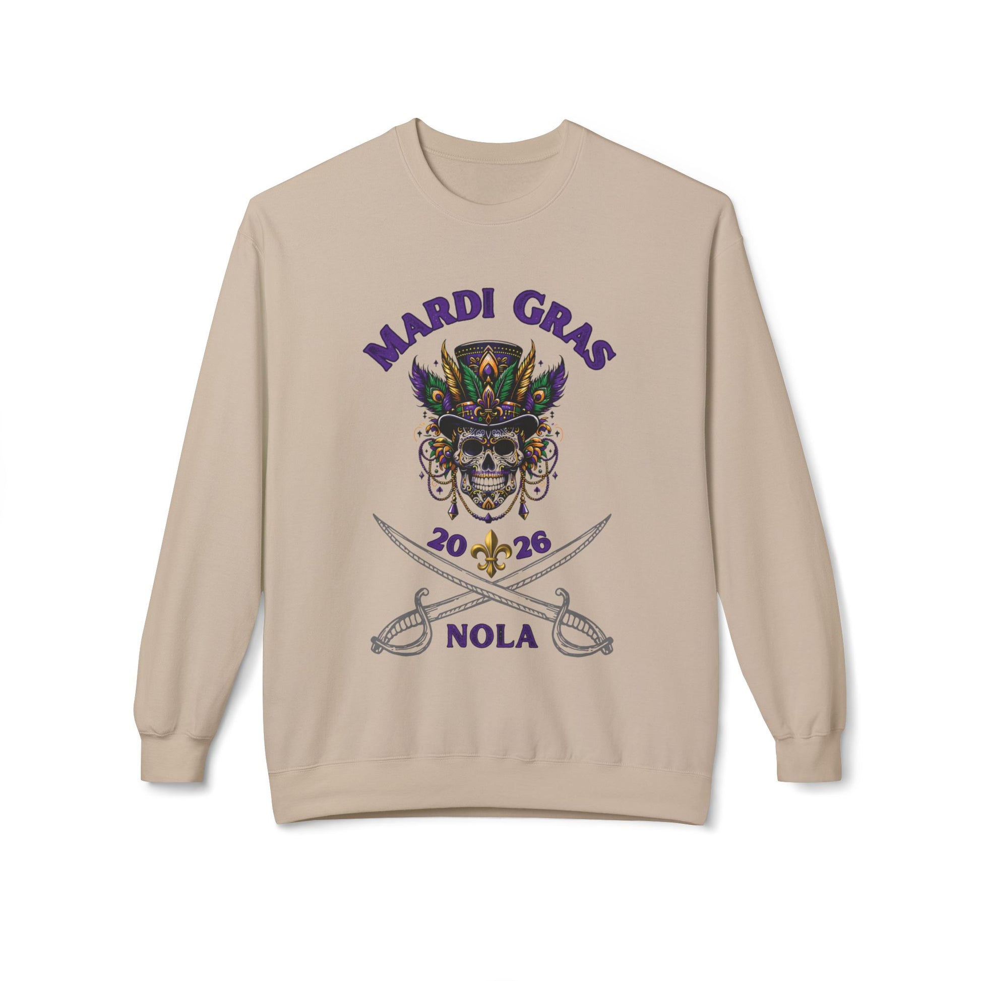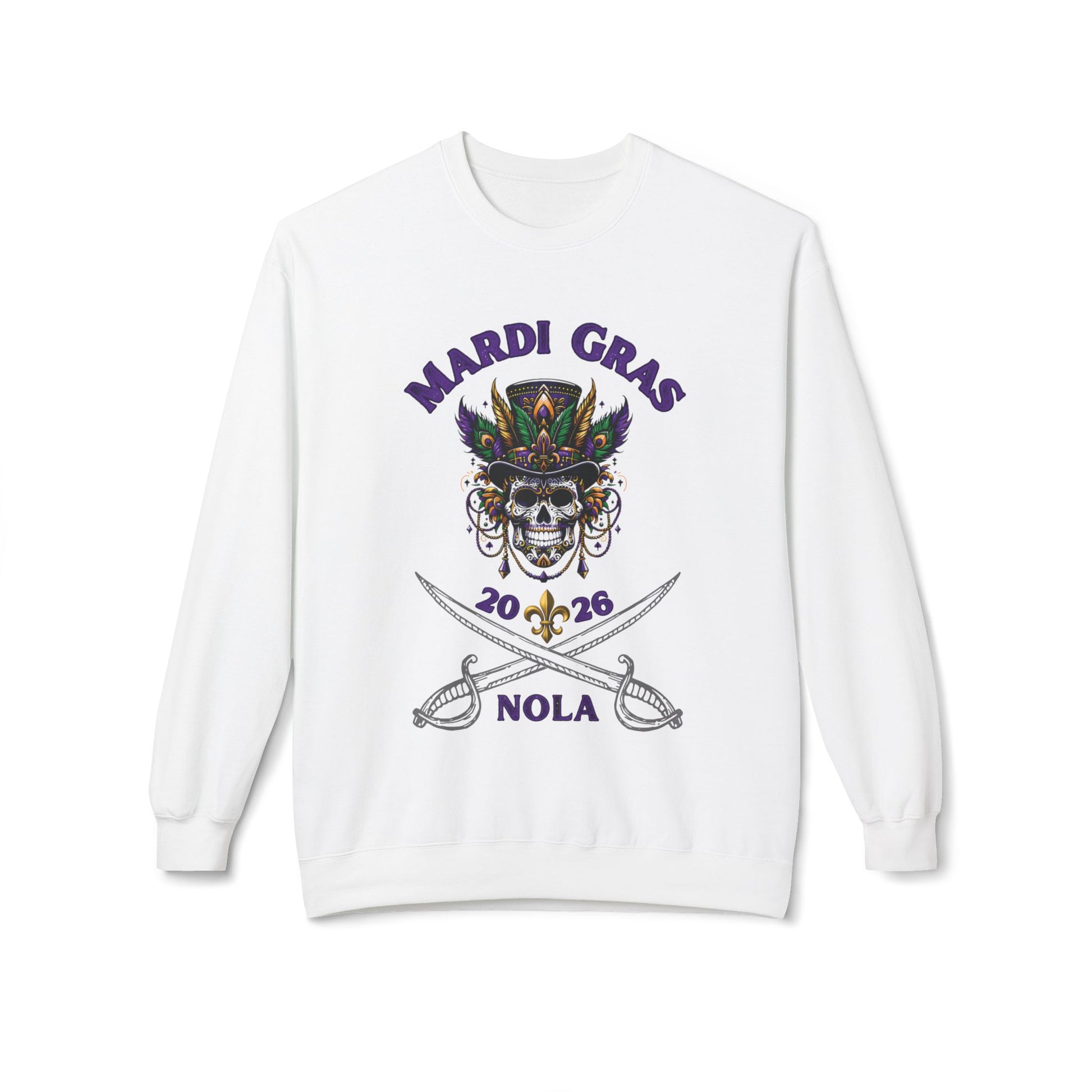 Our "Mardi Gras 2026 Voodoo Pirate" midweight crewneck sweatshirt, brings the spirit of NOLA’s Mardi Gras into a comfortable, lived-in pullover. The front artwork — a festive skull wearing a beaded feathered mask, crossed sabers, fleur-de-lis and bold “Mardi Gras 2026 NOLA” lettering — sits like a badge of celebration. It’s soft against the skin, with a roomy, relaxed fit thanks to dropped shoulders and a classic crew silhouette. Wear it while wandering parade routes, warming up after a late-night brass set, or layering over a tee for a chilly French Quarter morning. The feel is familiar and rugged, with clean lines that let the colorful, carnival-inspired design take center stage. This item comes in 8 colors. Happy Mardi Gras!