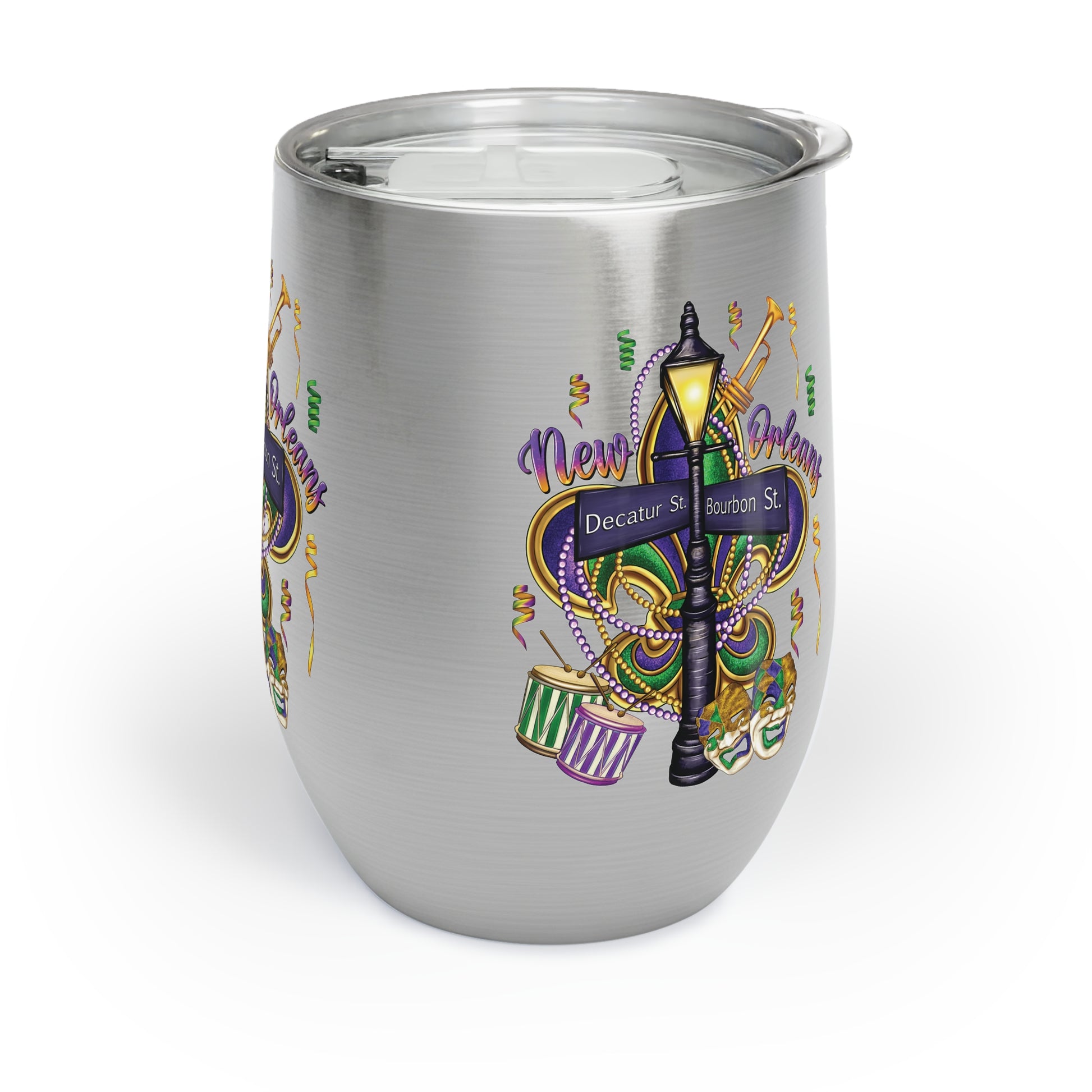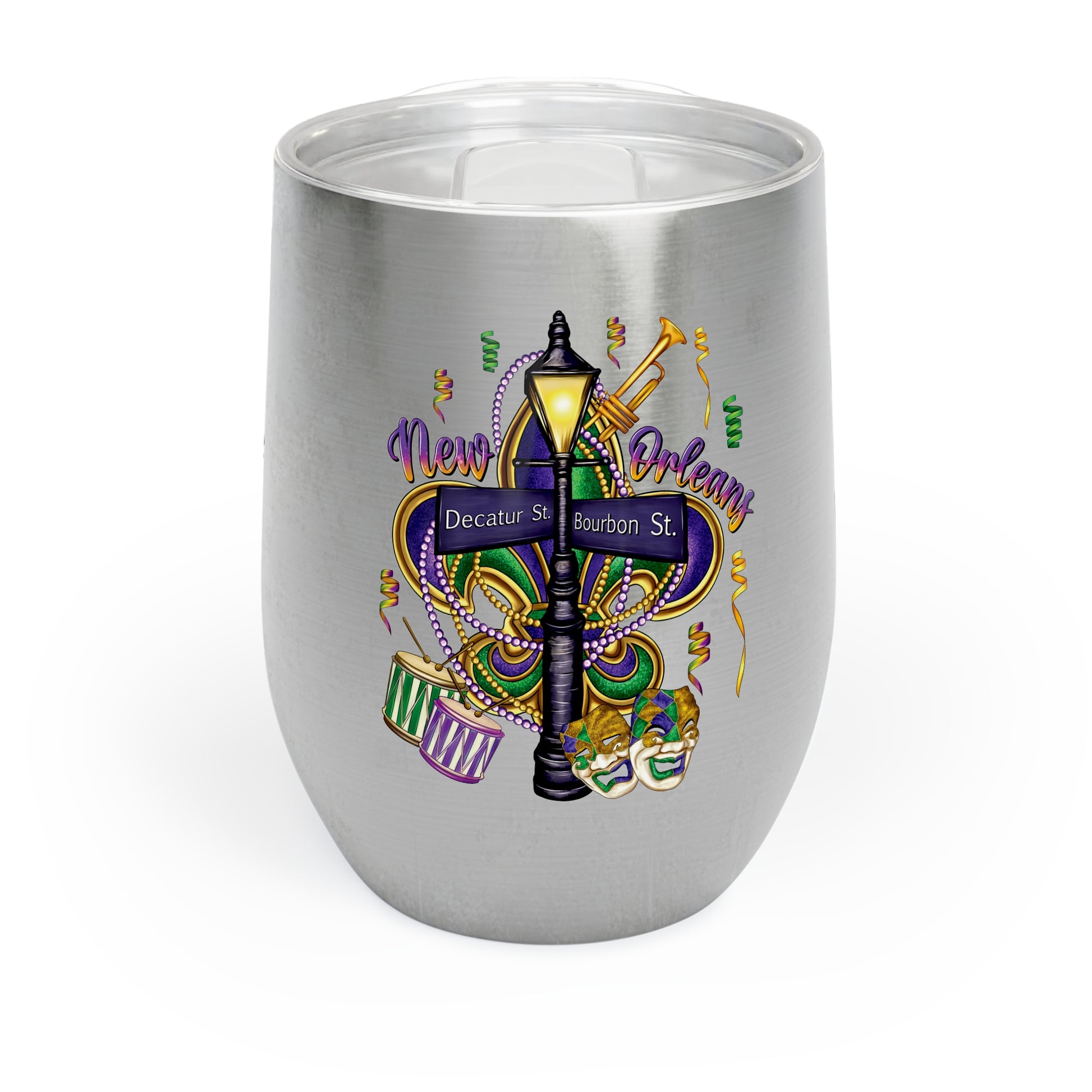 Sip the spirit of the French Quarter. This 12oz stainless steel wine tumbler wears a vibrant, full-wrap Mardi Gras scene — bright beads, wrought-iron balconies, and confetti-strewn streets — so every pour feels like a stroll down Bourbon Street at dusk. It’s light in hand, insulating your drink for hours while the clear lid keeps splashes at bay. Bring it to a porch party, a gallery opening, or an intimate evening at home and let the colors and rhythm of New Orleans set the mood.