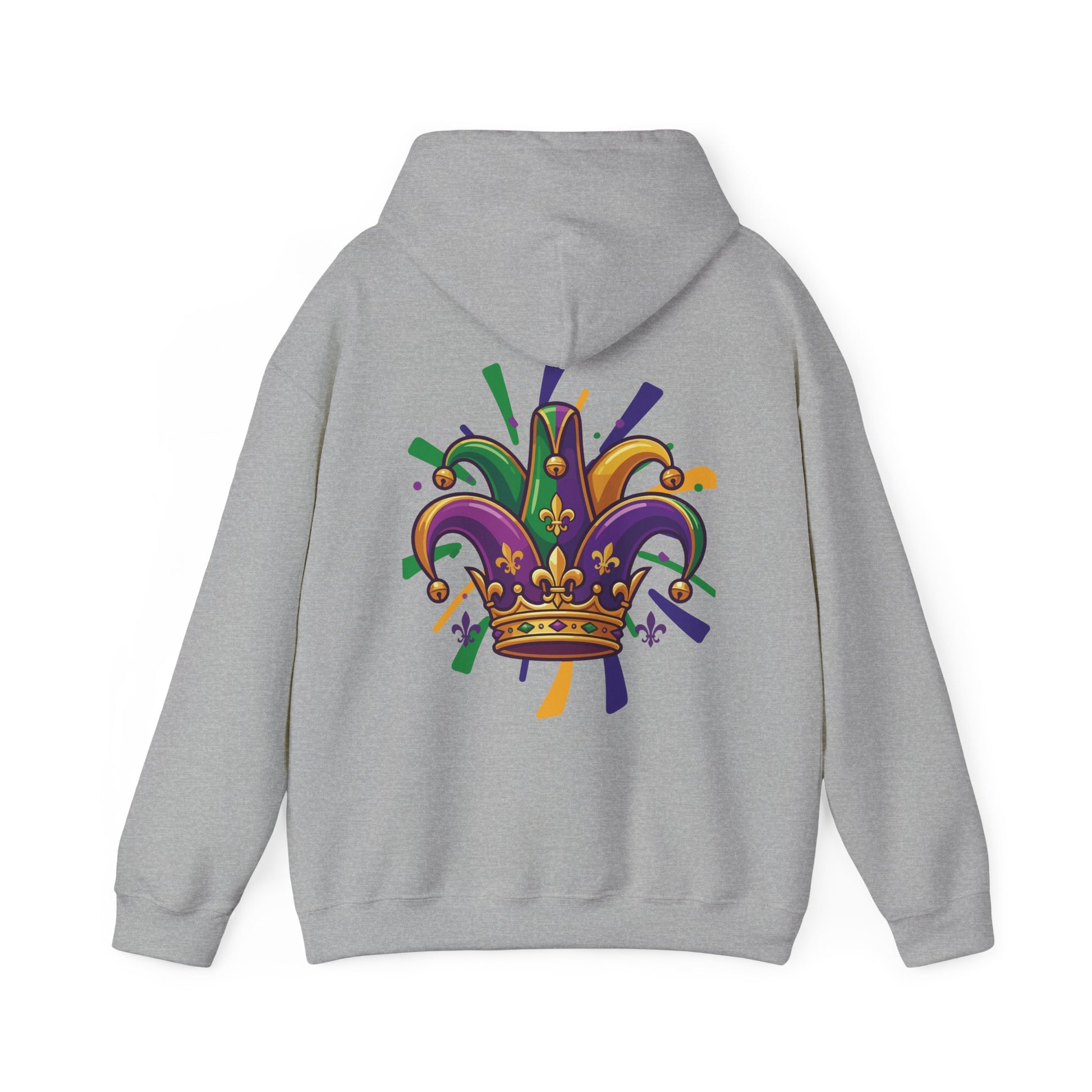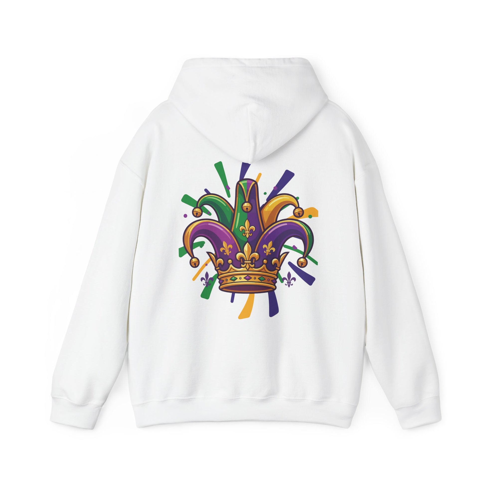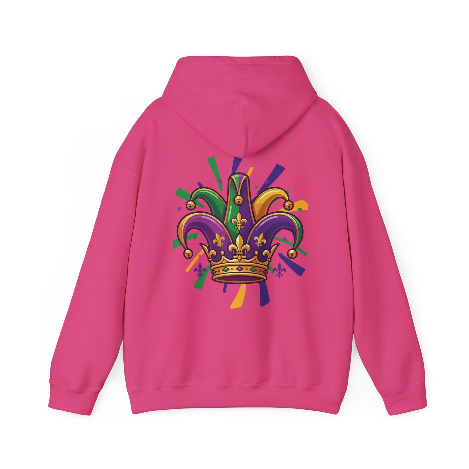 "Mardi Gras Jester Crown" Unisex Pullover Hoodie. Festive Colorful Front Chest & Bold Back Designs Make This THE Hoodie Of Carnival Season!