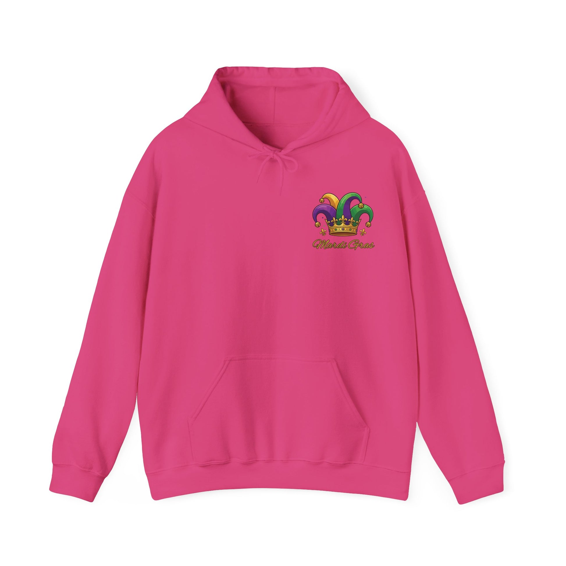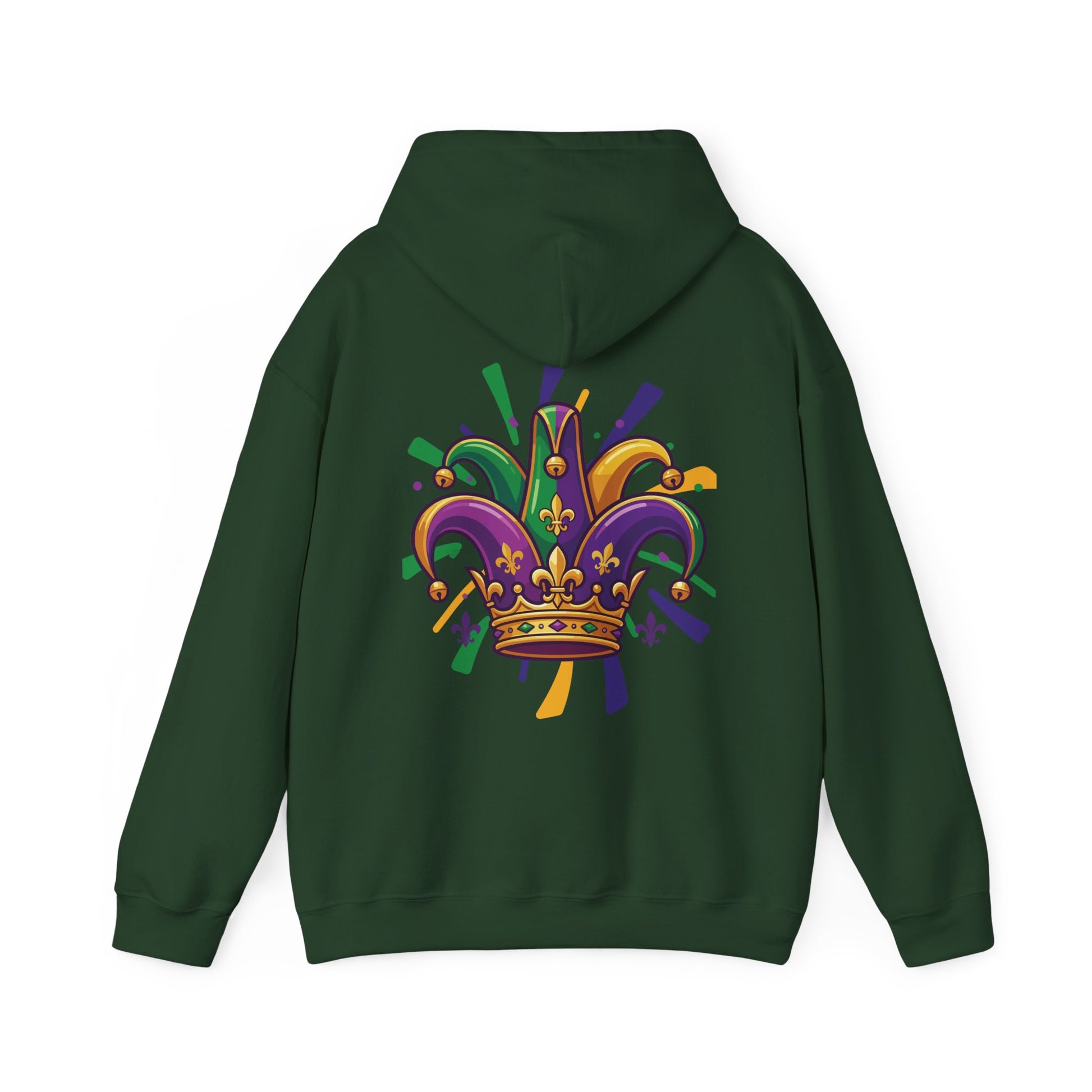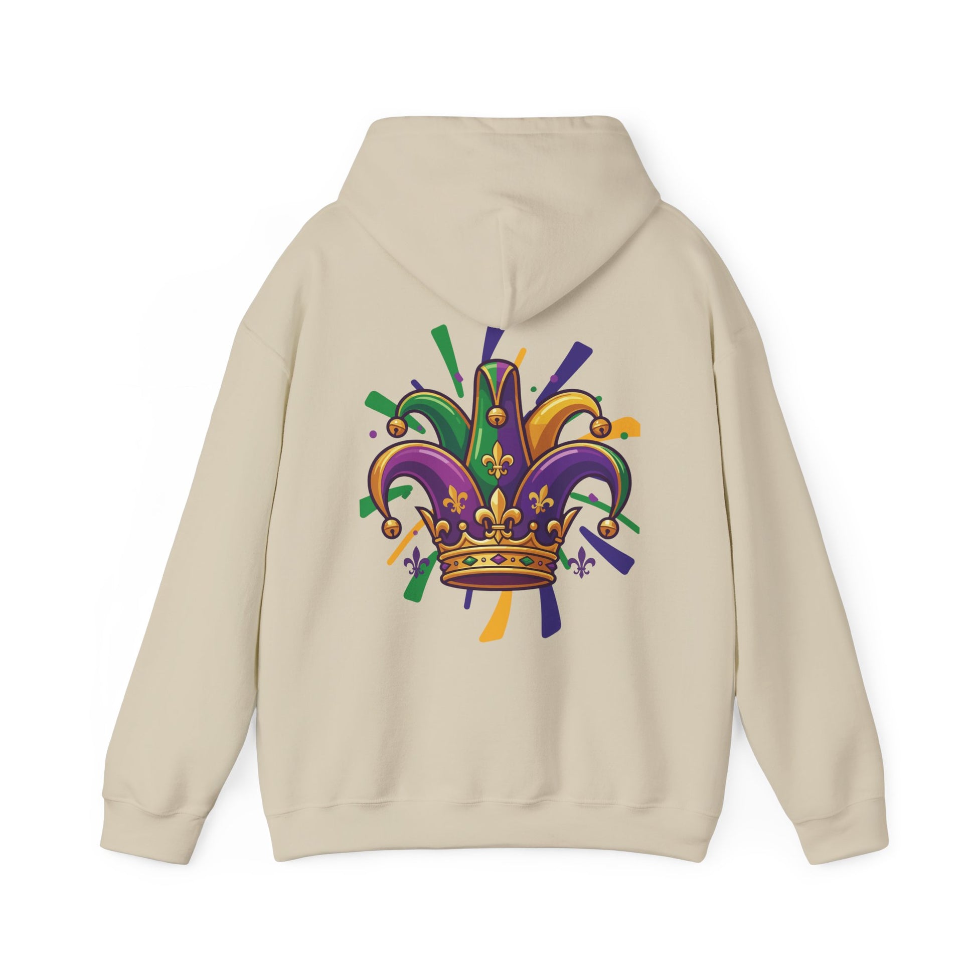 "Mardi Gras Jester Crown" Unisex Pullover Hoodie. Festive Colorful Front Chest & Bold Back Designs Make This THE Hoodie Of Carnival Season!