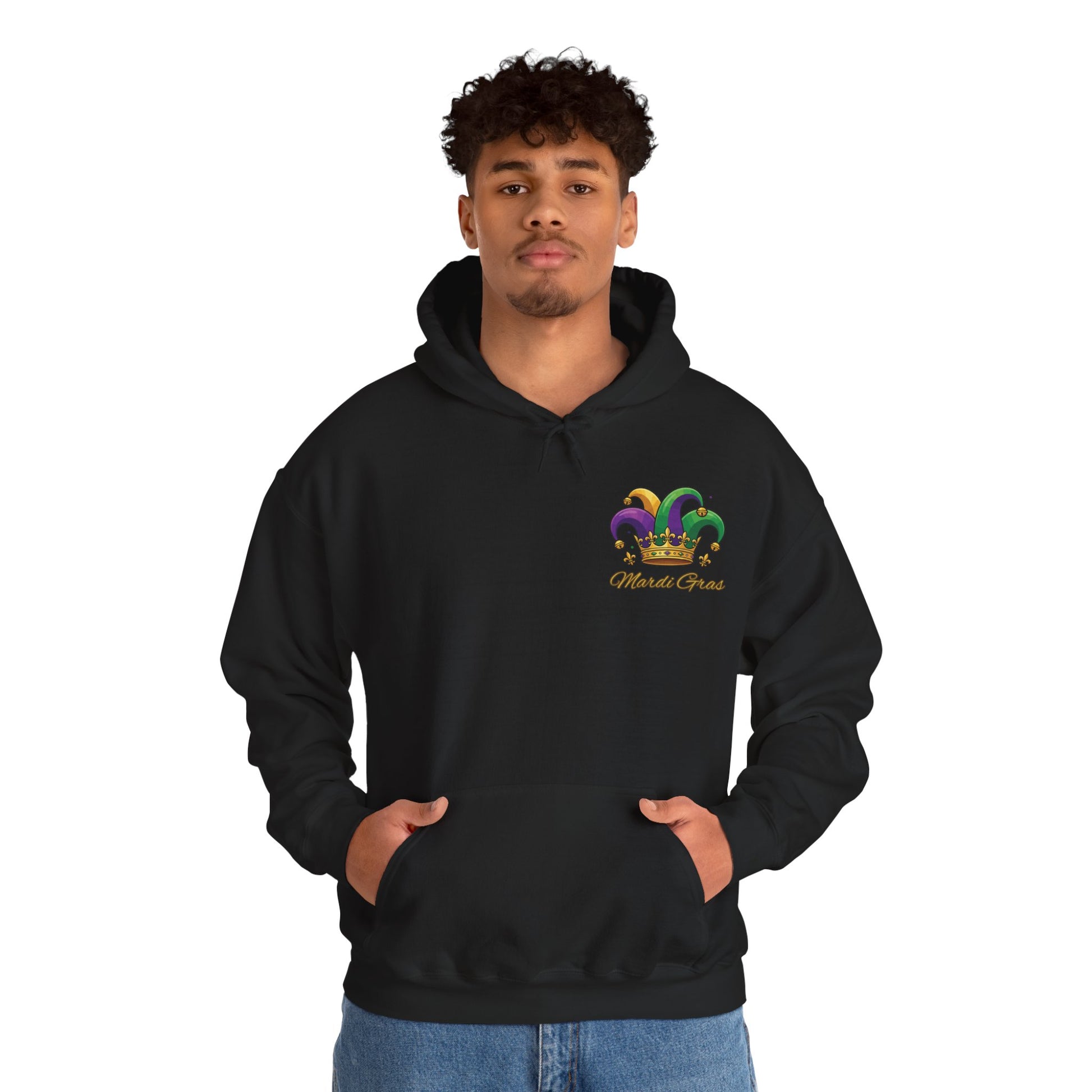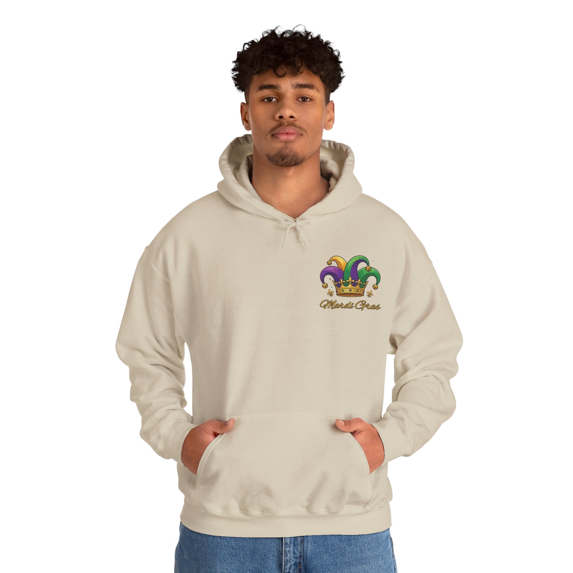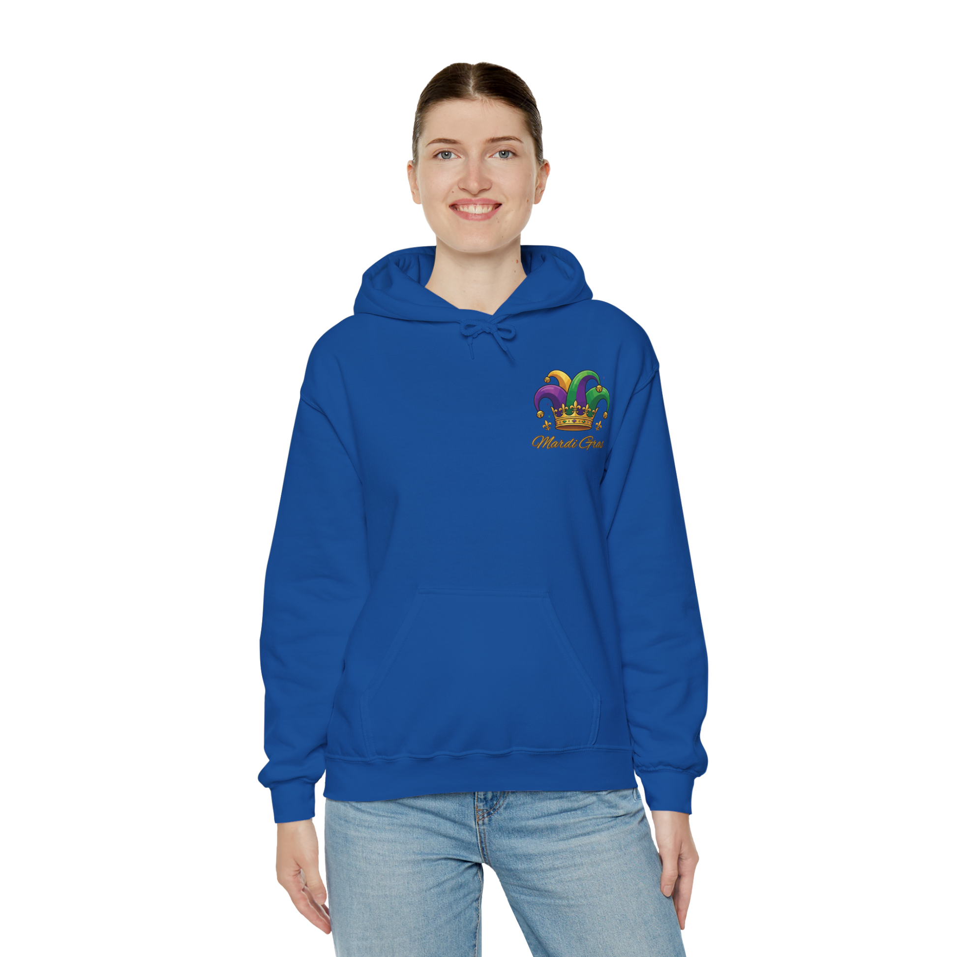 Bright, playful, and unapologetically festive — Our "Mardi Gras Jester Crown" Unisex hoodie wears Mardi Gras like a celebration. A small colorful jester crown sits over the left chest, a hint of sparkle and mischief, while a bold, larger-than-life jester crown blooms across the back. It’s for people who love parade days, late-night second lines, and the crackle of confetti underfoot. The medium-heavy cotton/poly blend holds vibrant prints without losing softness, and the double-lined hood with color-matched drawcord keeps the look polished and cozy. Slip it on walking down Bourbon Street or for a quiet house party; the design reads joyful from both near and far, and the roomy kangaroo pocket keeps your hands warm between beads and cheers. This festive hoodie comes in 12 different colors. Happy Mardi Gras!