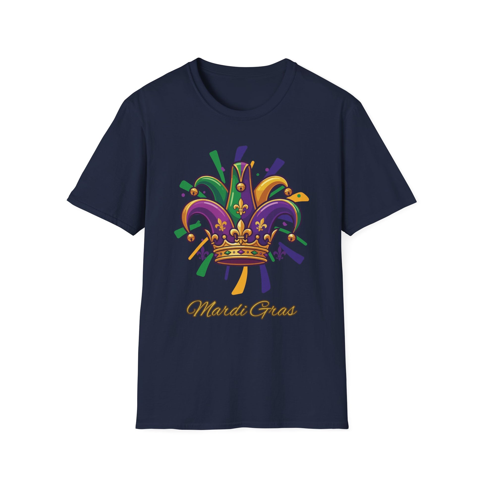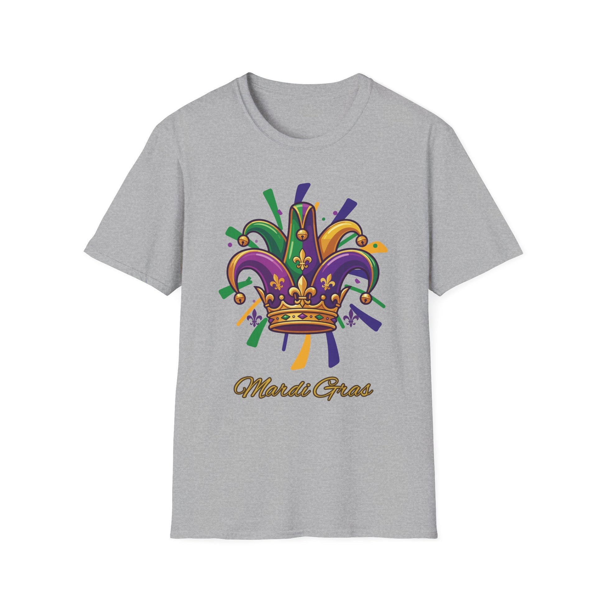 Bright, playful, and full of movement — Our "Mardi Gras Jester Crown" tee brings festival energy into everyday wear. The colorful jester crown graphic pops against a soft, breathable cotton that moves with you. Picture heading out to a block party or slipping it on for a casual night of beads and brass: it feels light, keeps its shape, and carries the joyful, mischievous spirit of Mardi Gras without being over the top. Comfortable ribbed collar and stabilized shoulders mean the shirt keeps looking sharp through parades, late-night celebrations, and relaxed mornings after. Subtle natural flecks on the unprocessed color option add a handcrafted vibe that fits right in with parade costumes or bohemian streetwear. Wear it with denim, layer under a jacket, or toss it on for a themed get-together — it’s built to celebrate the moment and age gracefully with you. Happy Mardi Gras!