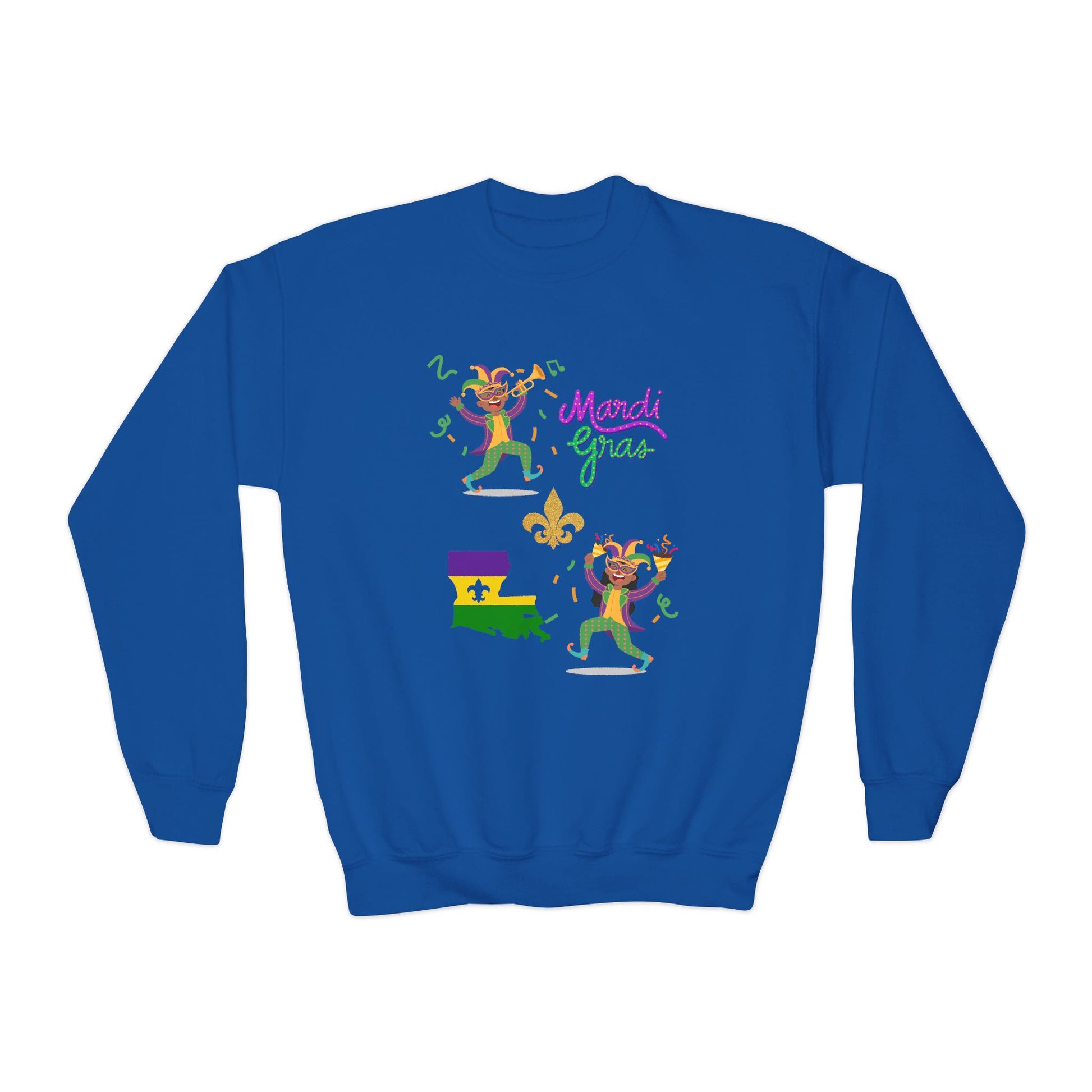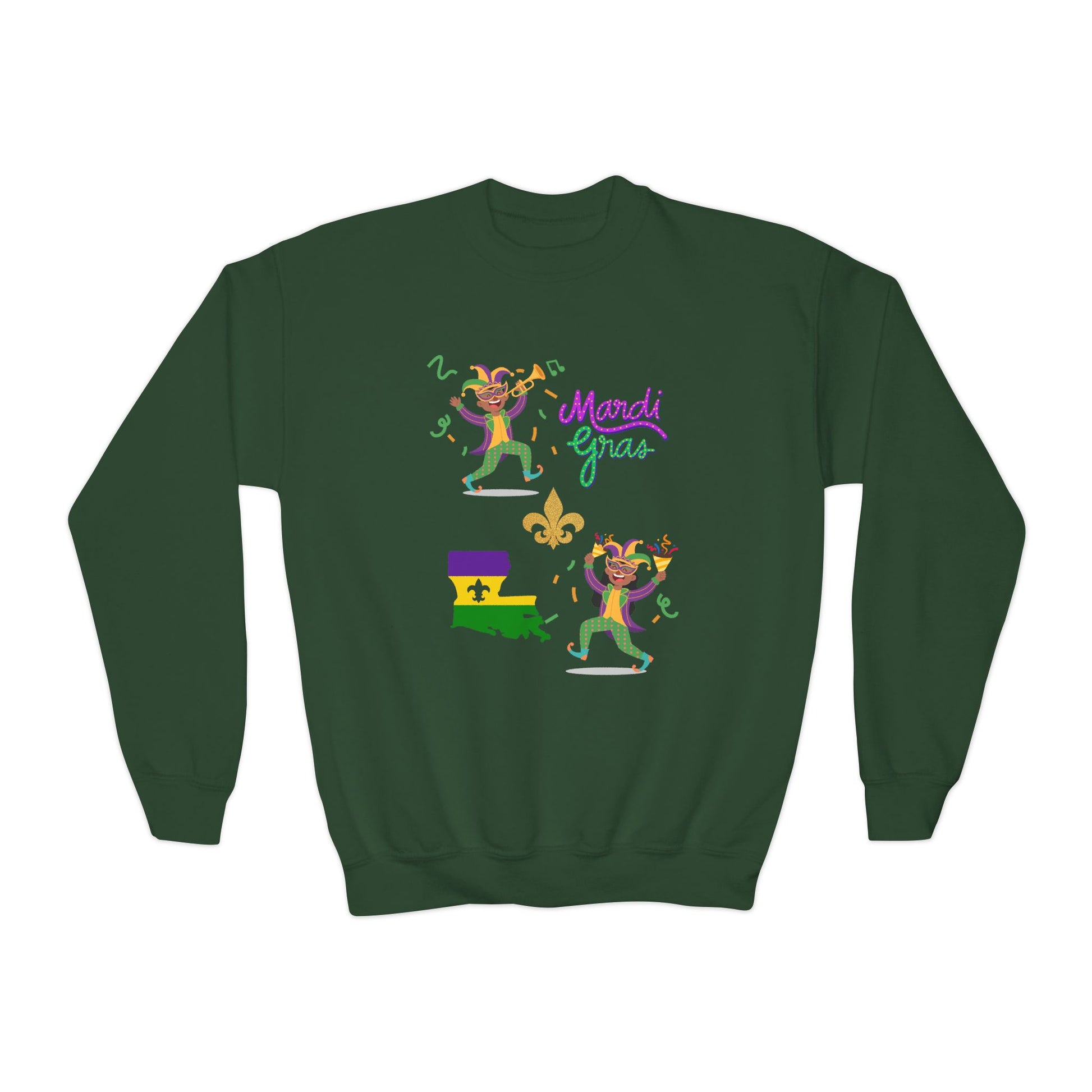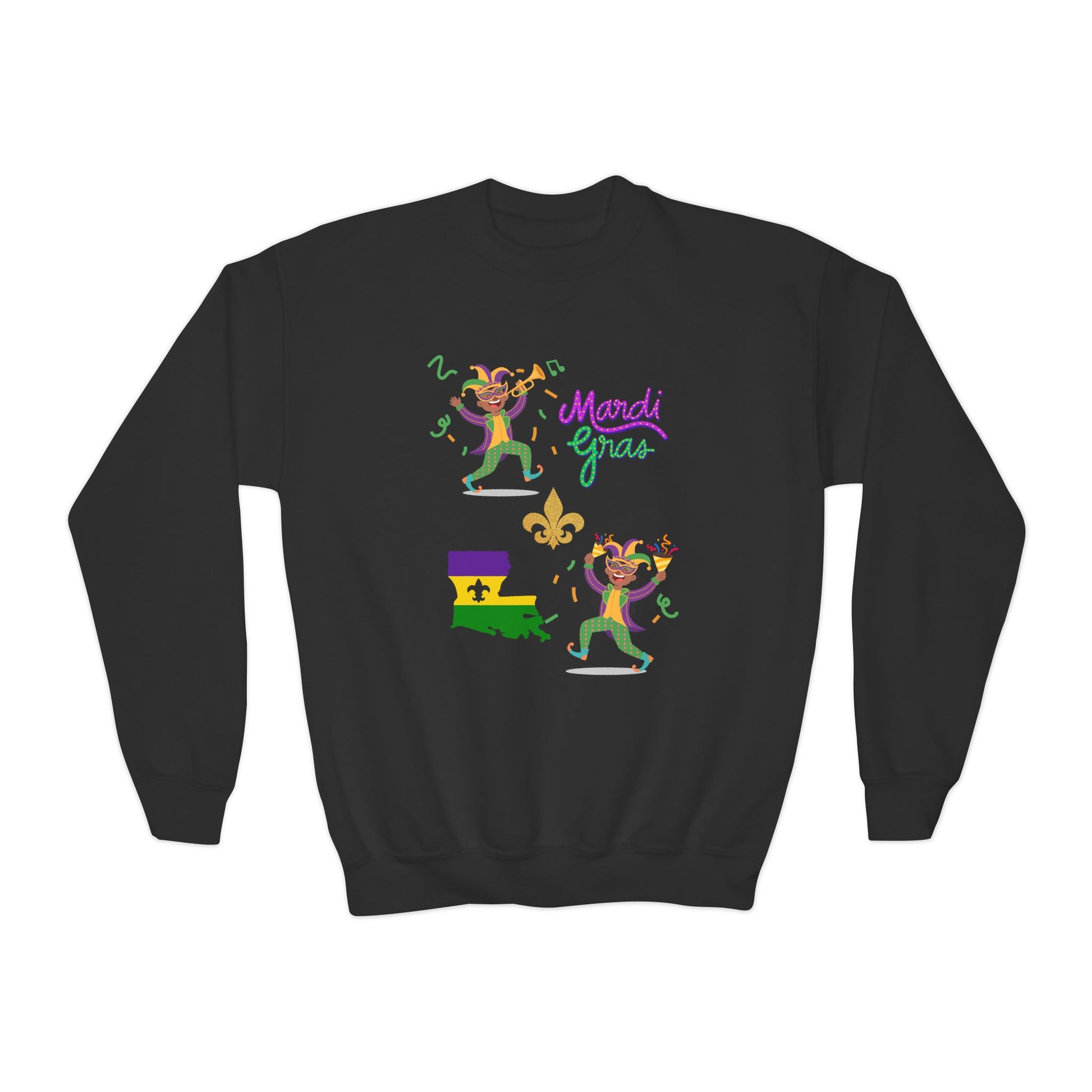"Mardi Gras Kids" Youth Crewneck Sweatshirt — Colorful Beads, Jester Costumes & The State Of Louisiana all in Classic Mardi Gras Colors - Ready For The Parades!