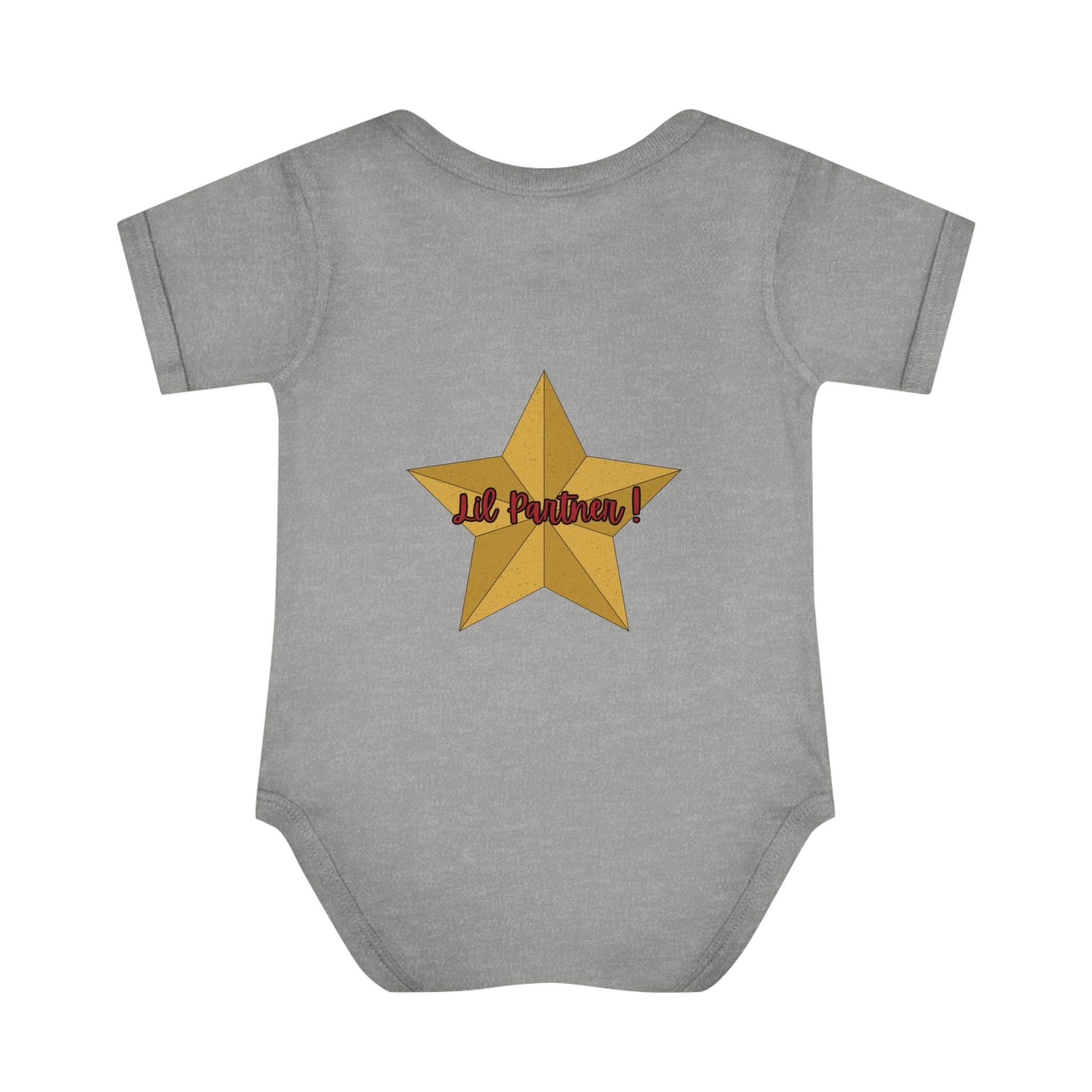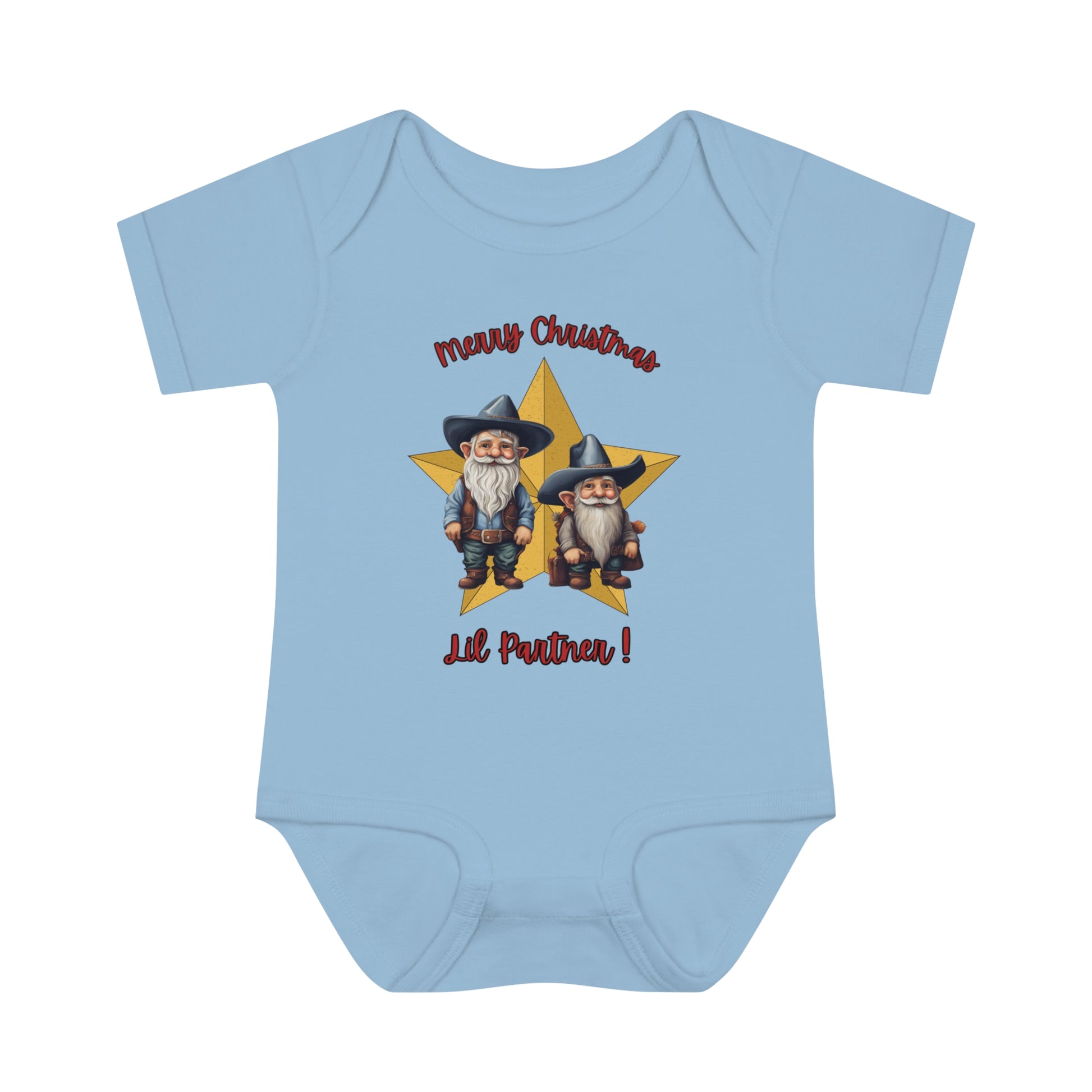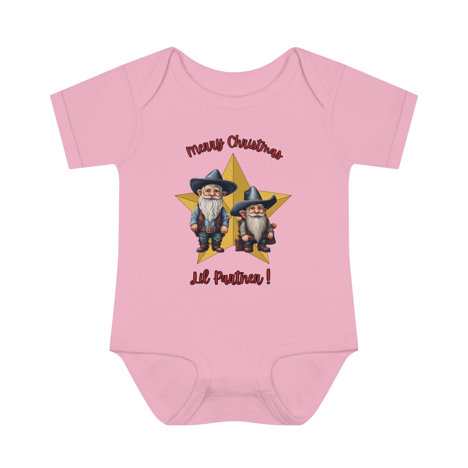 Our "Merry Christmas Lil Partner!" onsie is a cute way to give "western flare" to the little one's holiday apparel. Our custom designed onsie has print on the front and the back, featuring two adorable western "gnome like" fellas and the Texas star. The ring-spun cotton majority of the infant baby rib bodysuit makes it supremely soft. A one-piece design, these bodysuits have lap shoulders. These are made of 100% ring-spun cotton for solid colors. Other color variations include polyester.This item comes in 8 color choices. Happy Holidays!