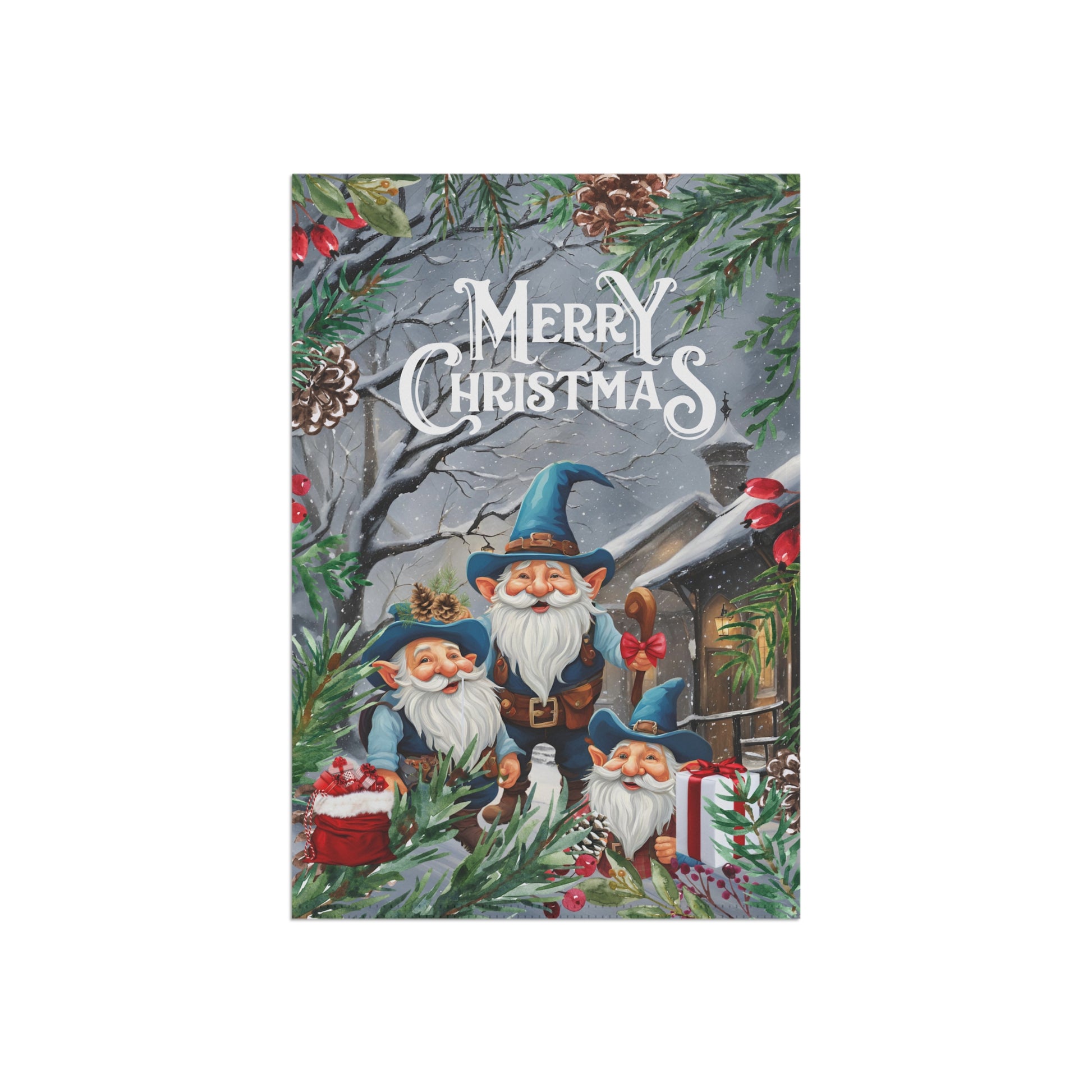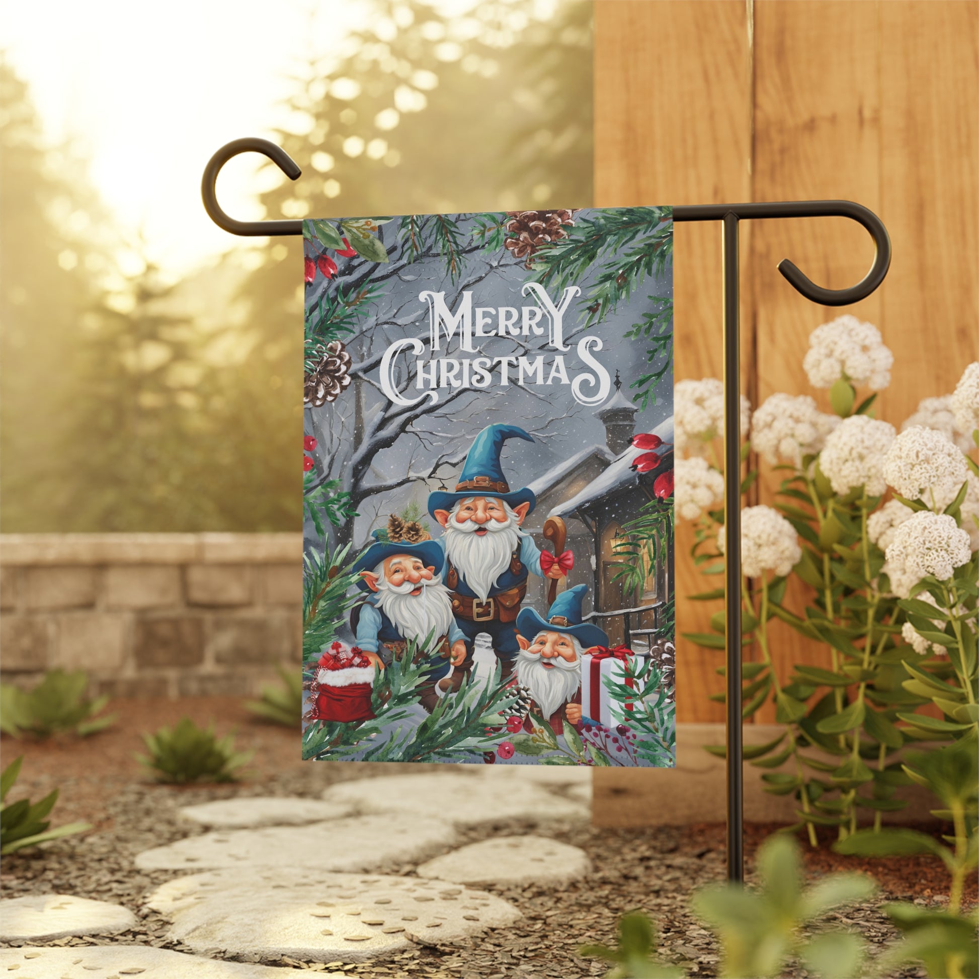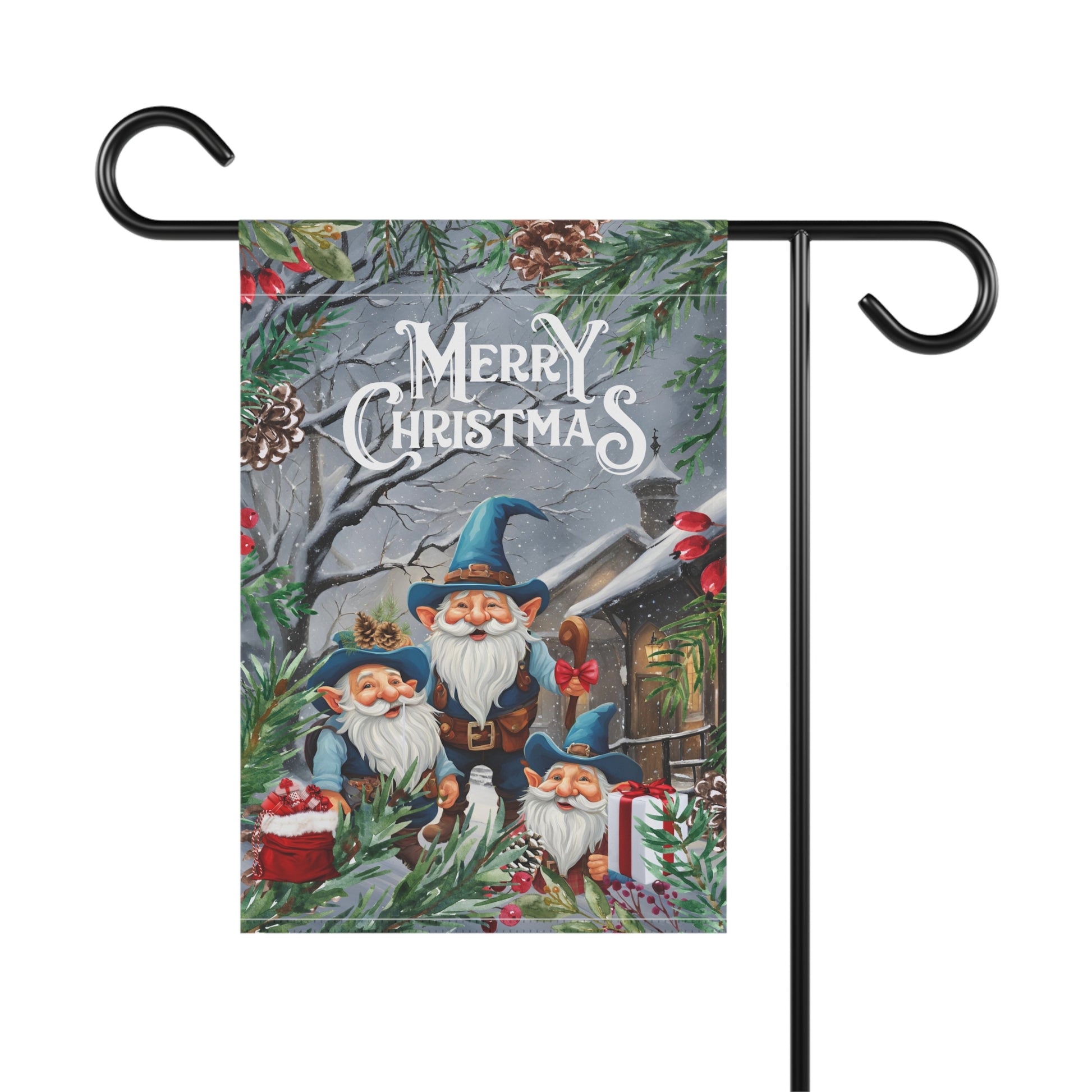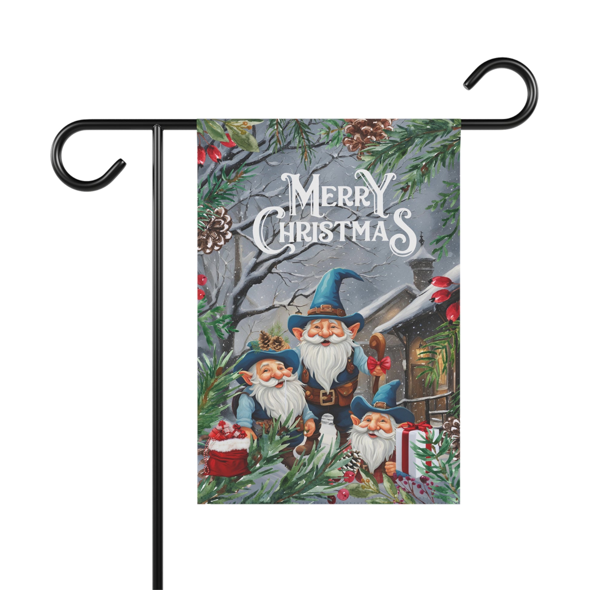Decorate your lawn or garden with our custom designed, "Merry Christmas" banner. Featuring adorable, Western style, "Merry Xmas Gnomes"-ready to help Santa deliver gifts in the snow! Made with lightweight yet highly durable poly poplin-canvas fabric, these banners come ins size 12'' × 18'' and feature a top sleeve for easy placement on poles. This design comes in crisp detail and color on both sides of the flag. Happy Holidays!