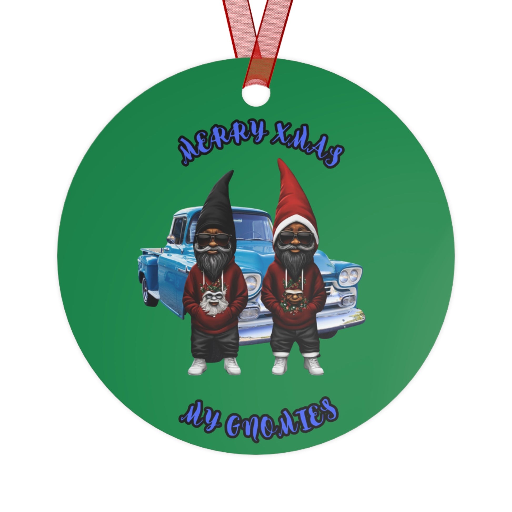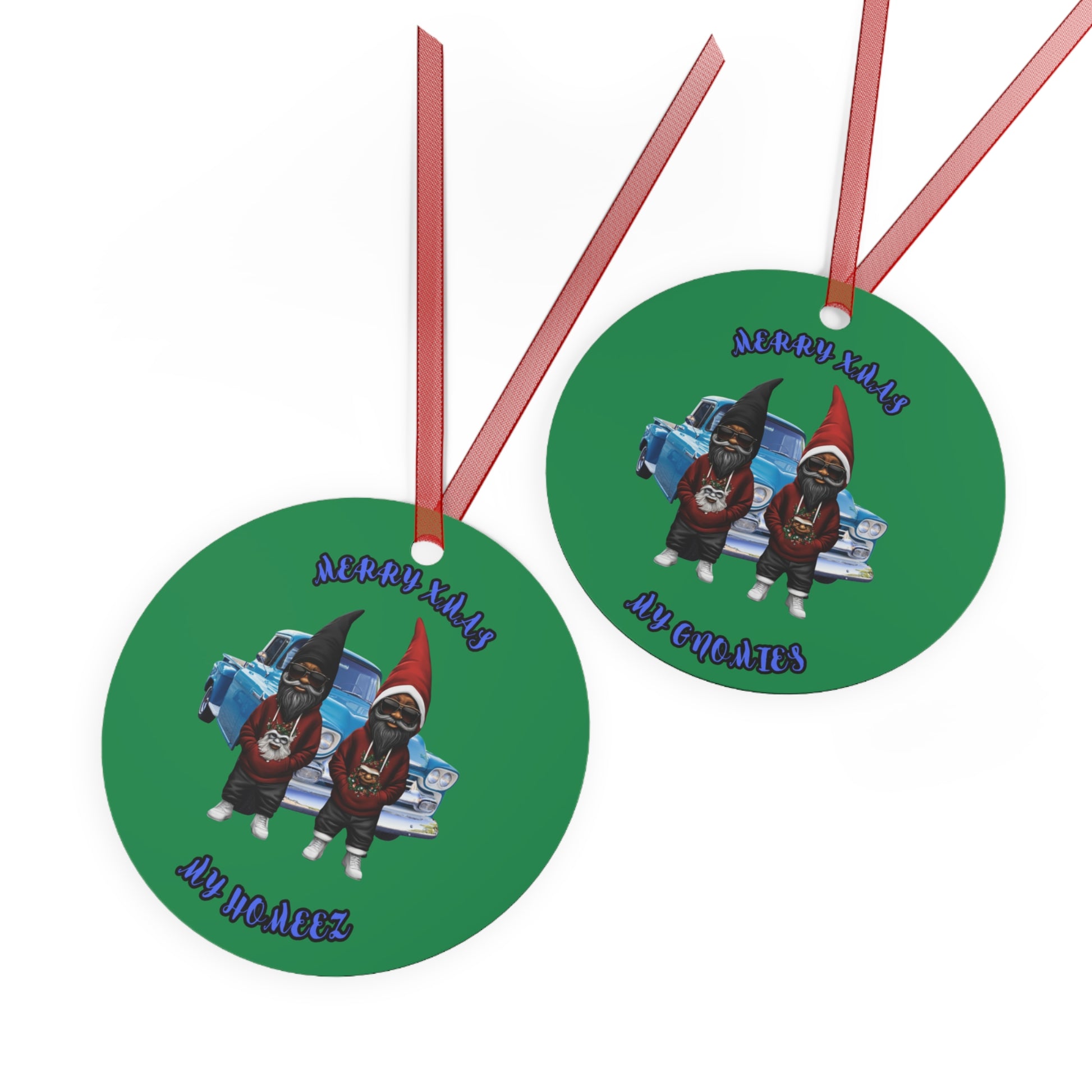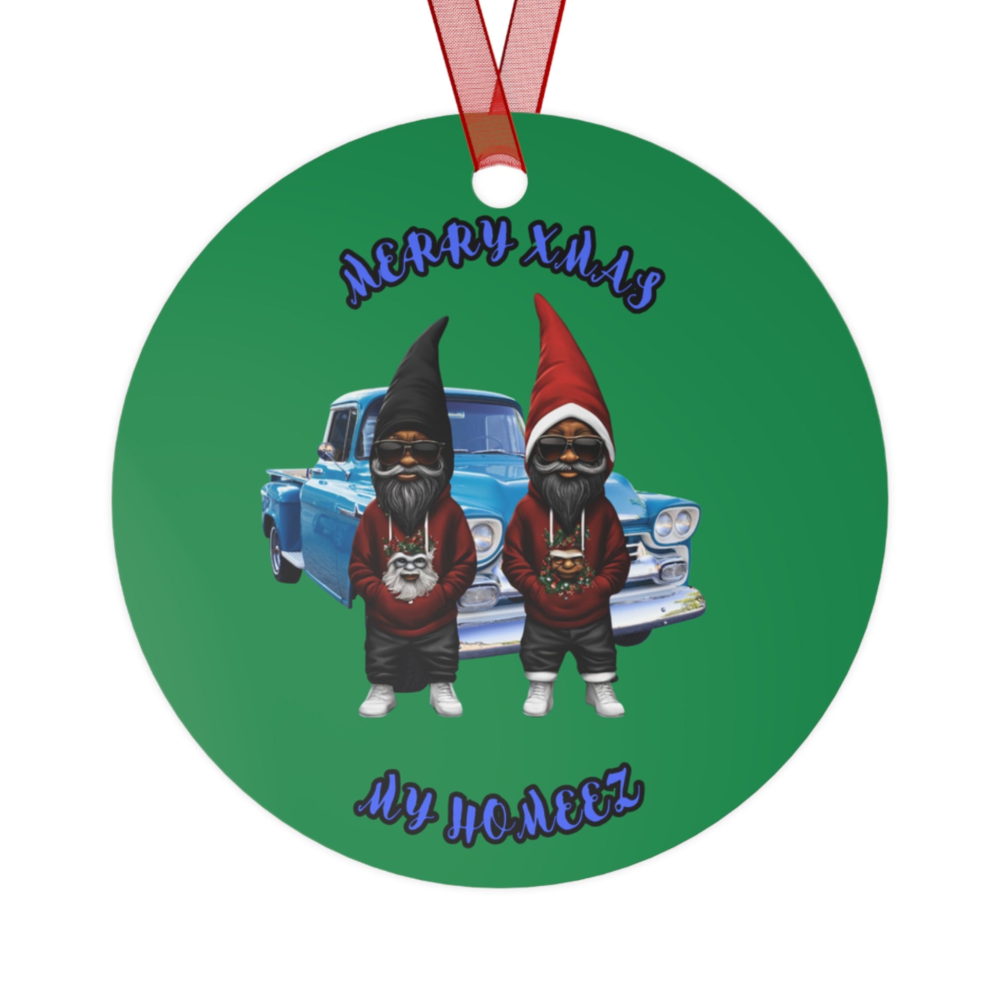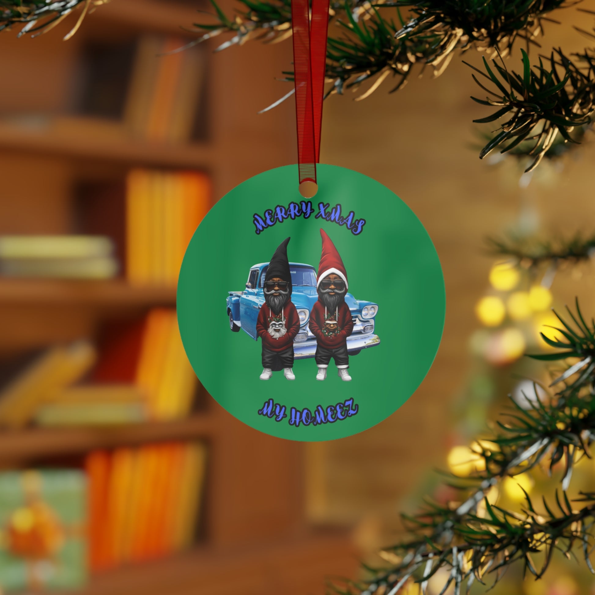 "Merry Xmas My Homeez" Green. Round Metal Ornament with Blue Text