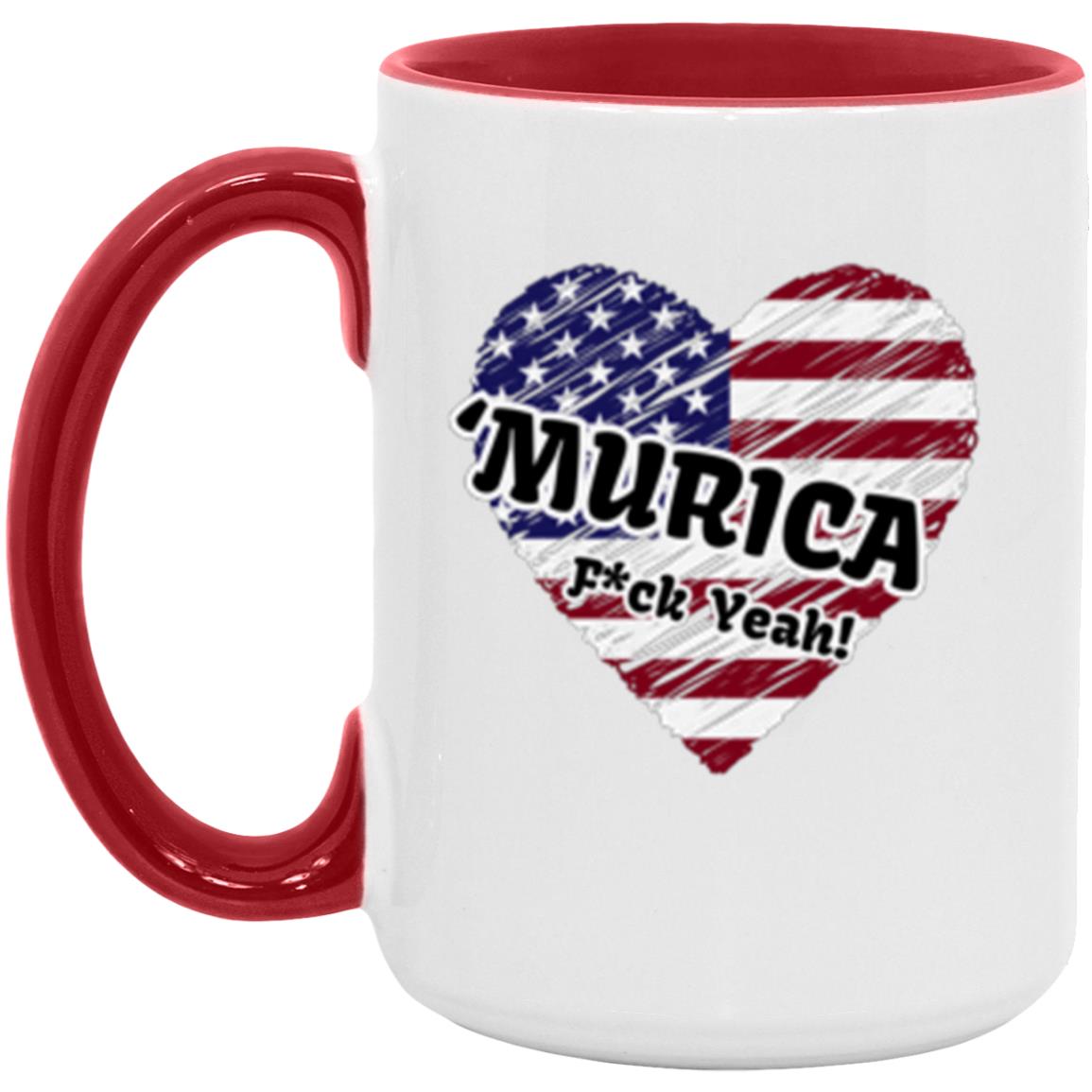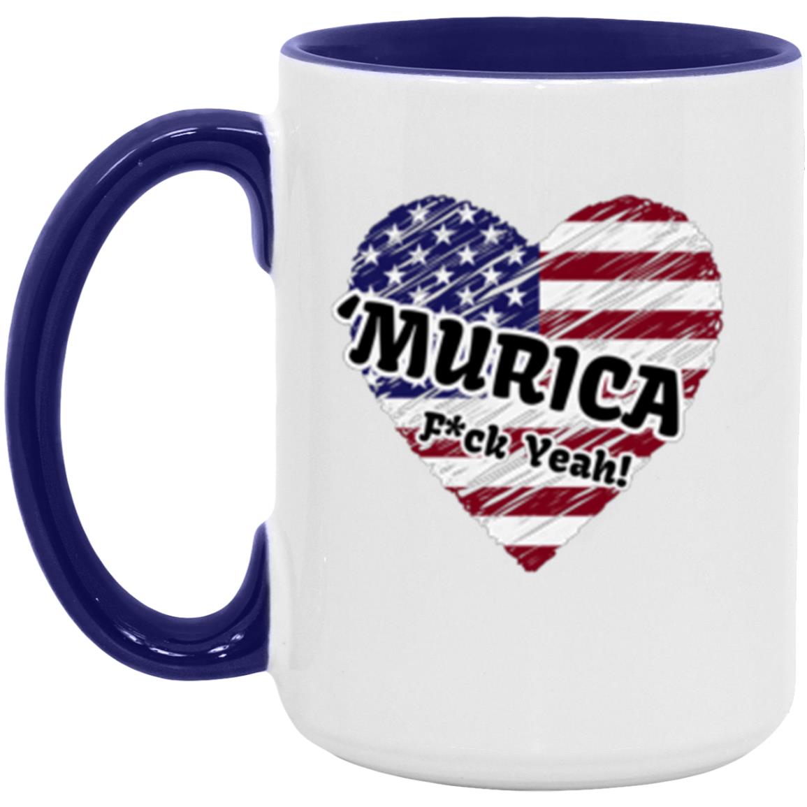 Don't be shy, represent your pride in America with our custom designed and fun 'MURICA-F*ck Yeah!" white 15 oz ceramic mug. This wrap around design comes with the choice of 3 interior and handle color accents which truly make this an awesome mug! Even though the wording has some censure, this mug is for grownups only- lol! Regardless, share your pride with fun while sipping on your favorite warm beverage. This mug makes a great gift!!!