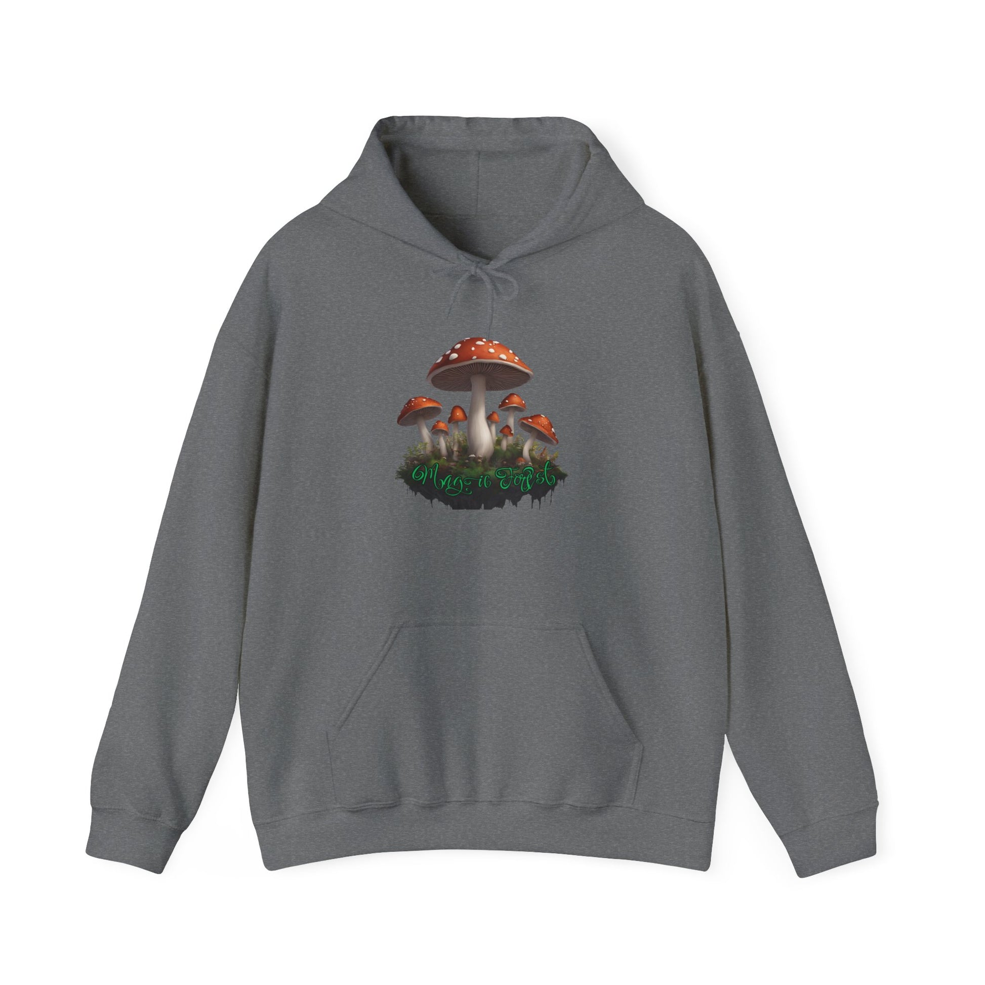 If you or someone you know, loves the look of mushrooms, get our "Magic Forest" custom designed, unisex heavy blend hoodie.  This sweatshirt is relaxation itself!  Made with a thick blend of cotton and polyester, it feels plush, soft and warm, a perfect choice for any cold day. In the front, the spacious kangaroo pocket adds daily practicality while the hood's drawstring is the same color as the base sweater for extra style points.  This item comes in 11-12 color choices depending upon the size.