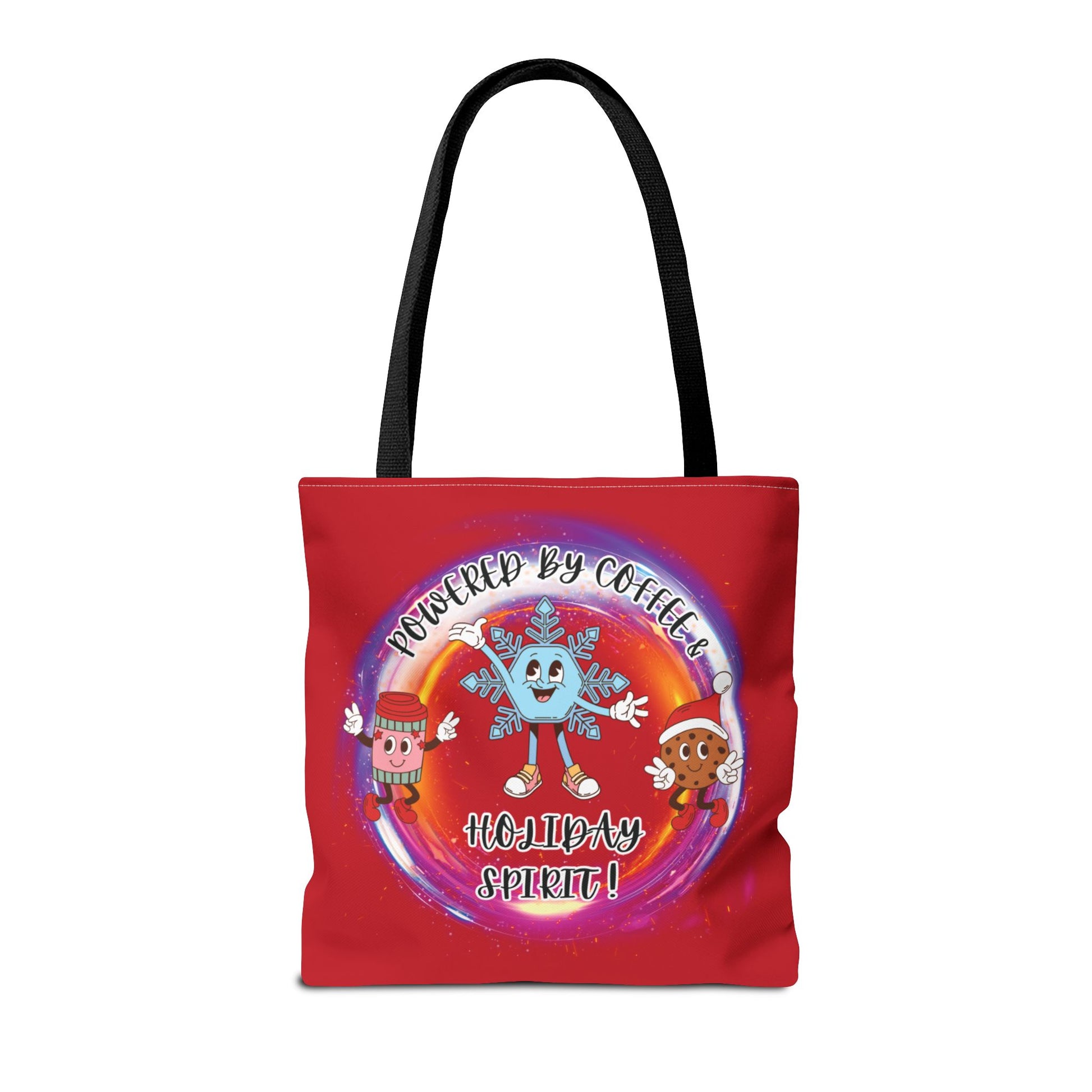 Our whimsical "Powered By Holiday Spirit and Coffee" Red Tote Bag , will help "carry you through the season style and cheer! This tote adds both functionality and style, the custom-printed "vintage cartoon" design. This double sided, tote bag comes in 3 sizes with multiple handle colors to choose from. Made with spun polyester, these bags feature double-stitched seams, cotton webbing straps, and nonwoven laminate lining for high-end durability. There are 4 handle colors to pick from (red, black, white and beige). Our festive tote bag makes a great Holiday gift for the avid shopper and coffee drinker!