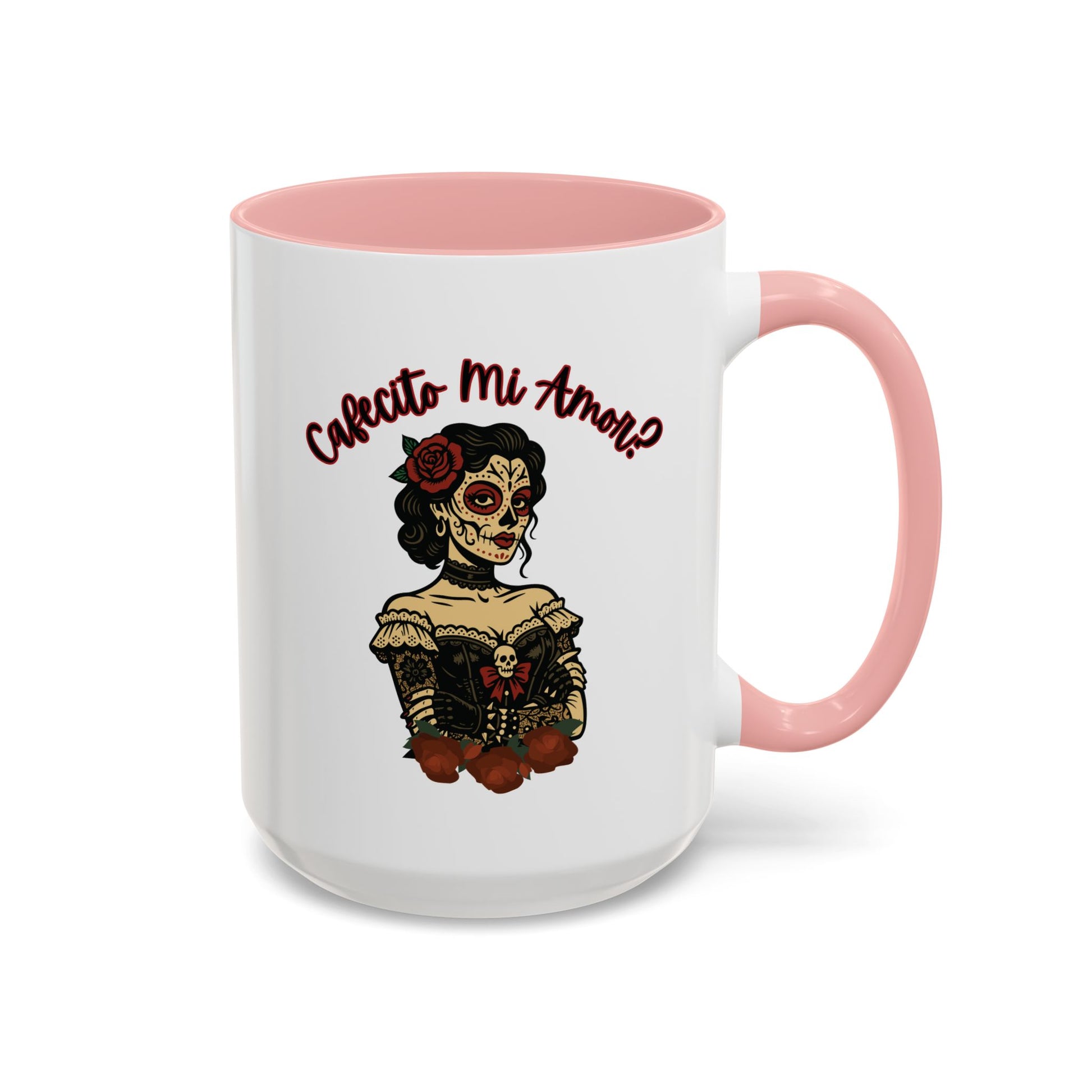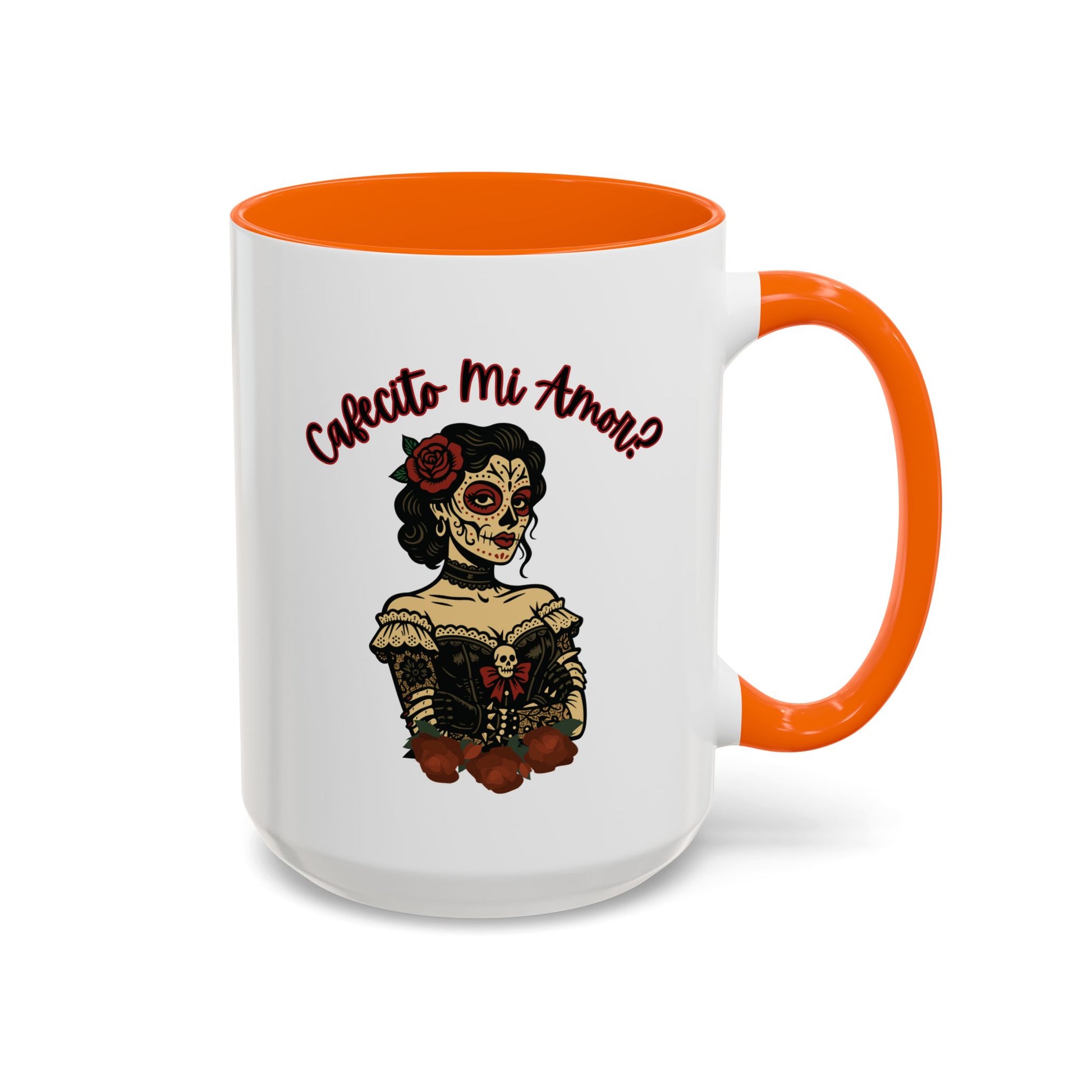 "Cafecito Mi Amor?" Sugar Skull Style , Colorful Accent, 11oz and 15oz Coffee Mug. A great Day of the Dead or Halloween Gift!