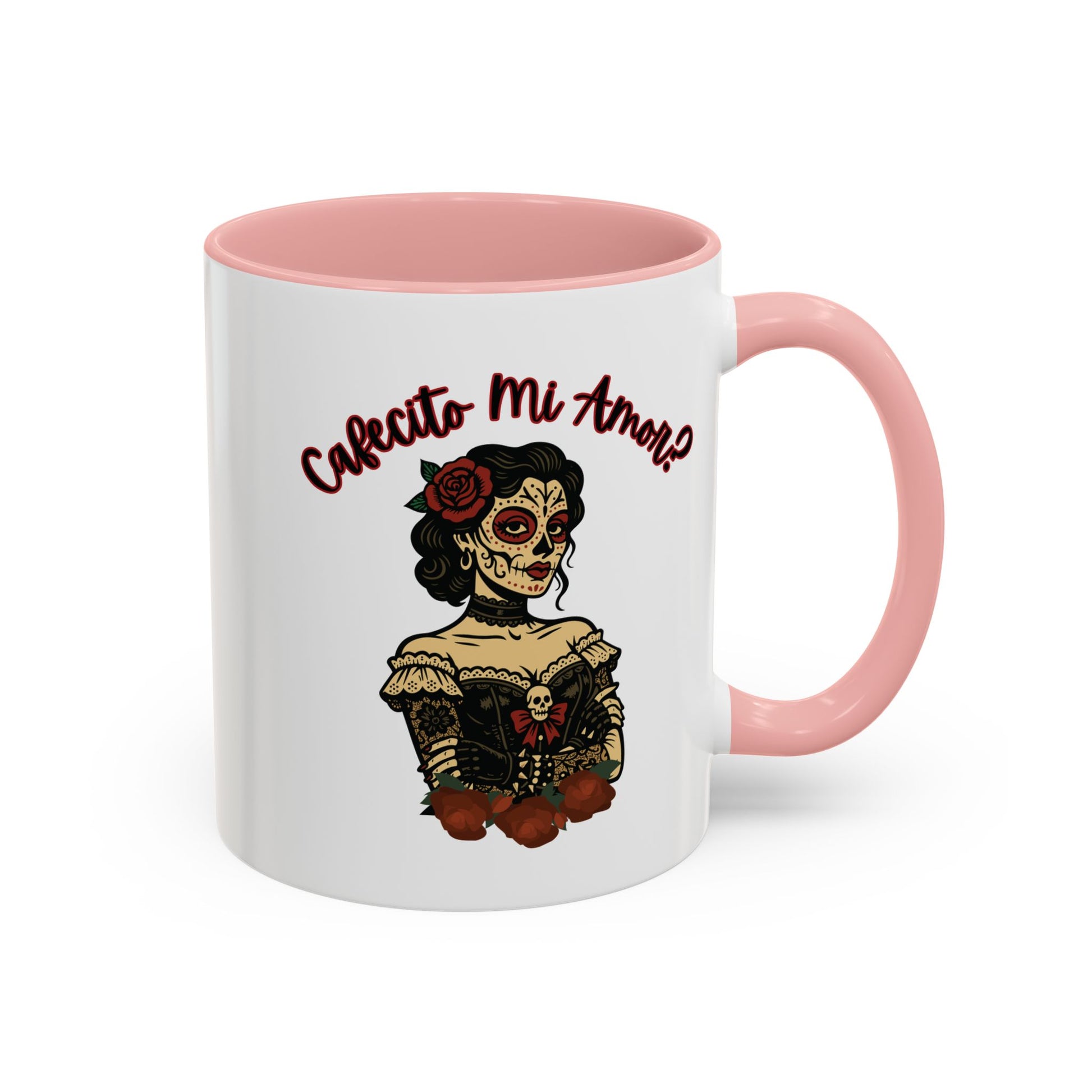 Elevate your morning routine with our stylish "Cafecito Mi Amor?", Sugar Skull style Accent Coffee Mug. Its vibrant design adds a splash of color to your daily coffee or tea ritual. Made from durable white ceramic, this mug features a glossy finish and a comfortable C-shaped handle, making every sip enjoyable. Perfect for art lovers and those who appreciate unique home décor, this mug is an ideal gift for housewarmings, birthdays, or just to treat yourself. Celebrate special occasions like Día de los Muertos with a mug that resonates with creativity and joy. This item comes in 4 different accent colors. Whether you're at home or in the office, this mug will bring a smile to your face every time you use it!