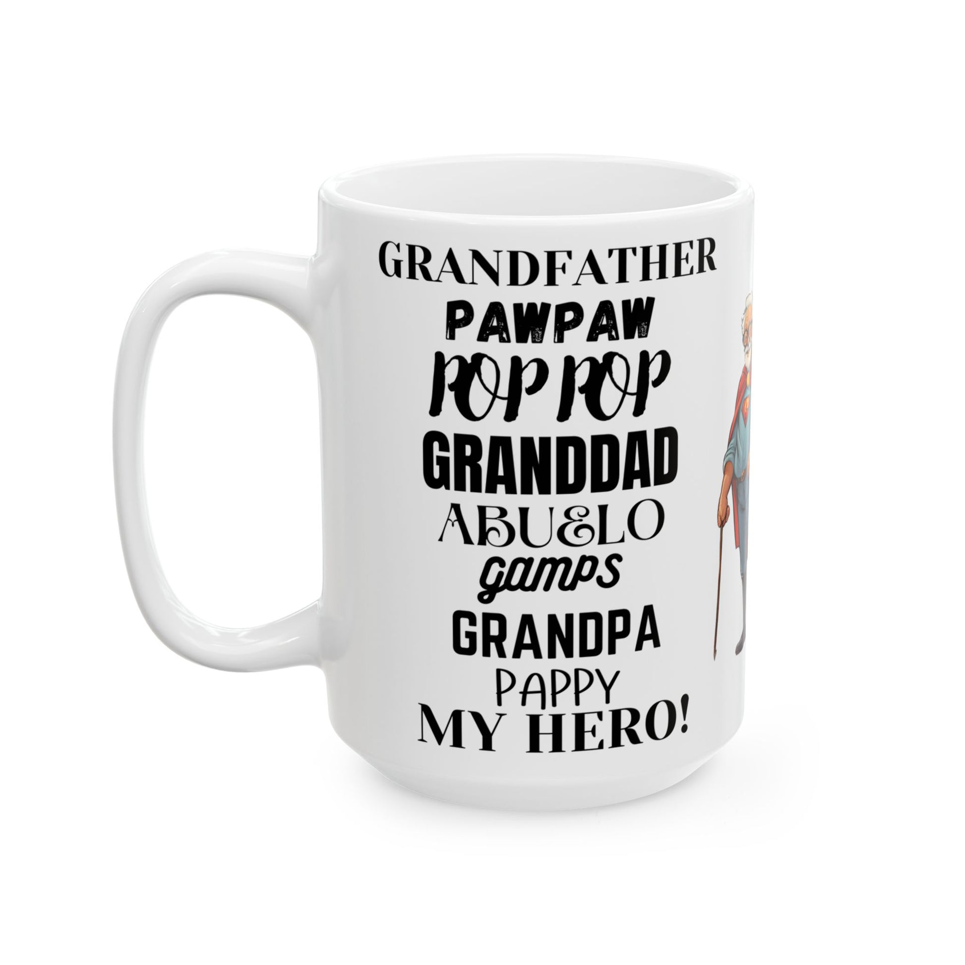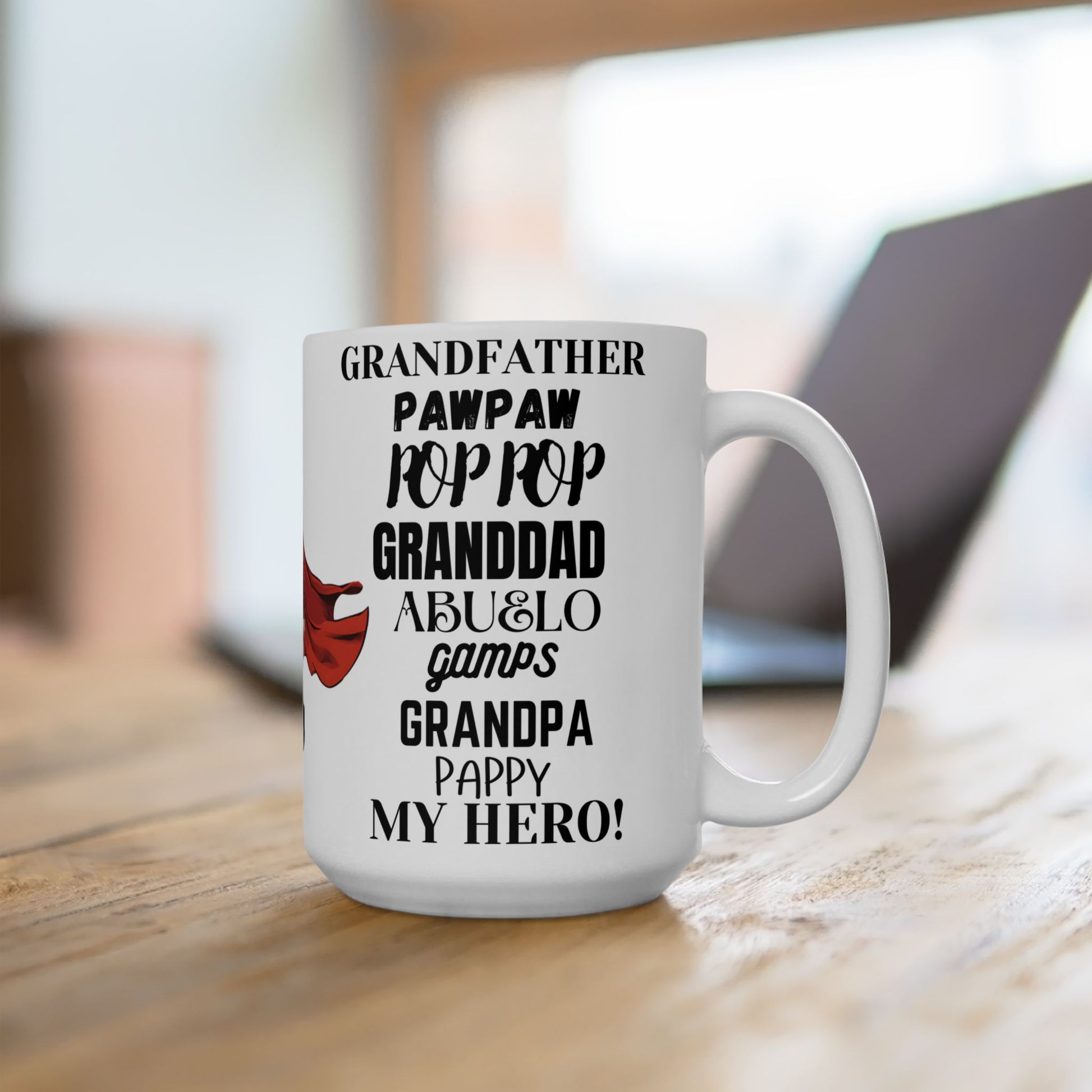 Give our custom designed mug to the man you lovingly know as Grandfather, Grandpa, Pawpaw, Abuelo...take your pick! What ever you call him -let him know he's your superhero! This is a great gift for Grandparent's Day, Birthdays, Father's Day or any day of the year. A big size (15oz) durable white ceramic mug with our custom "comic book" style design, makes this an appreciated gift to any Grandfather who truly loves his morning coffee or tea.