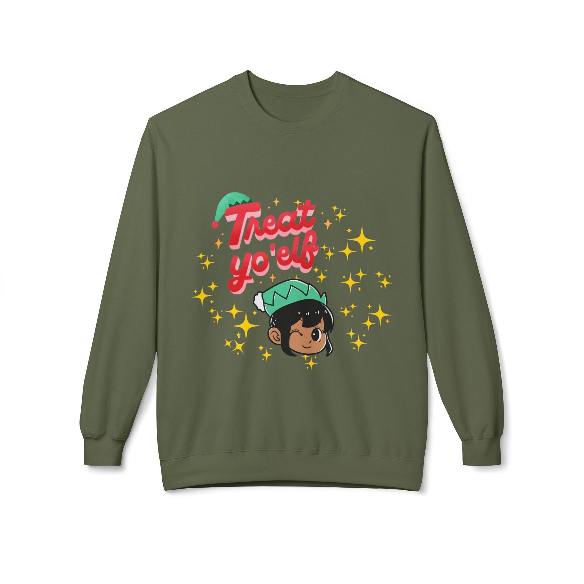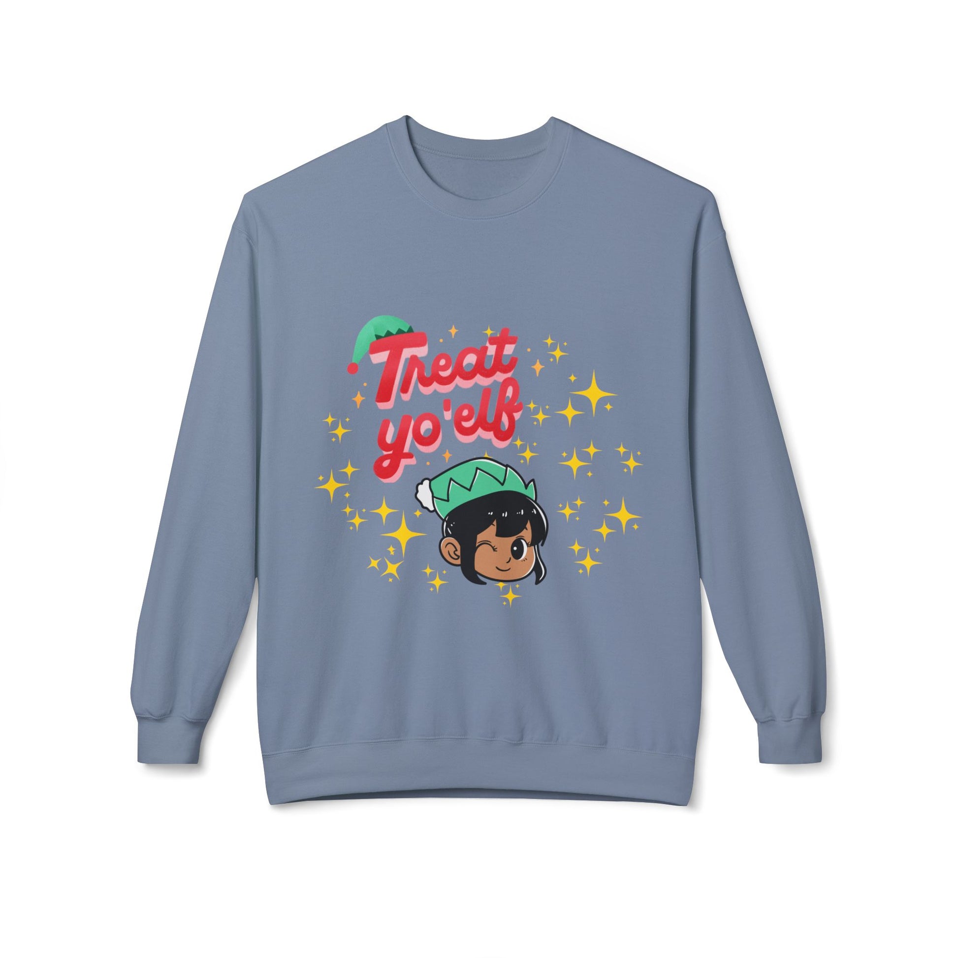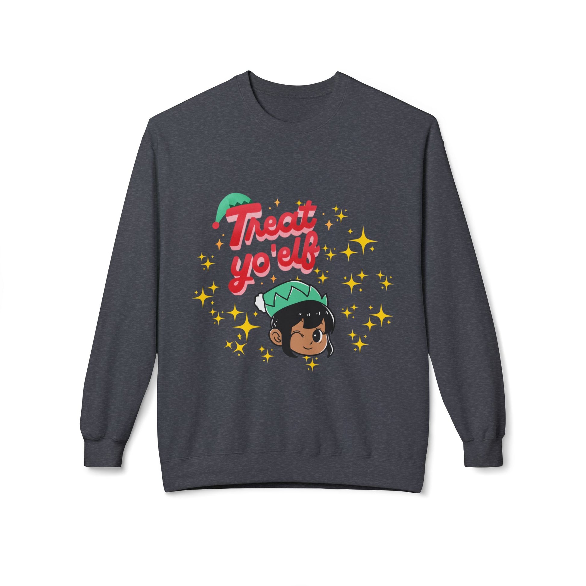 Curl into cozy holiday mischief with our custom designed, midweight fleece, crewneck sweatshirt adorned with a cheeky "elf emoji" illustration and the playful phrase “Treat yo’ elf.” The soft, medium-heavy fabric and dropped-shoulder cut give a lived-in comfort that sits perfectly over jeans or lounge pants. Sparkling star accents and a warm, hand-drawn elf bring a gentle, joyful vibe — a sweater that feels like a laugh shared over hot cocoa and twinkling lights. Wear it to low-key holiday parties, cookie-baking nights, or while wrapping presents; it layers easily under a coat and stays comfortable whether you’re bustling through markets or relaxing at home. This particular item comes in 9 colors. Happy Holidays!