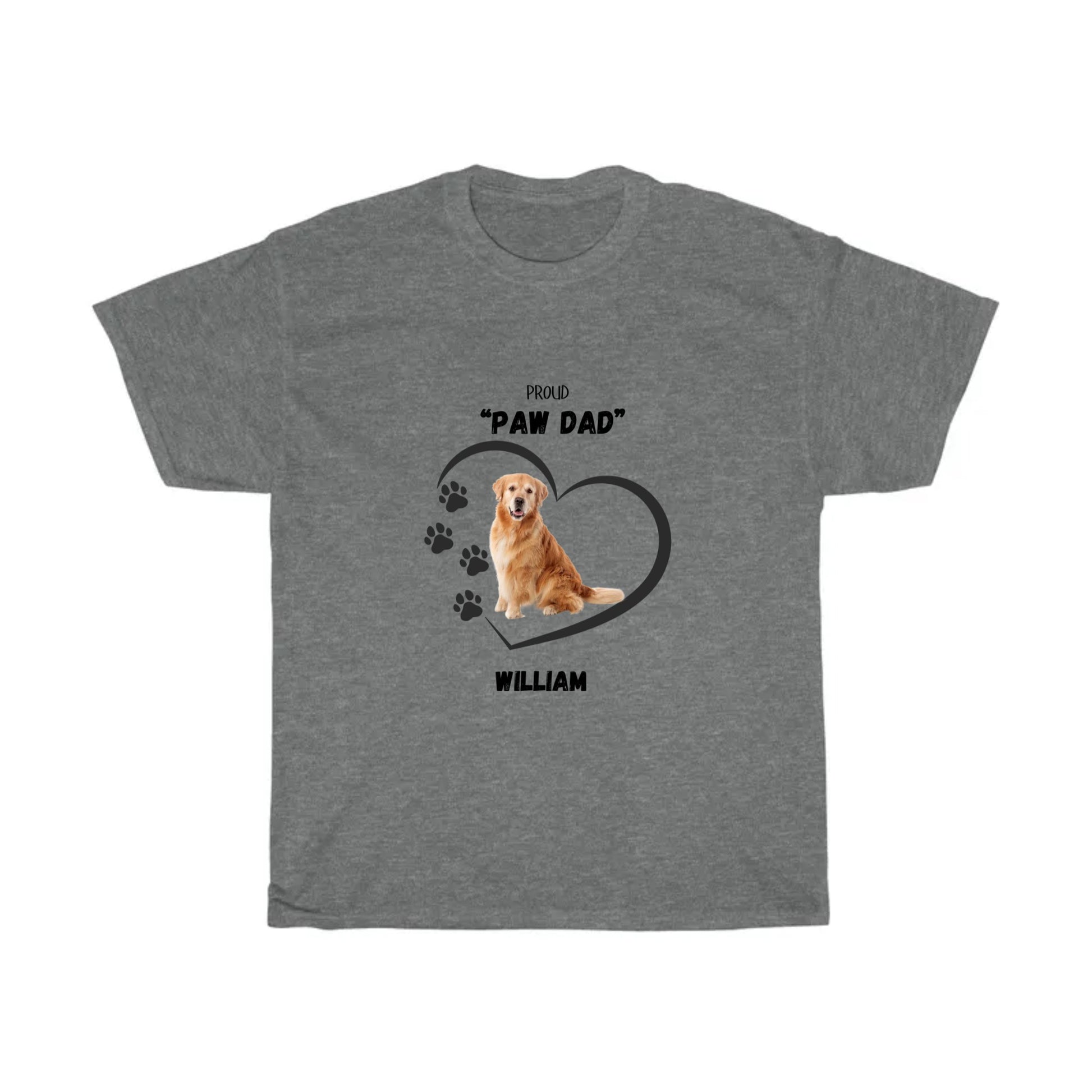 Get this custom designed "PAW DAD" Unisex sized Heavy Cotton T-shirt for that special someone who is a true "Dad" to his own Golden Retriever. This particular shirt is part of a collection featuring a variety of the most common breeds of "Man's Best Friend!" Add the dog's name in the text box before purchasing to customize the shirt.