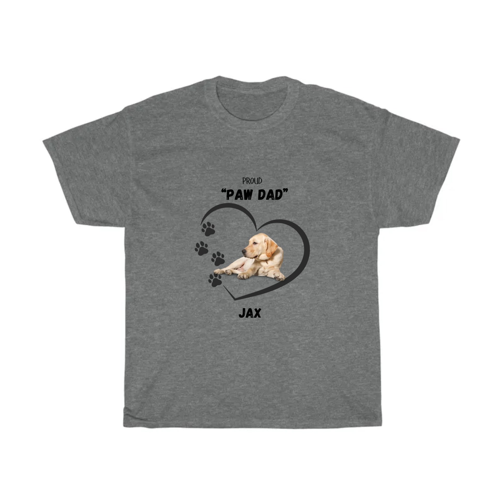 Get this custom designed "PAW DAD" Unisex sized Heavy Cotton T-shirt for that special someone who is a true "Dad" to his own Golden Labrador. This particular shirt is part of a collection featuring a variety of the most common breeds of "Man's Best Friend!" Add the dog's name in the text box before purchasing to customize the shirt.