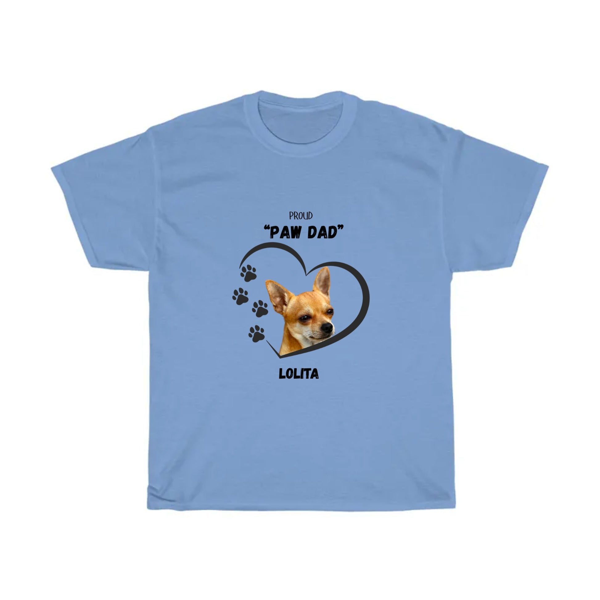 Get this custom designed "PAW DAD" Personalized Unisex sized Heavy Cotton T-shirt for that special someone who is a true "Dad" to his own Chihuahua. This particular shirt is part of a collection featuring a variety of the most common breeds of "Man's Best Friend!" Add the dog's name in the text box before purchasing to customize the shirt.