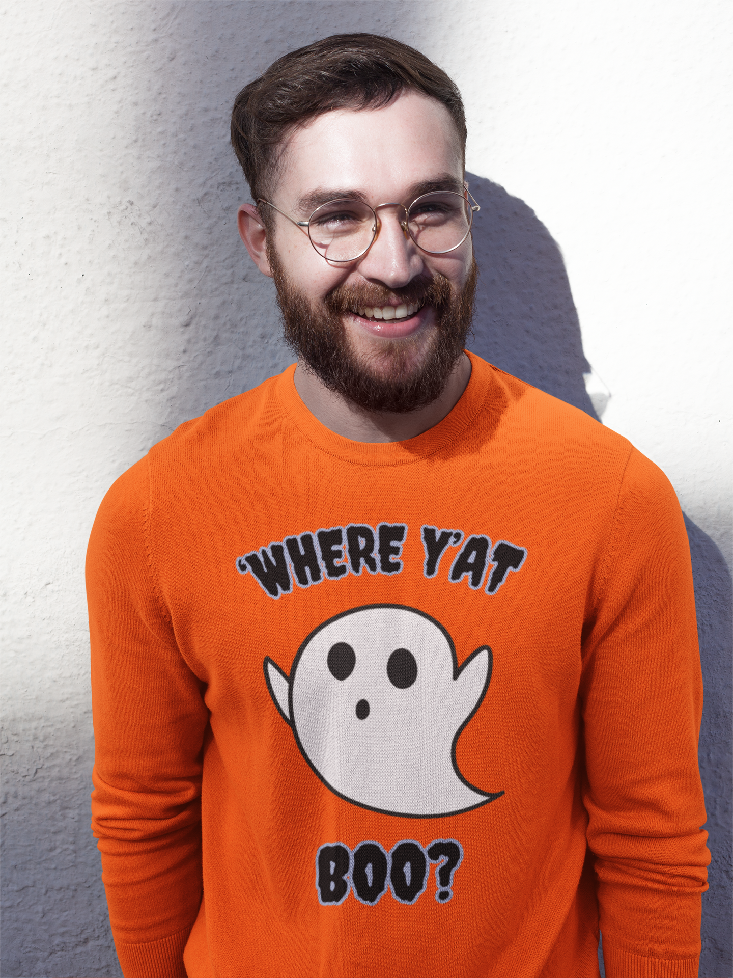 Our custom designed "Where Y'AT", Unisex Pullover sweatshirt is perfect for Halloween season especially if your from South Louisiana! Our cotton blend unisex sweatshirt has a cute l'il ghostie with a phrase that is all too common among folks from that neck of the woods! This sweatshirt comes with black wording outlined with gray and 6 different colors to pick from. Check out our store for a slightly different version featuring white text. Happy Halloween!