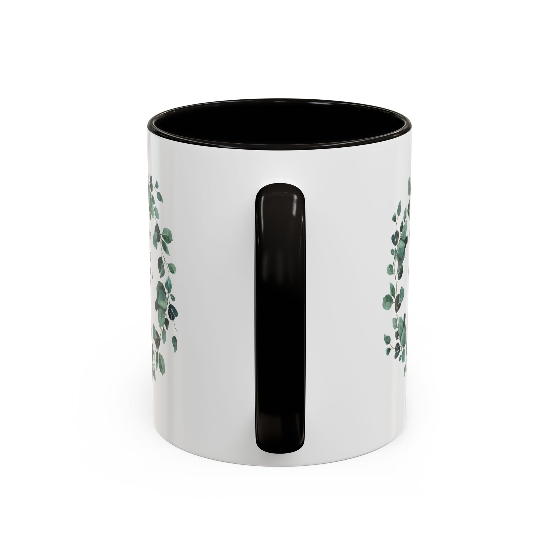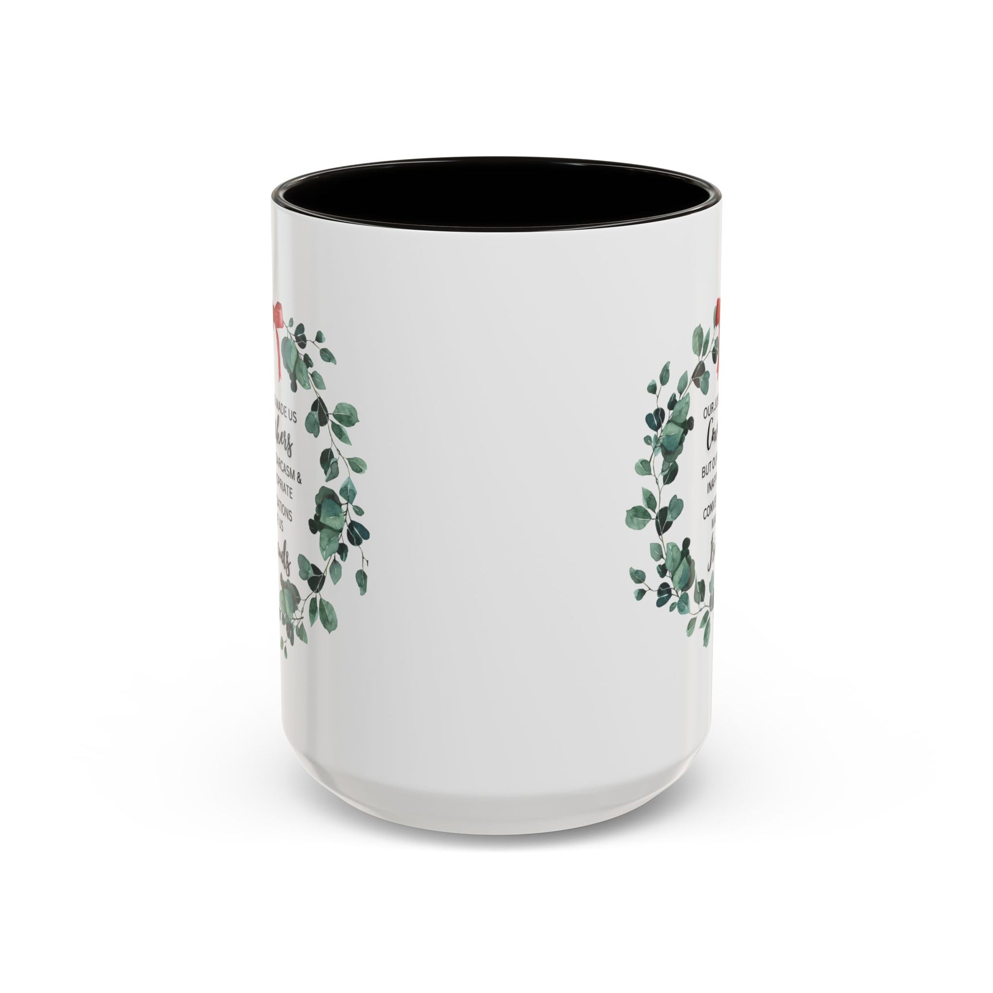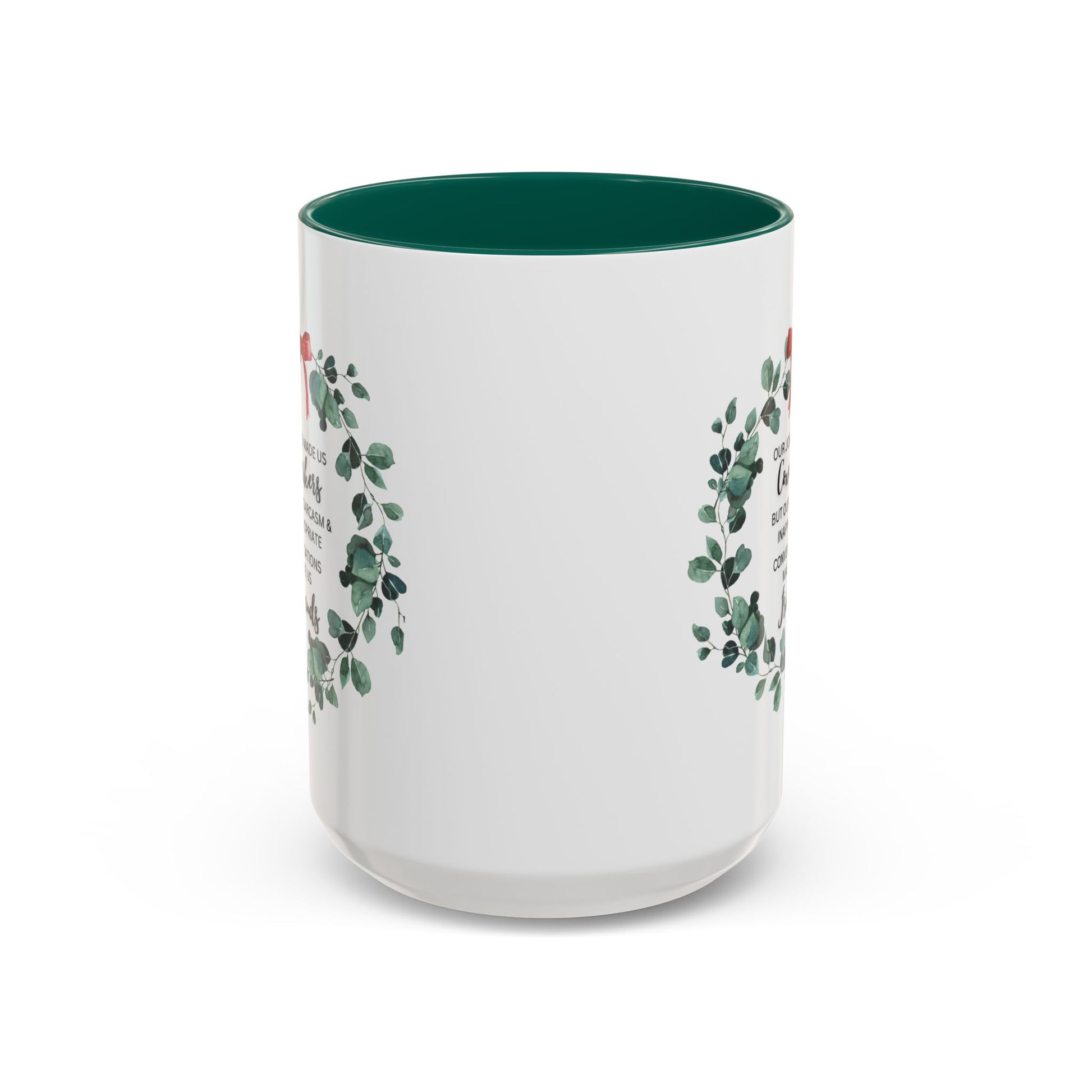 White Ceramic with Colorful Accents, Coffee Mug — “Our Jobs Made Us Coworkers…” Holiday Eucalyptus Wreath Design,11oz