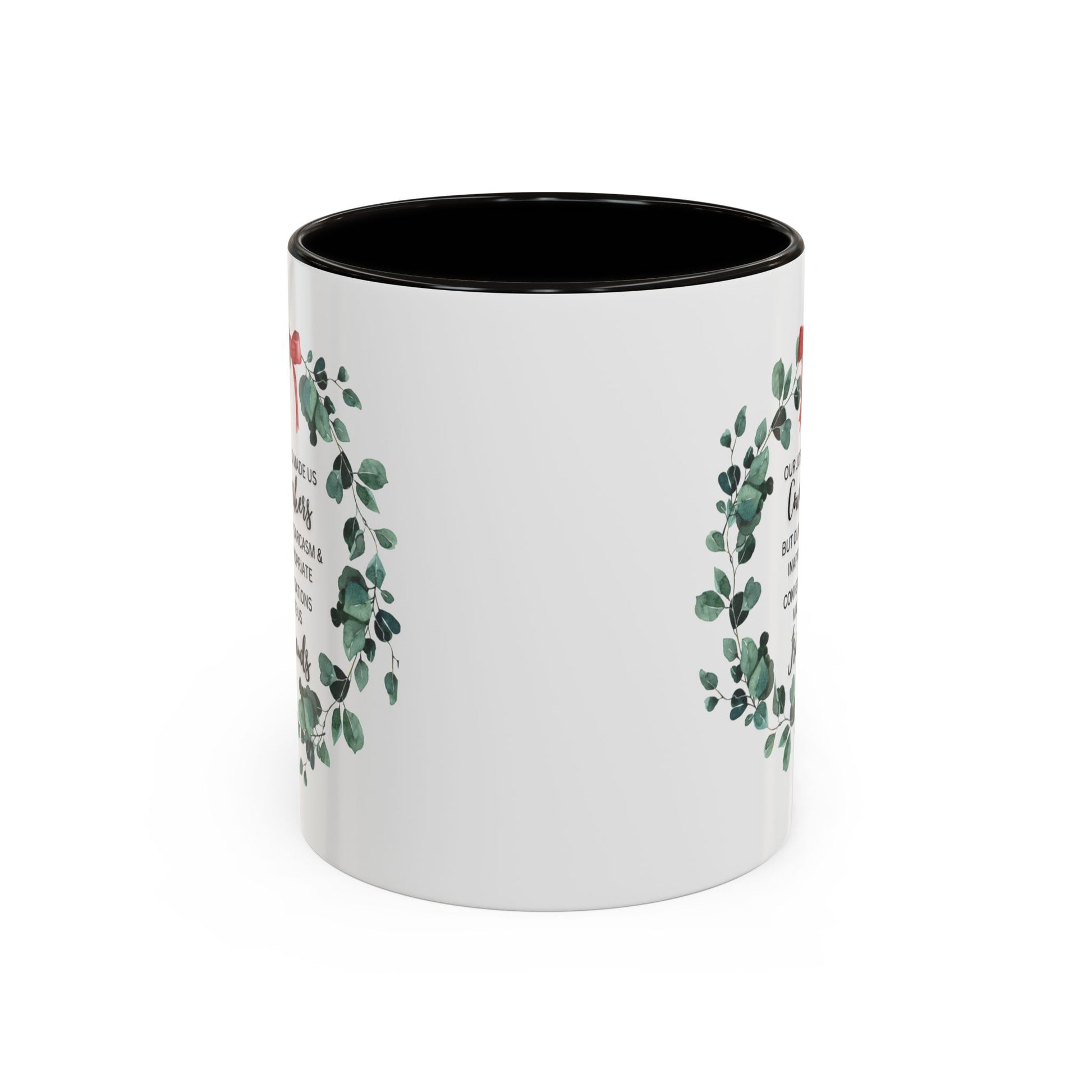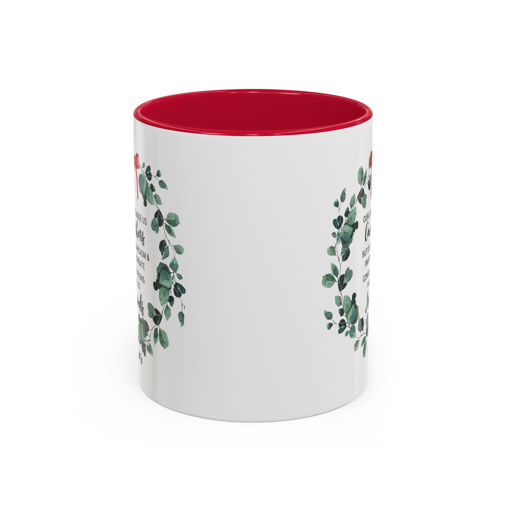 Our bright, glossy "Our Jobs Made Us Coworkers.." white ceramic mug with colorful accents, brings warmth and personality to every coffee break. The white exterior showcases a delicate eucalyptus wreath accented with a small red bow and a cheeky, handwritten-style sentiment at the center — a quiet wink to coworkers who’ve become friends. The handle and interior come in a rich accent color for a cheerful pop that ties the whole design together. Whether it’s the first sip of the morning or a shared laugh at the office, this mug holds both beverage and memory with equal grace. This particular festive mug comes in 3 different accent colors. Merry Christmas!