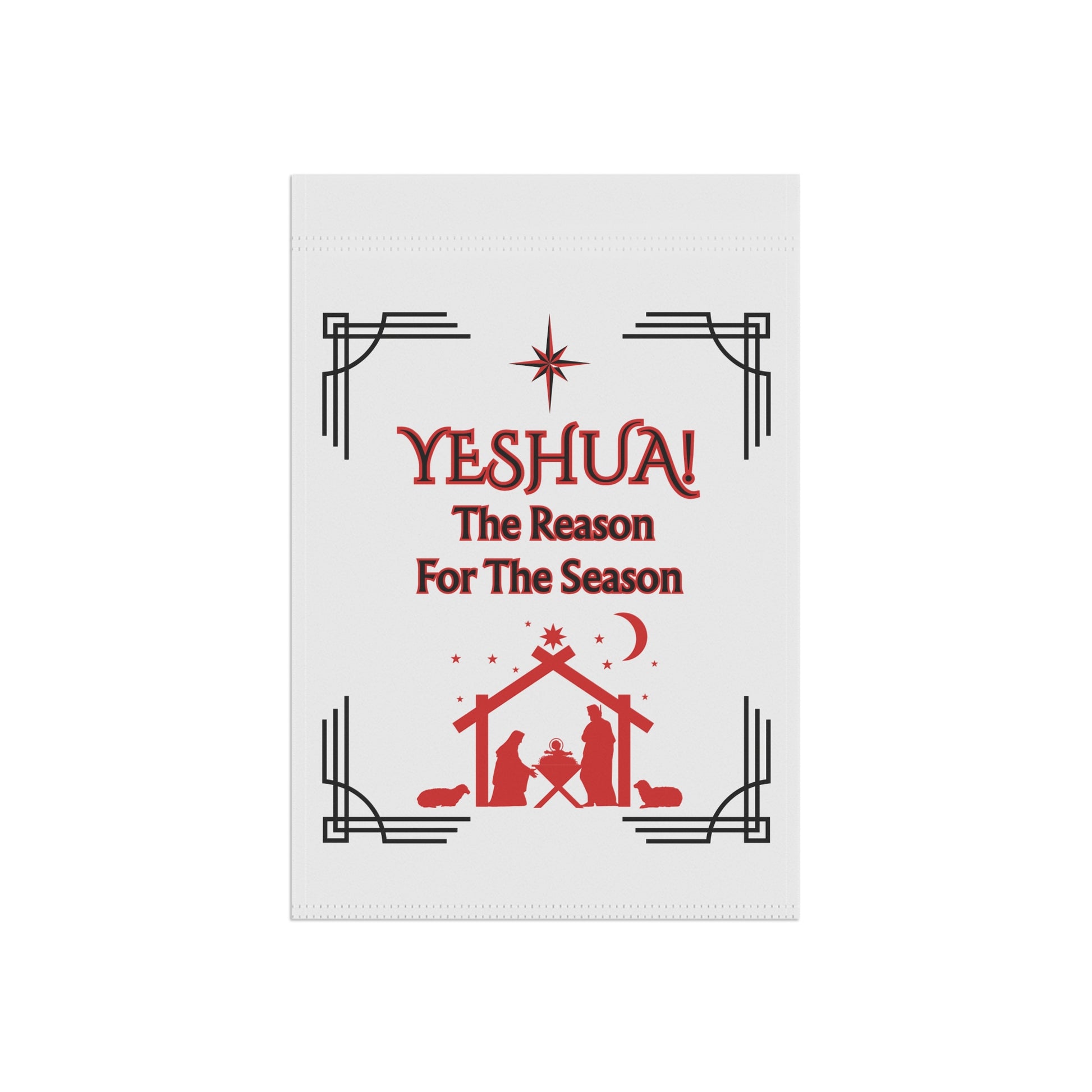Our custom designed heartfelt garden flag that speaks to the quiet wonder of the season. Clean white poplin canvas lets the deep crimson nativity design stand out: the word “YESHUA!” crowns a simple manger scene framed by tasteful art-deco corner accents and a guiding star. Lightweight and double-sided, this banner flutters on a standard garden pole, bringing a subtle, reverent message to porches, pathways, and garden beds. It feels warm without being loud — a gentle reminder of faith and the story behind winter gatherings, meant to be seen up close by neighbors and guests who walk the yard on crisp evenings. Hang it among your evergreens or beside a wreath to add a contemplative touch to holiday décor. It pairs well with rustic lanterns, simple wooden signs, and natural greenery. Materials and finish keep the image bright through repeated viewings, while the top sleeve slips easily onto most garden flag poles (pole and hooks sold separately). BTW, There is also a larger "House Banner" with the same color and design in our store. Happy Holidays!
