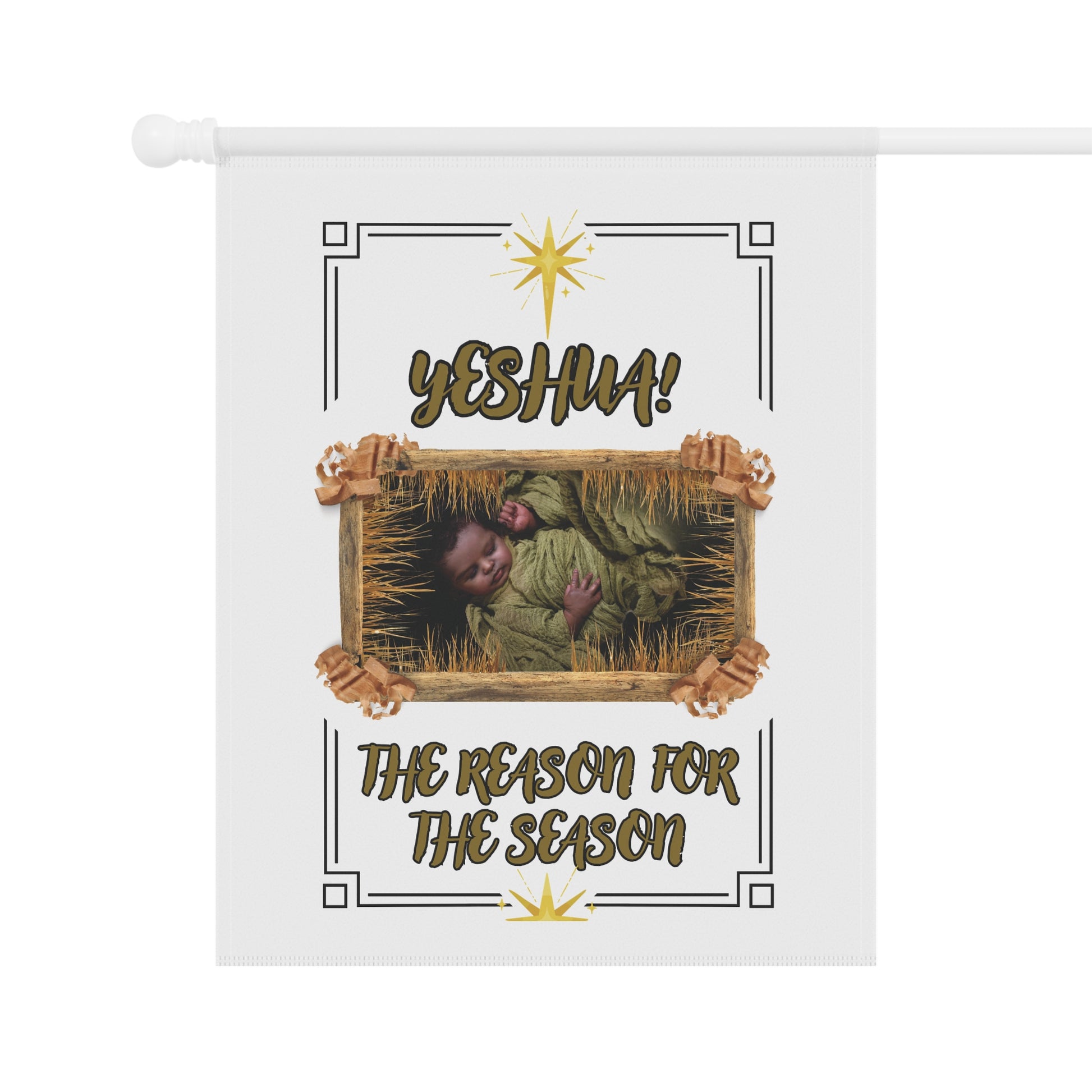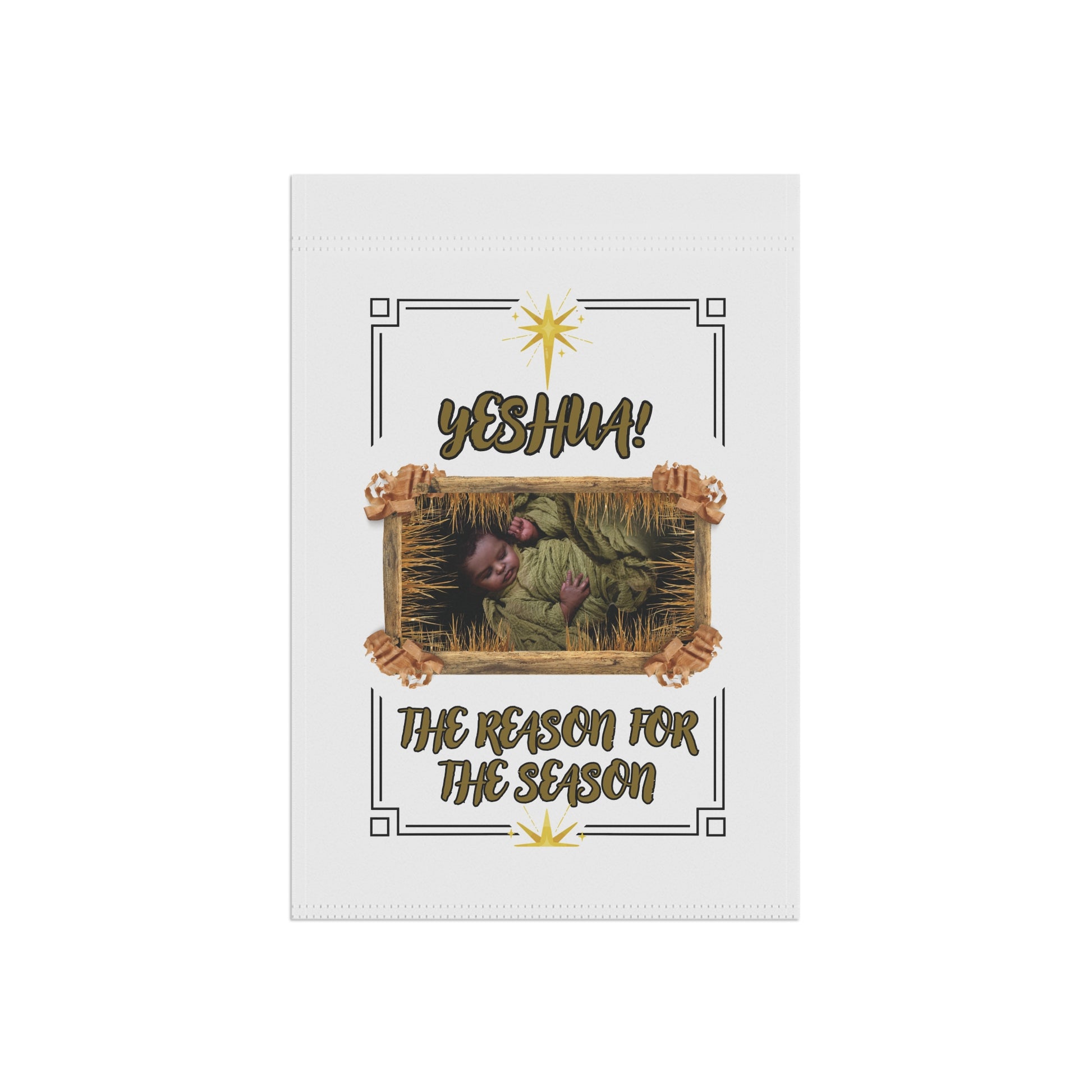 "Yeshua! The Reason for the Season" Featuring The Baby Savior In A Wooden Manger. A Beautiful Decorative Garden Flag For Xmas!-White